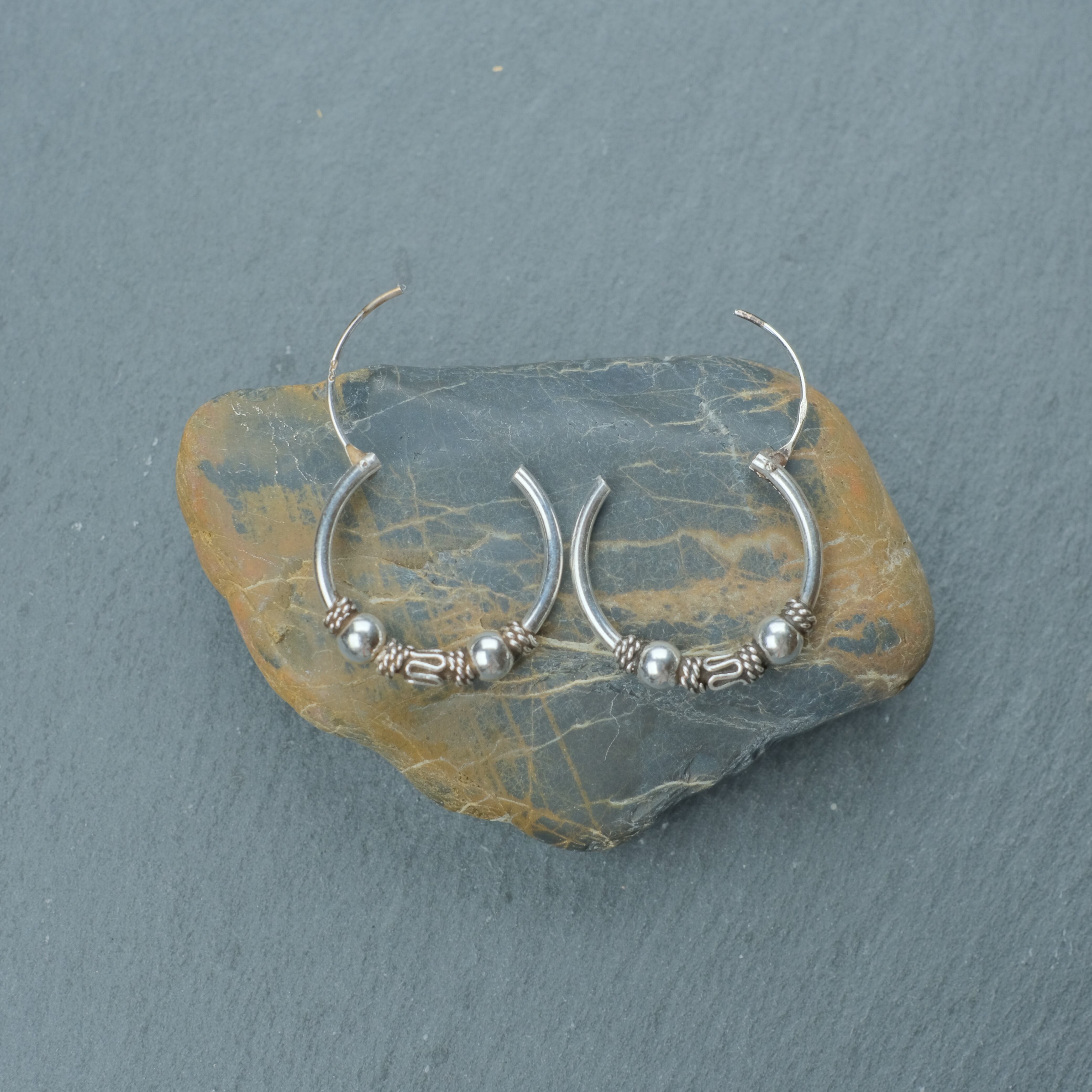 民族系のデザインで雰囲気の良いシルバーフープピアスになります。