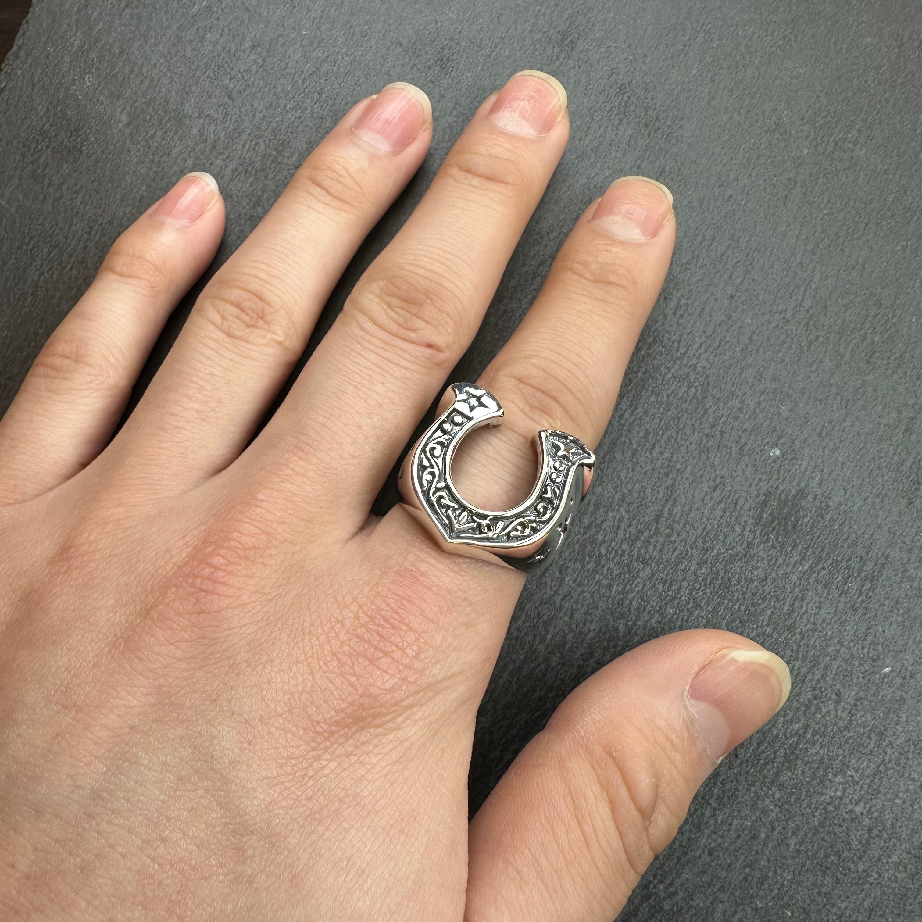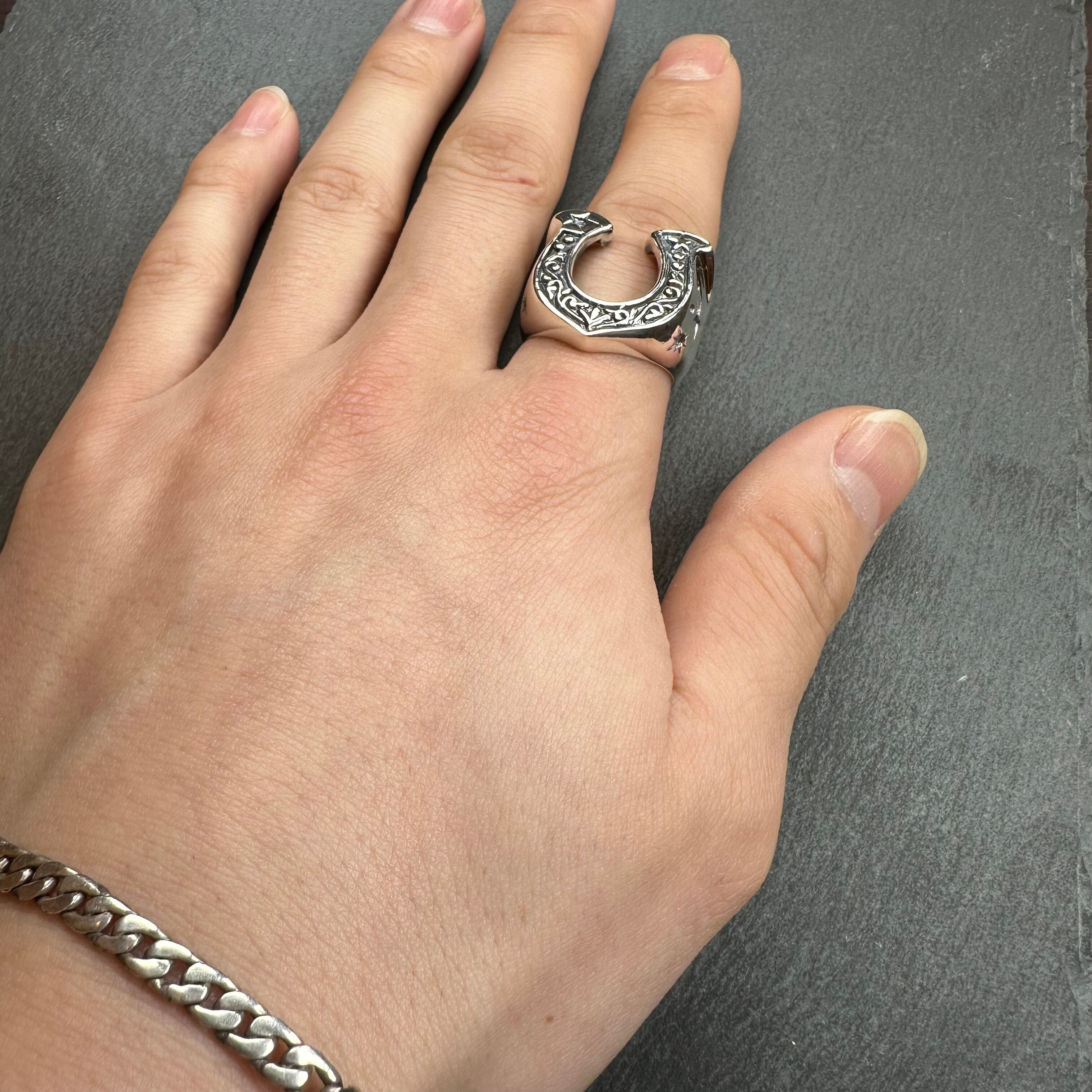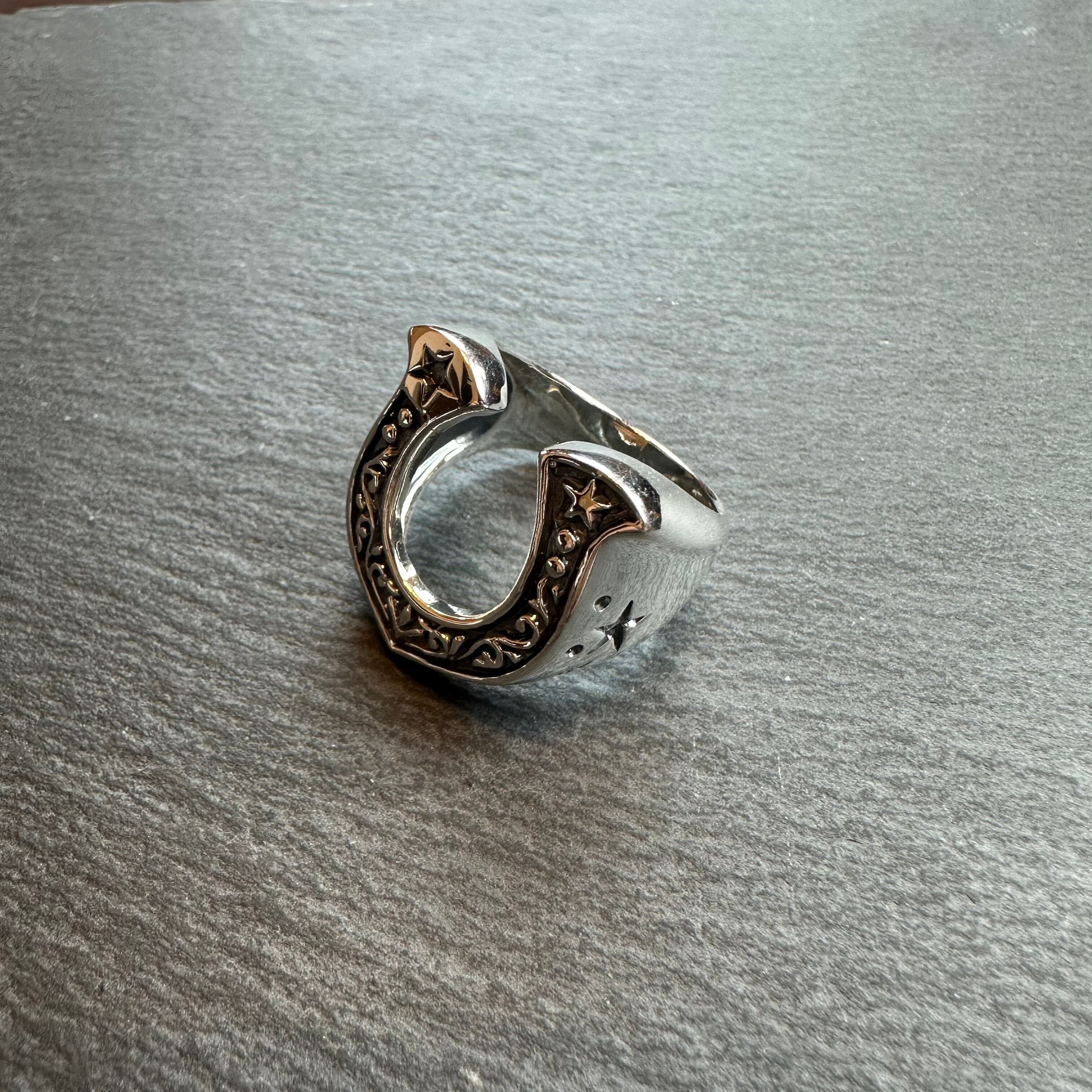 ホースシューデザインのシルバーリングになります。サイドにも彫りデザインが施されており、小洒落た逸品になります。