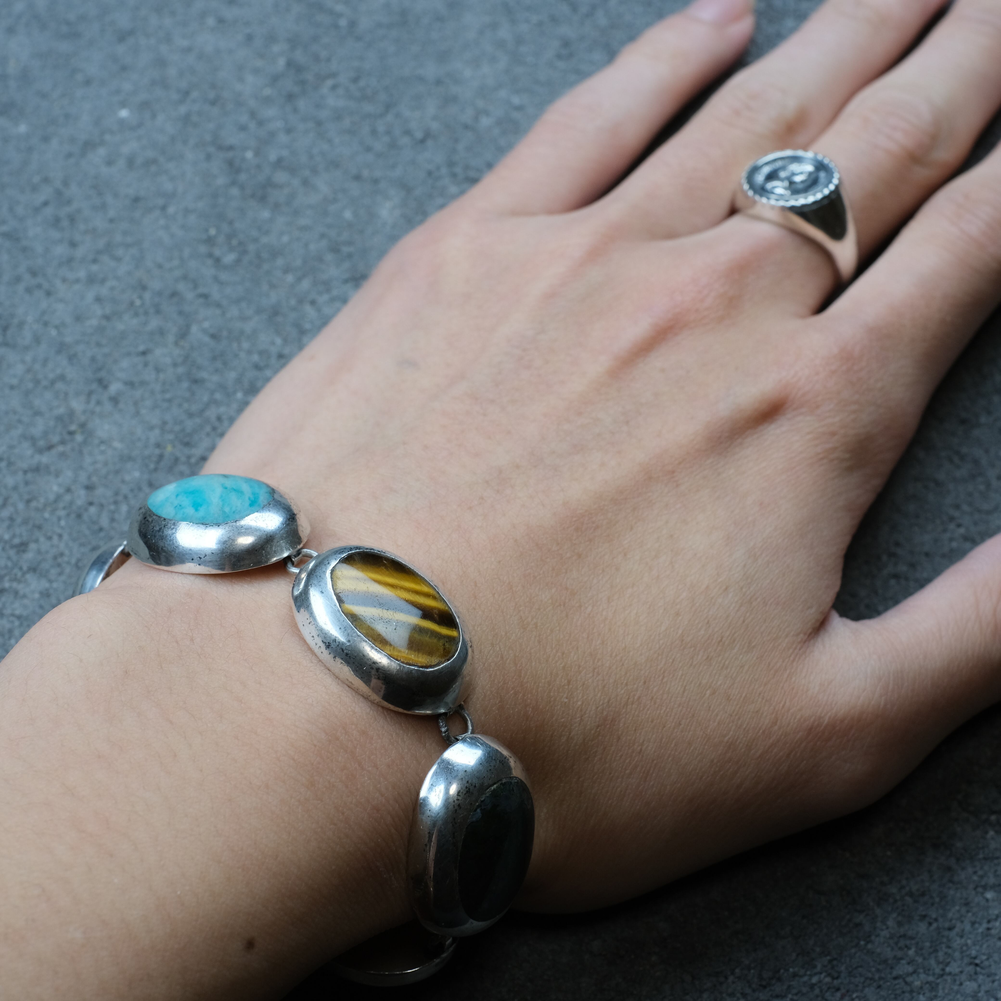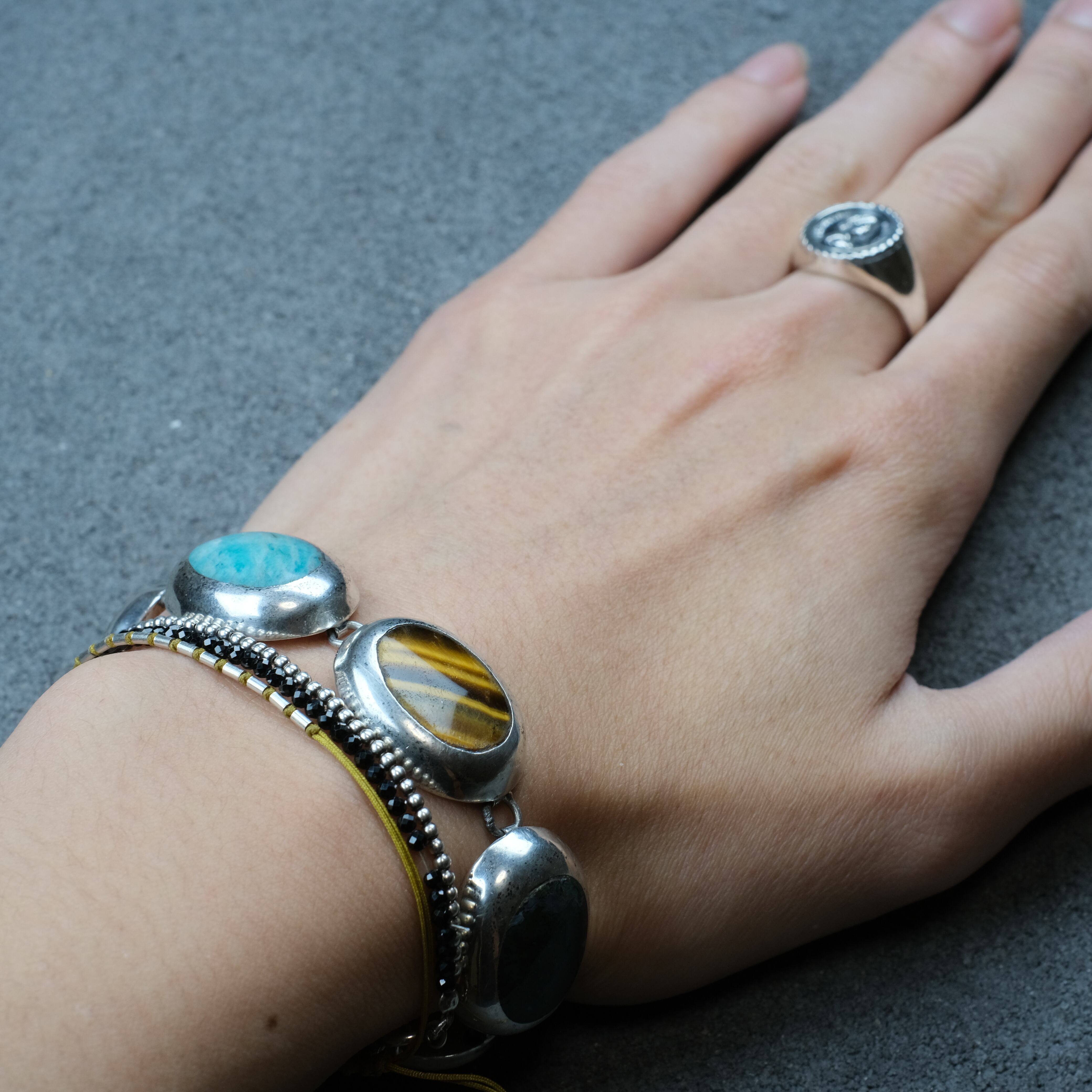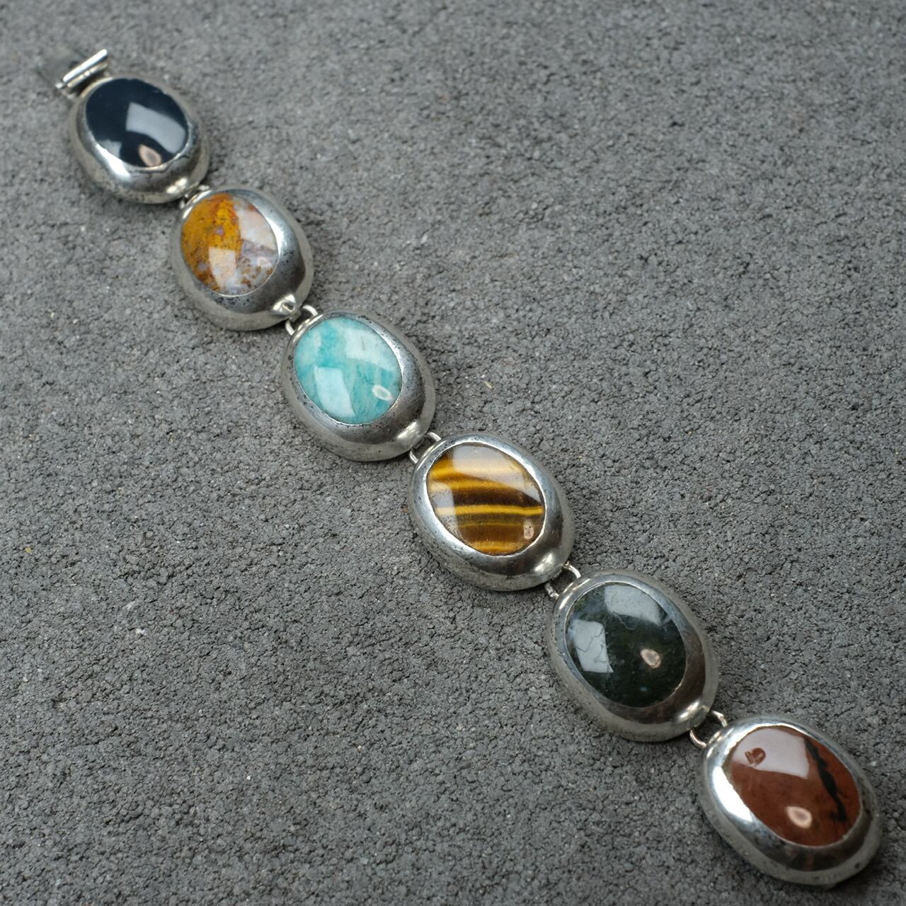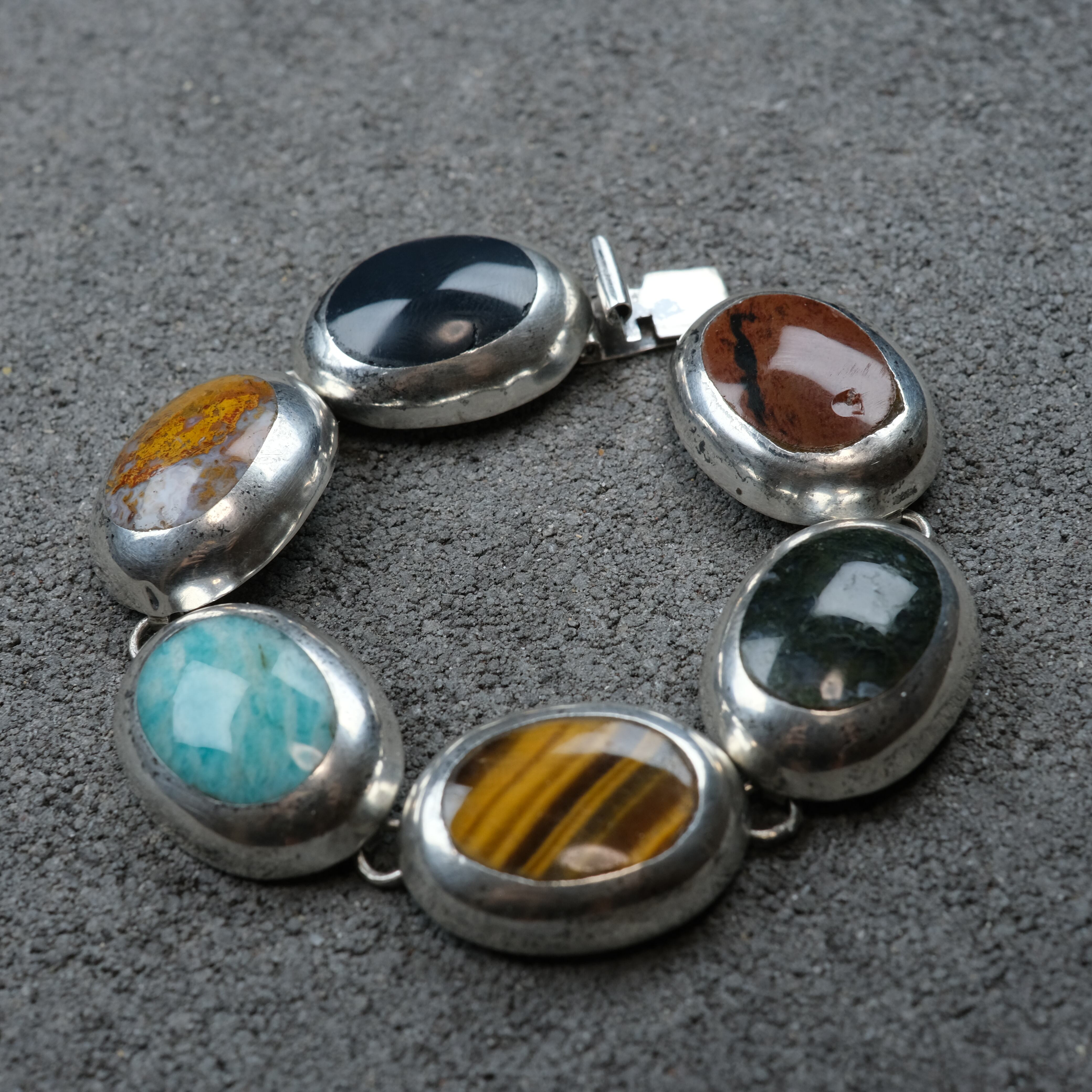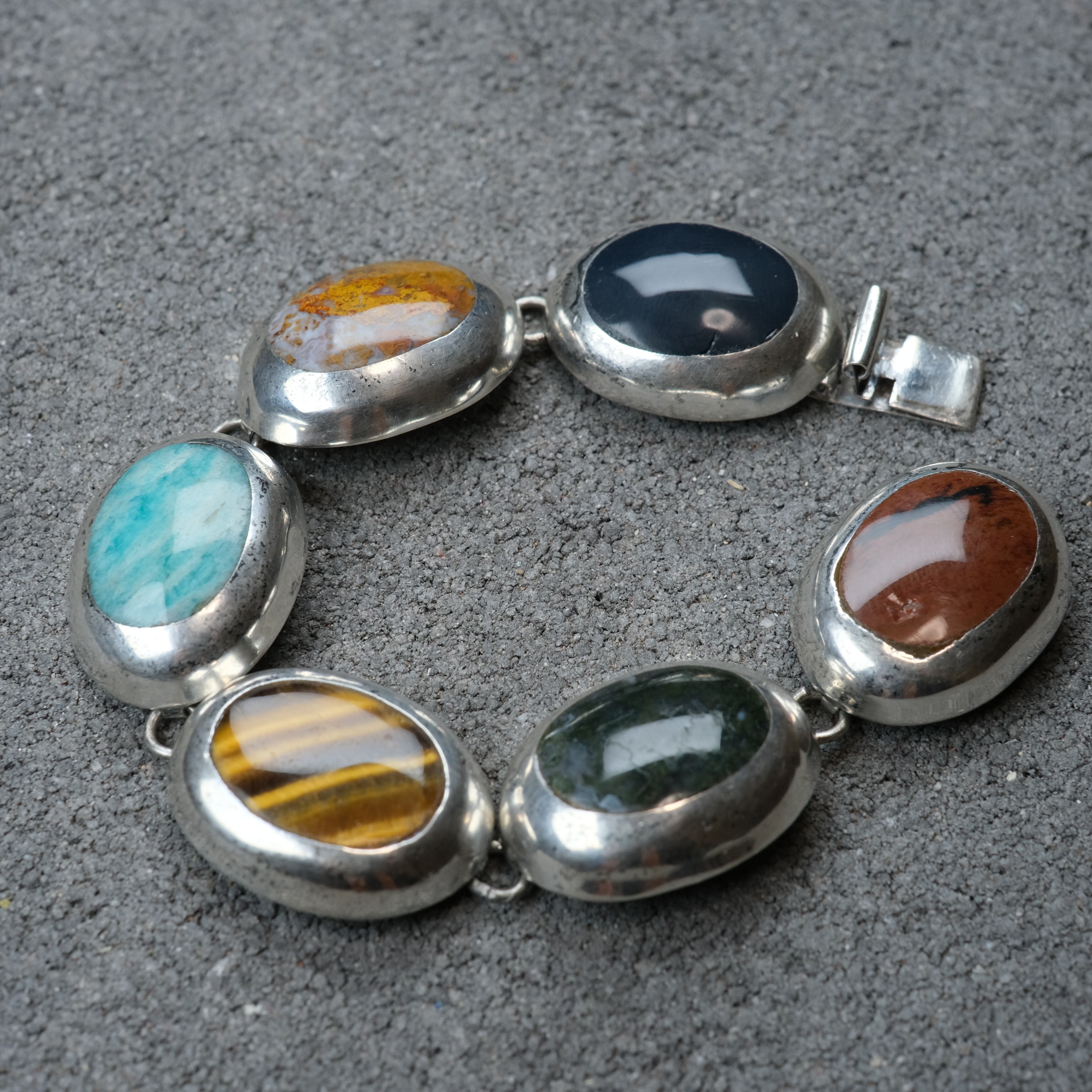 タイガーアイやオニキスなどの大きなストーンが、6つ並んだシルバーブレスレットになります。