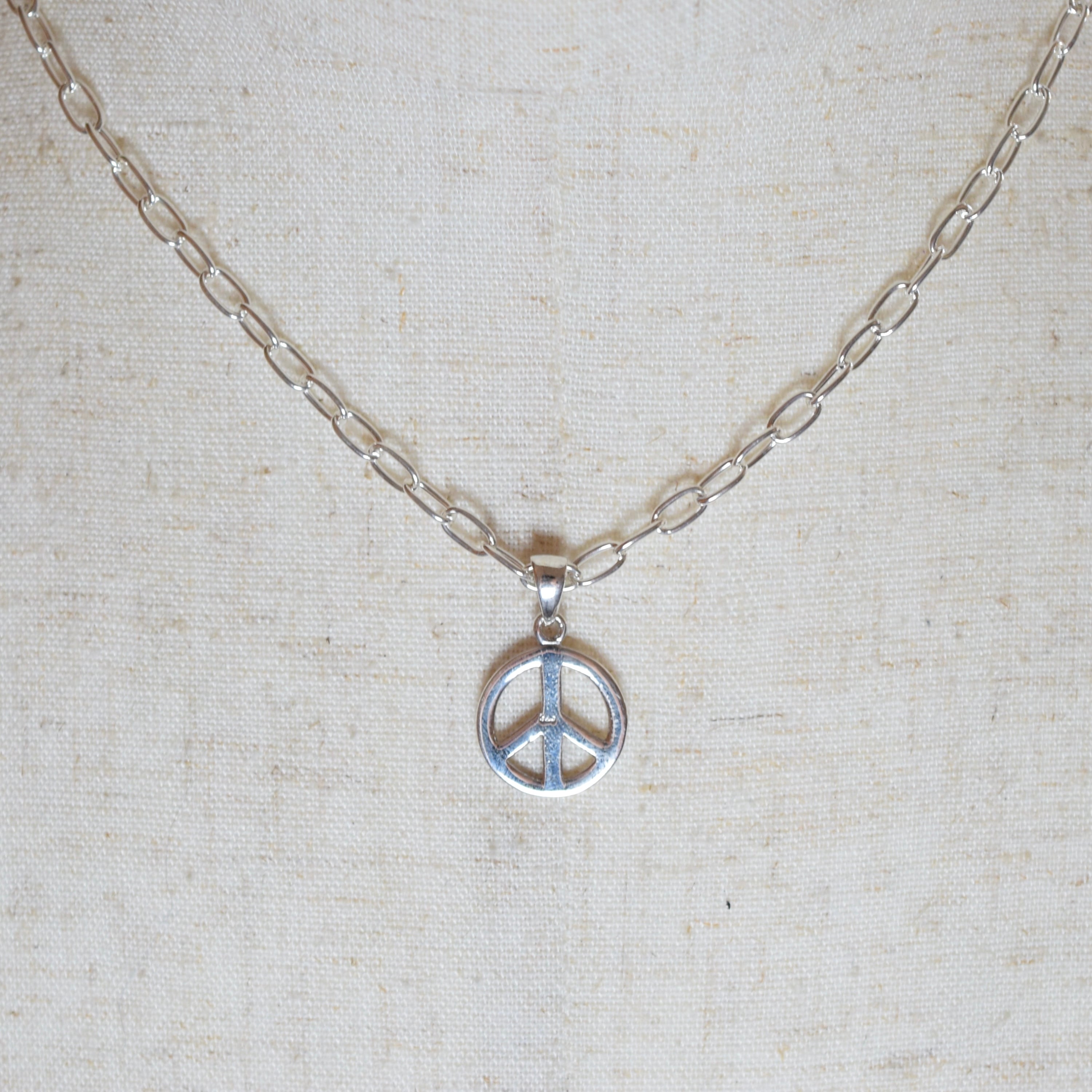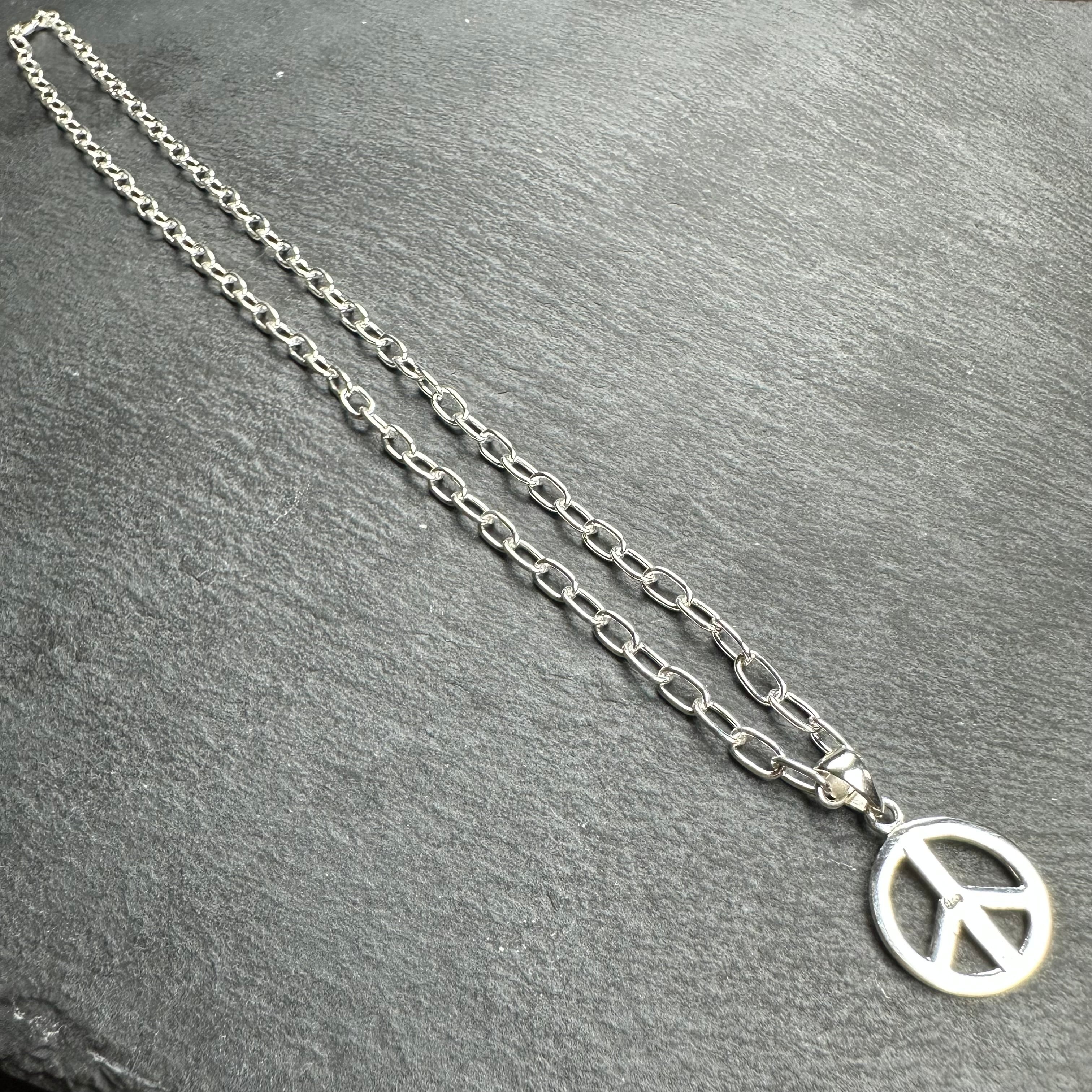 シンプルなチェーンネックレスに存在感のあるピースマークのペンダントがマッチして上品な一品になってます。