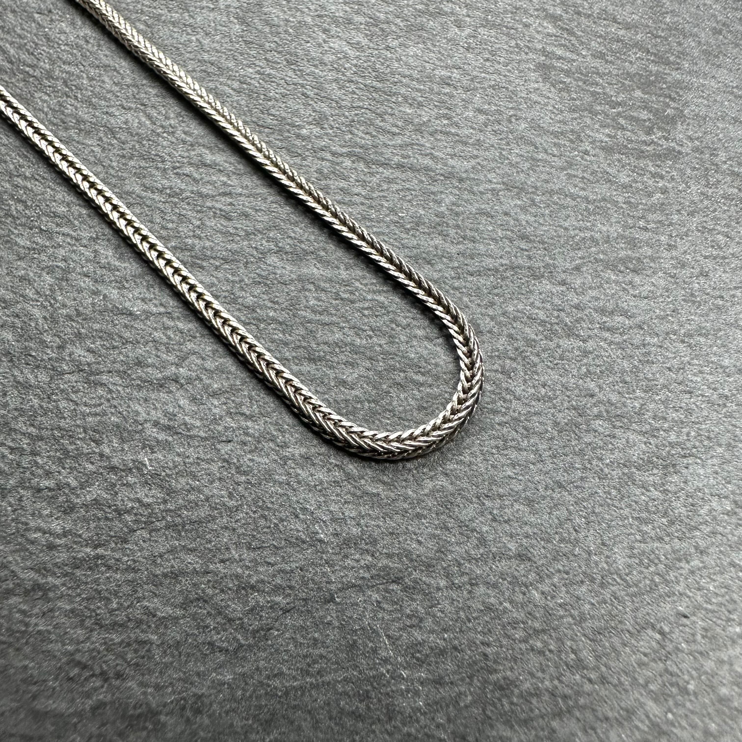 細やかな編み込み模様が美しく、光の角度で表情が変わるクールな印象の一本。シンプルだけど個性が光るネックレスです。