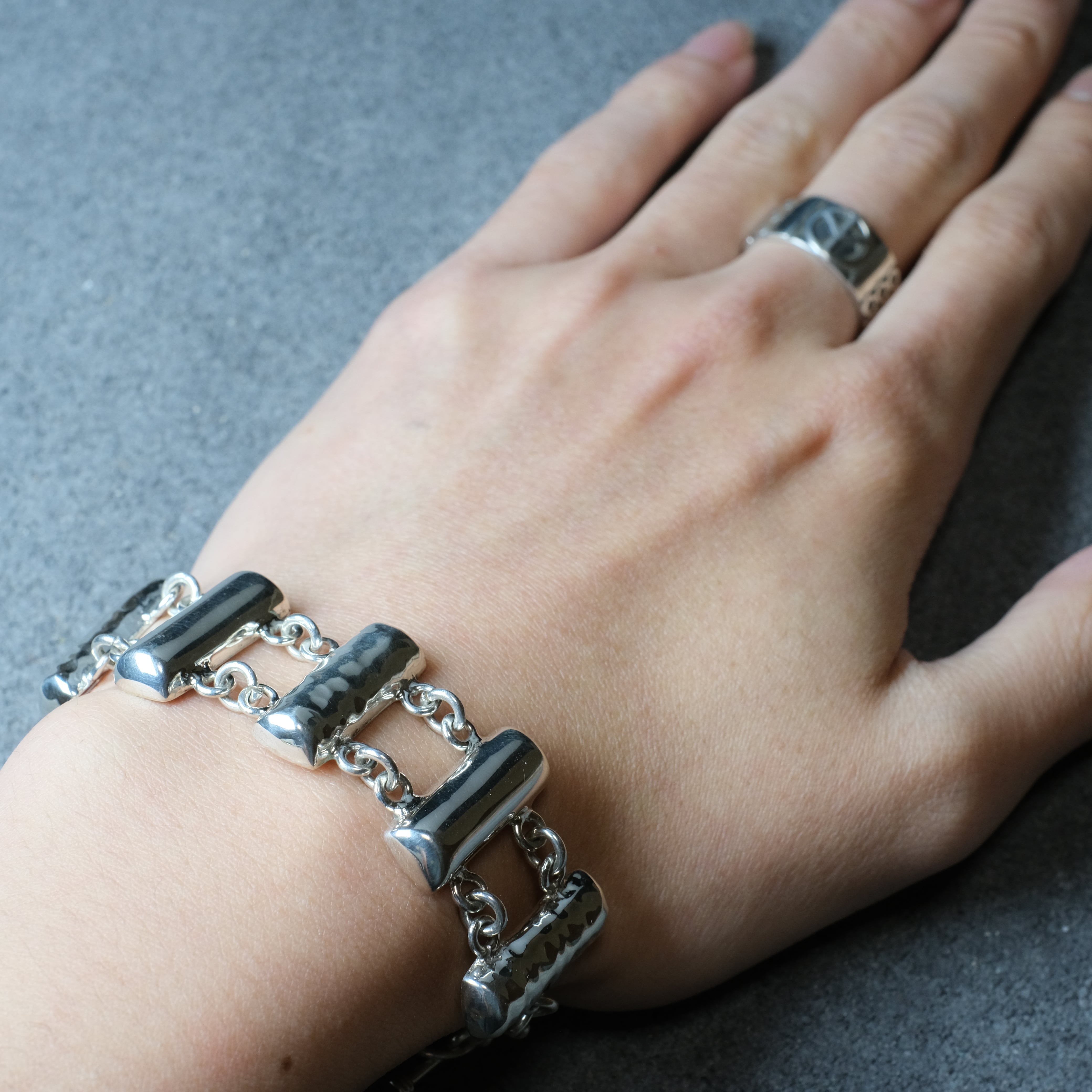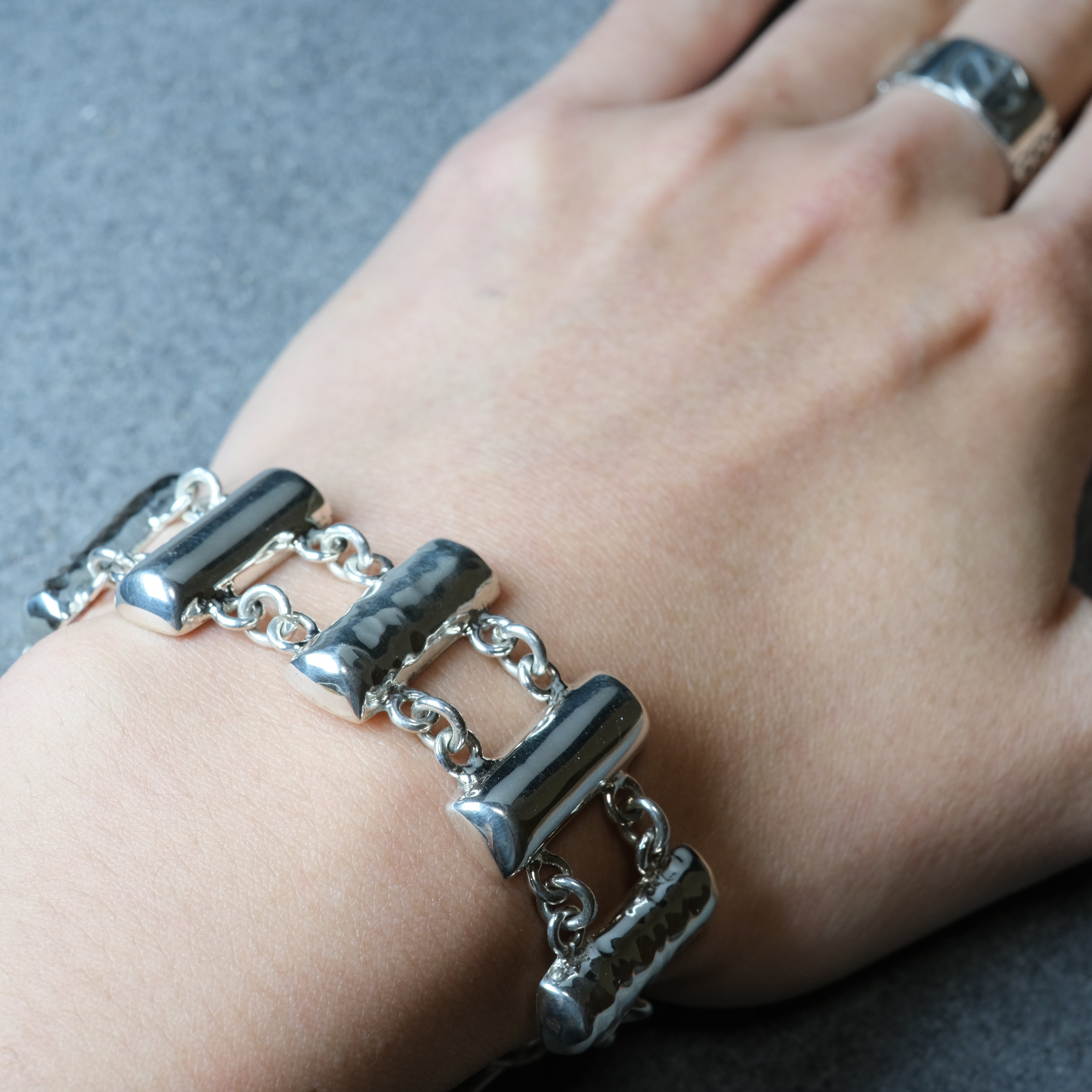 タタキデザインのプレートとデザインのないプレートが交互に連なった、シルバーブレスレットになりまふ。