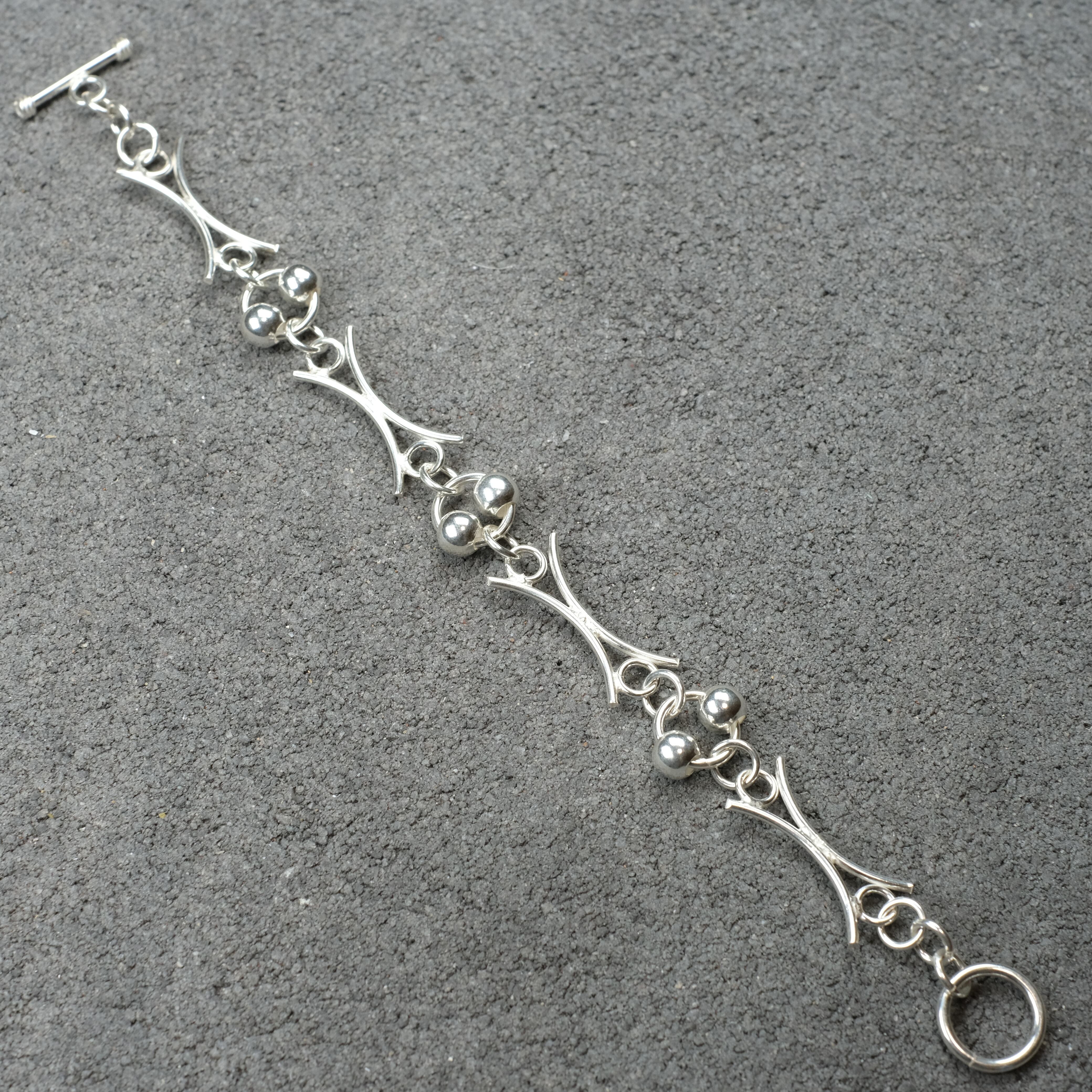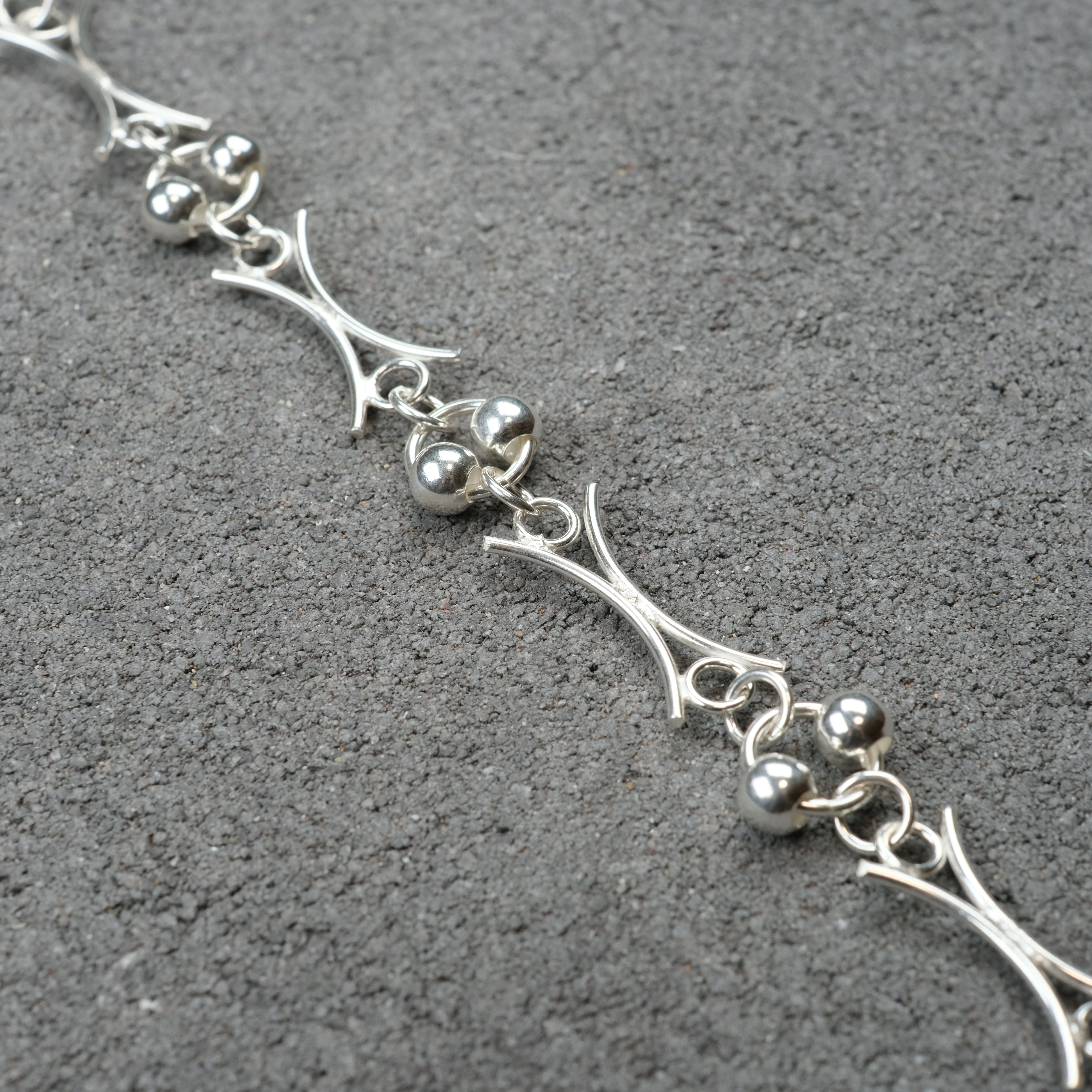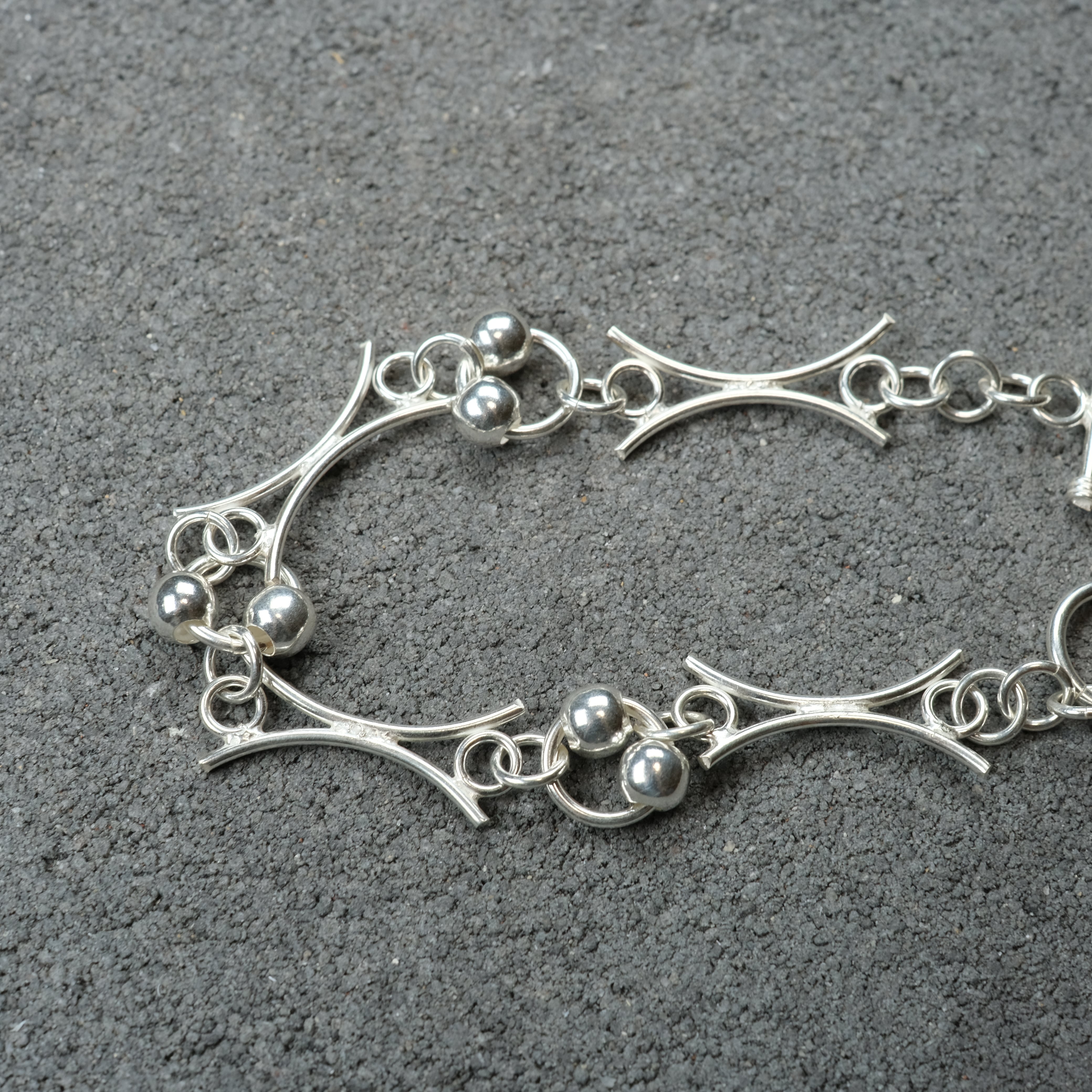 動きのあるシルバーボールやユニークチェーンが連なった、デザイン性の高いシルバーブレスレットになります。