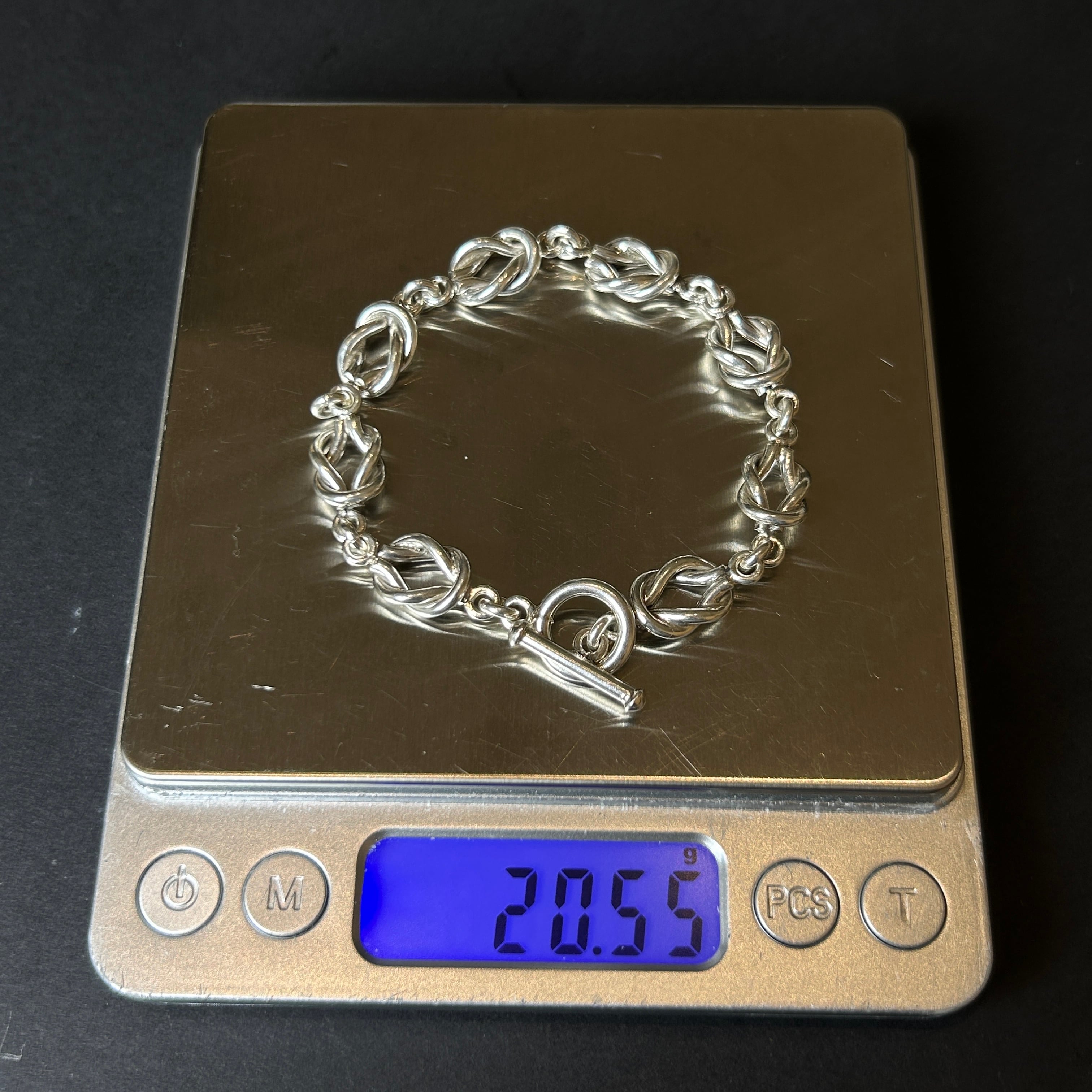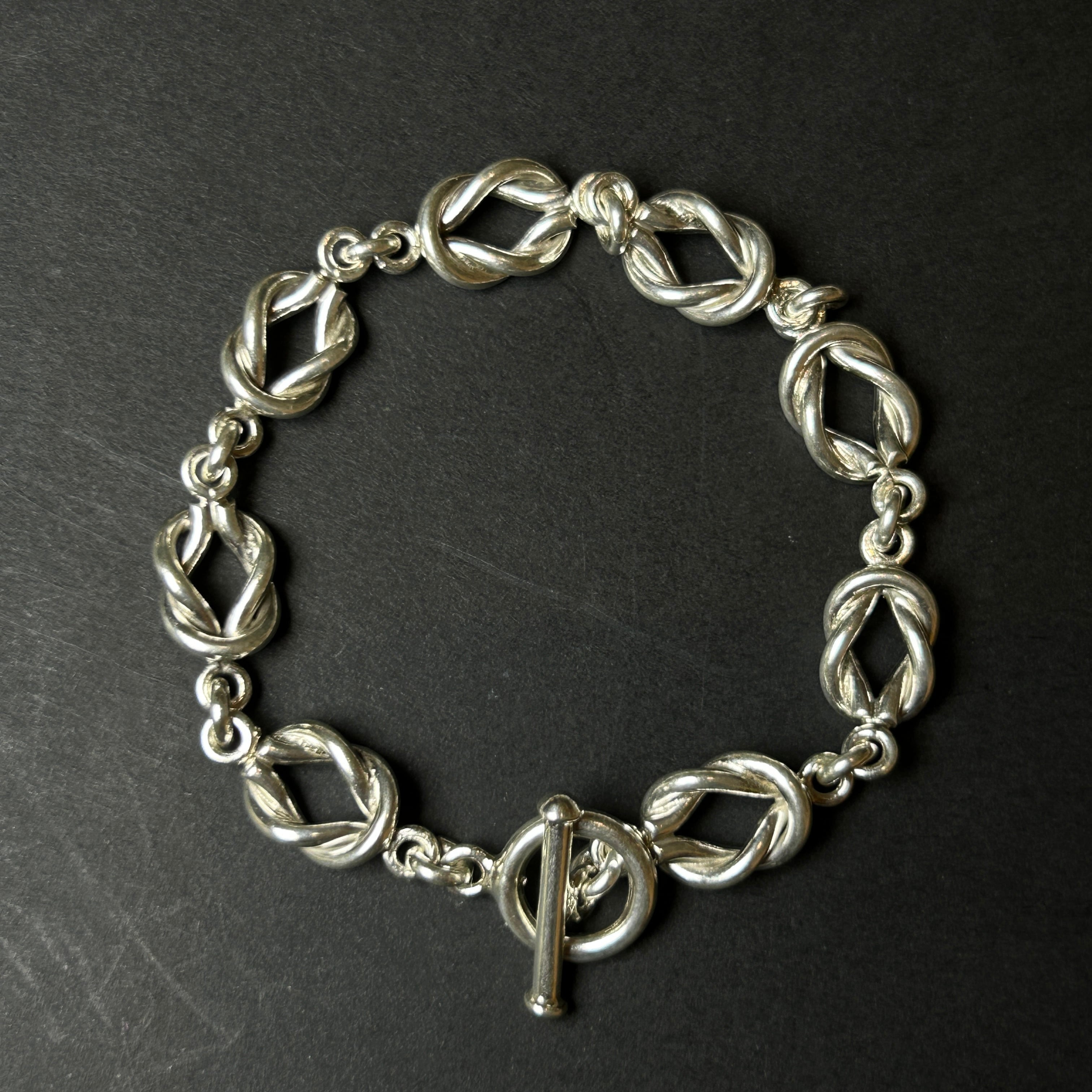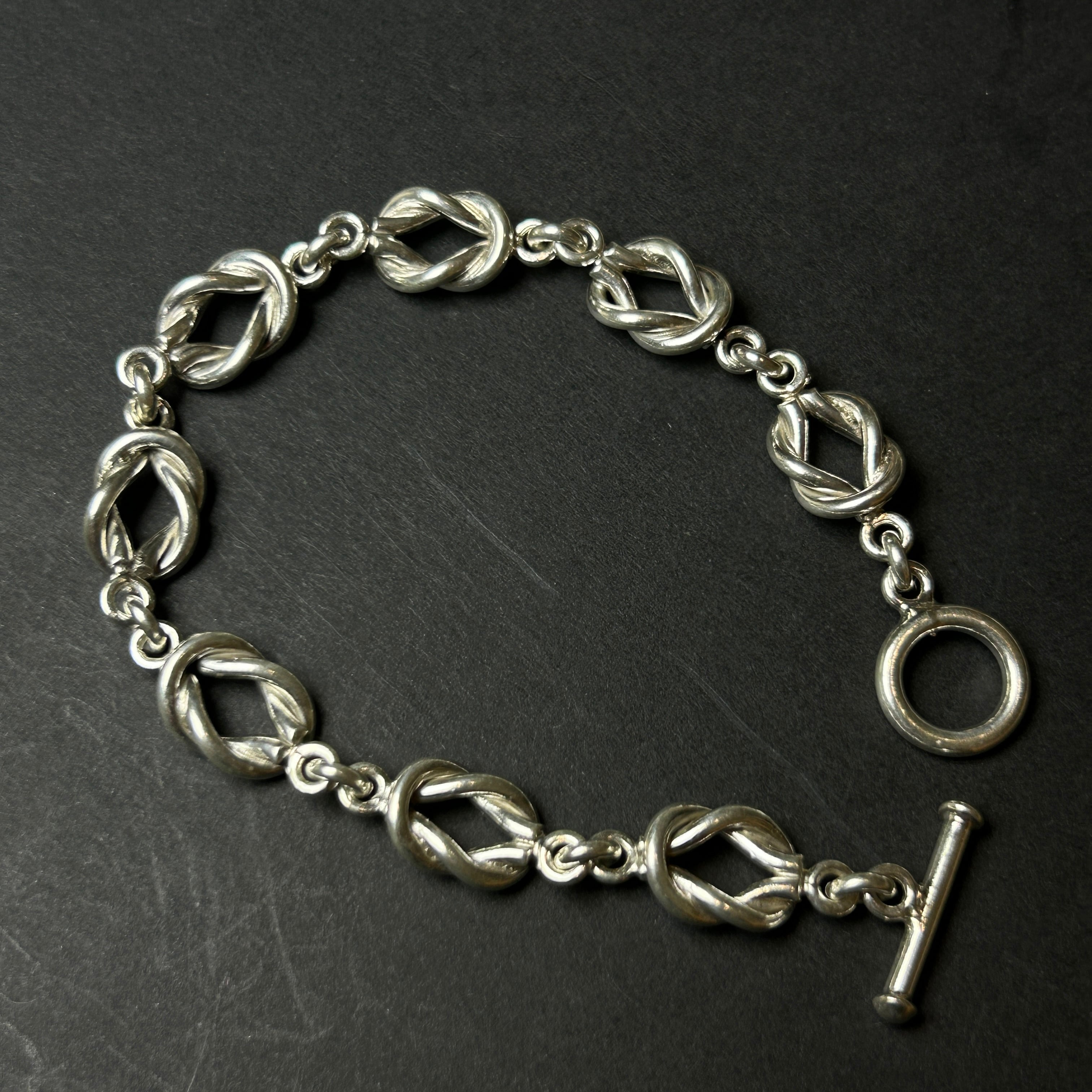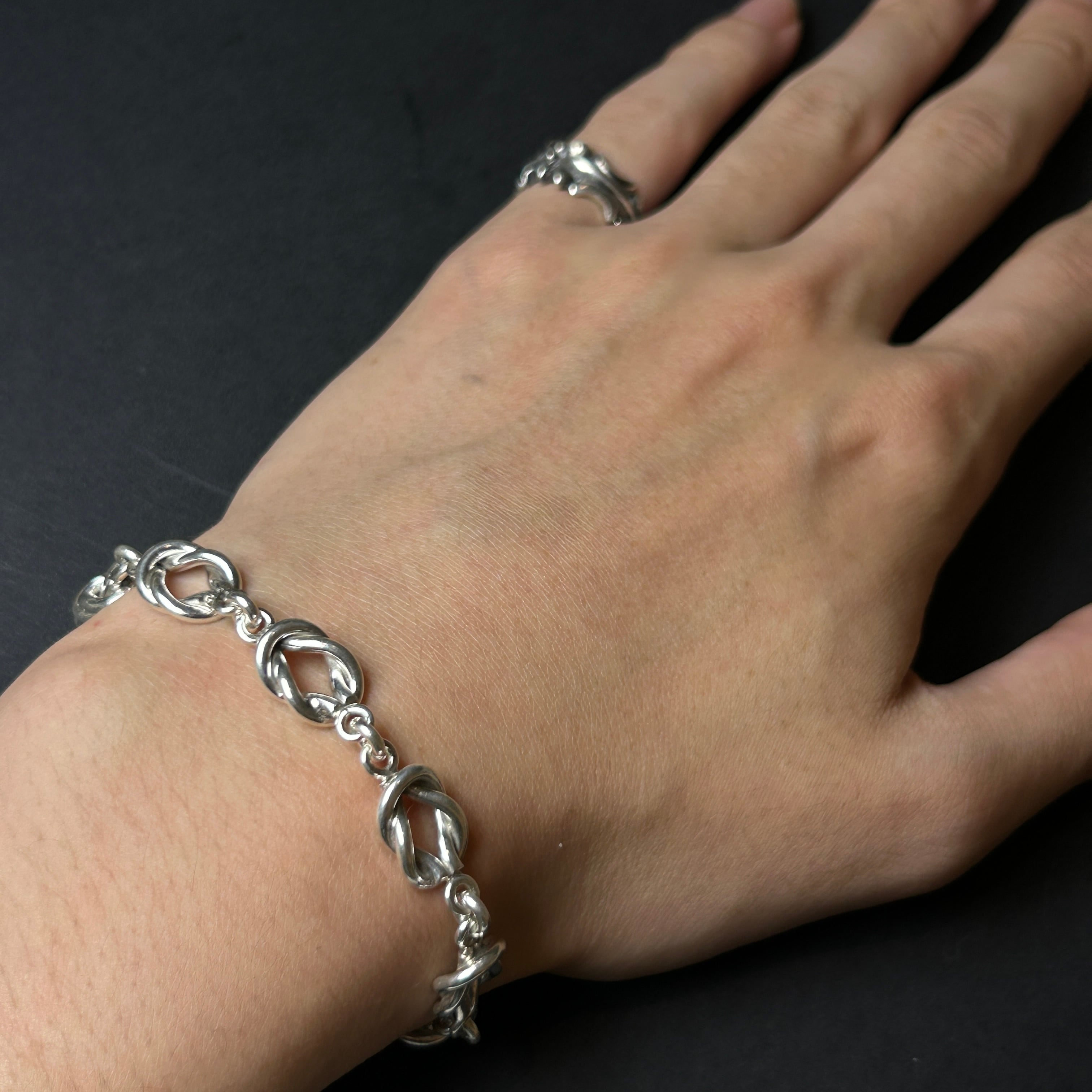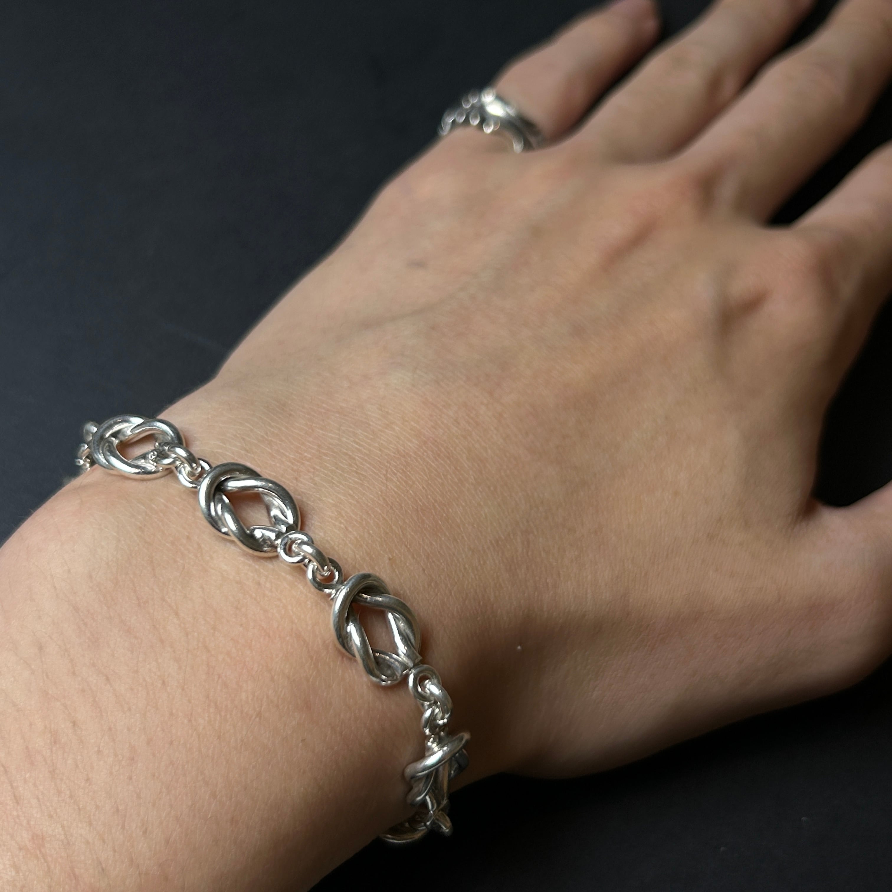 結び目のデザインが連なった、上品なシルバーブレスレットになります。