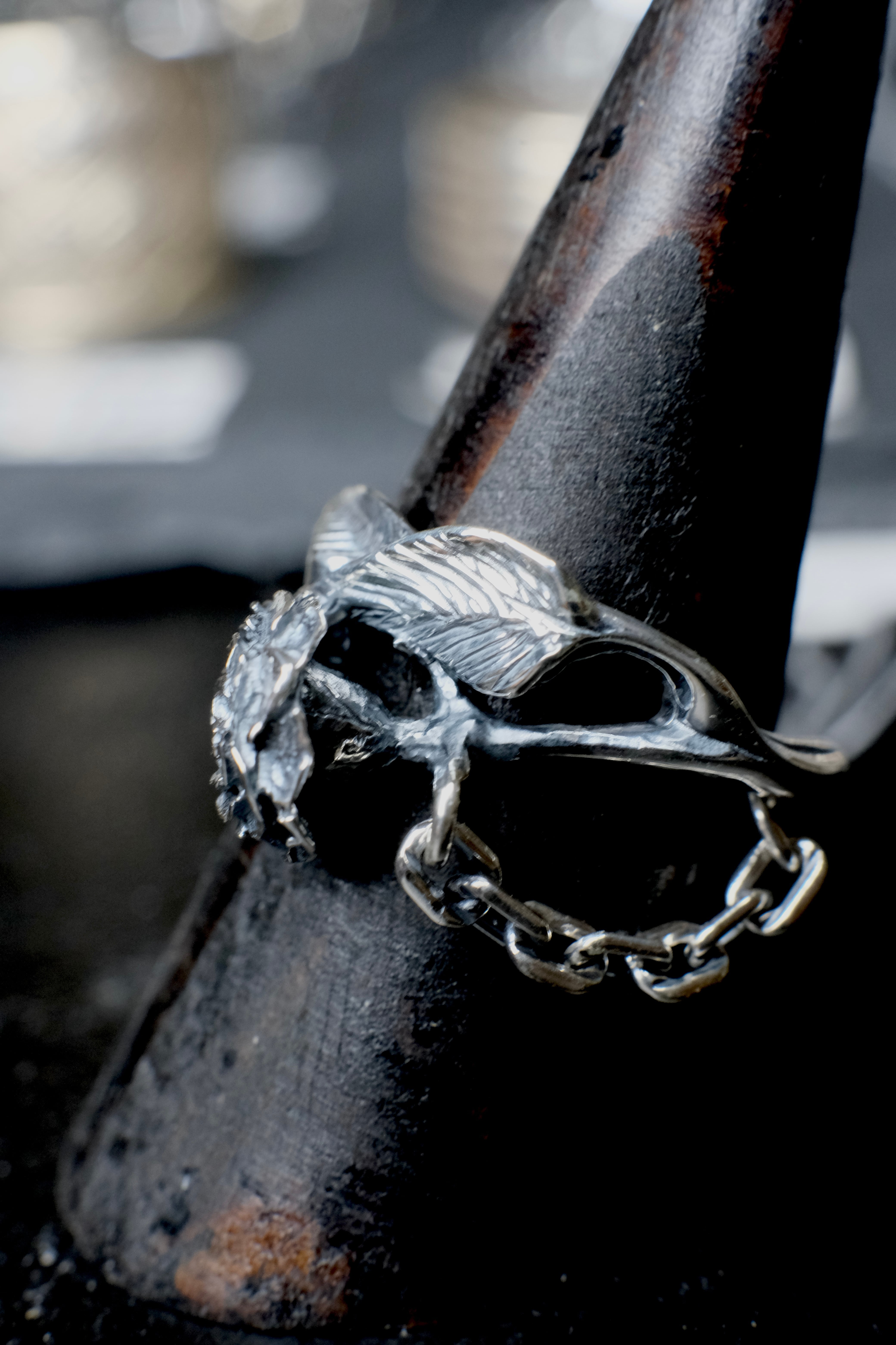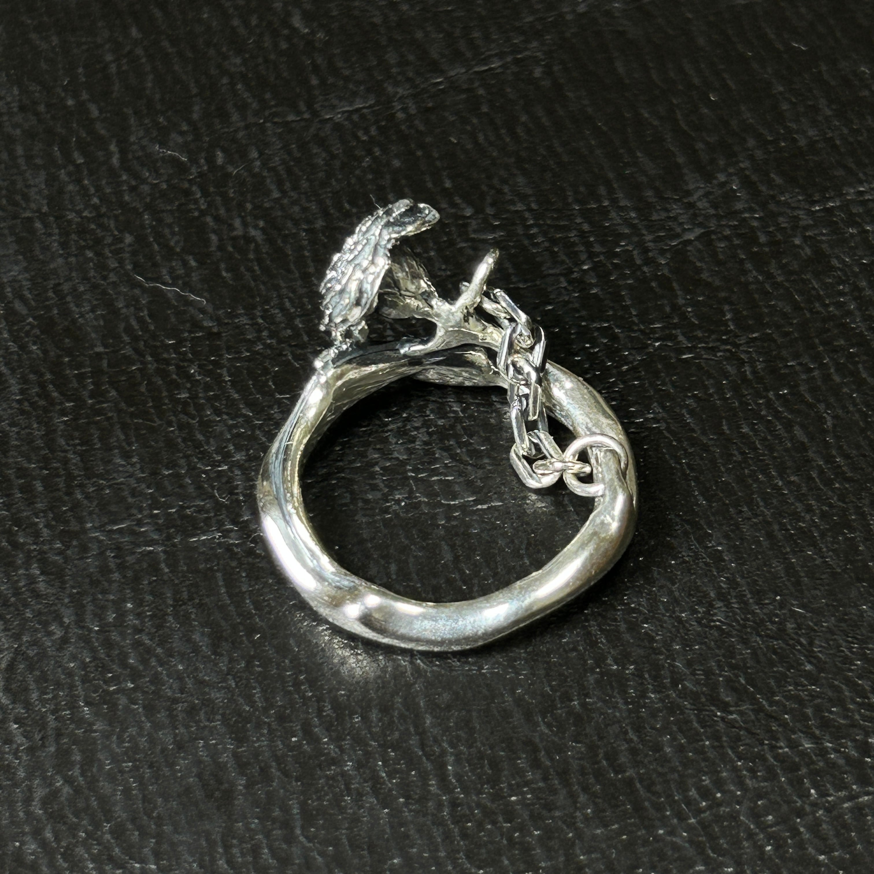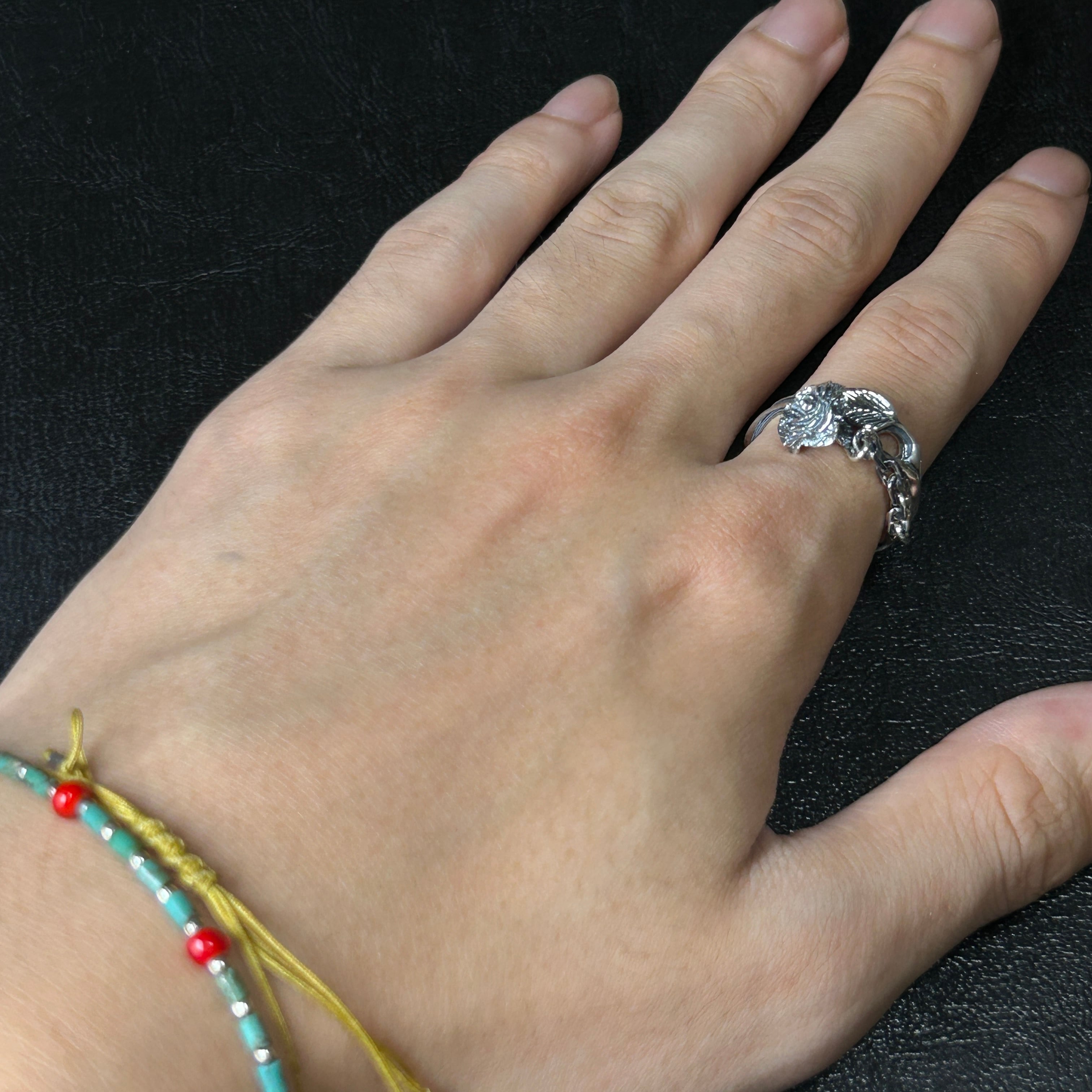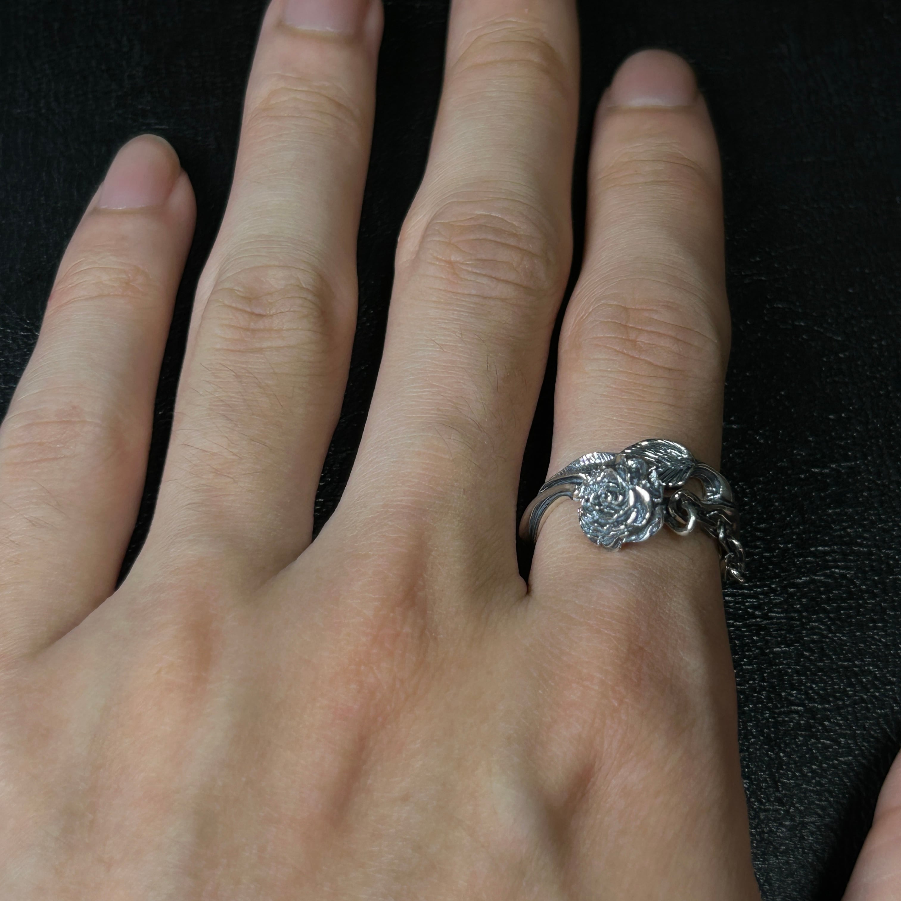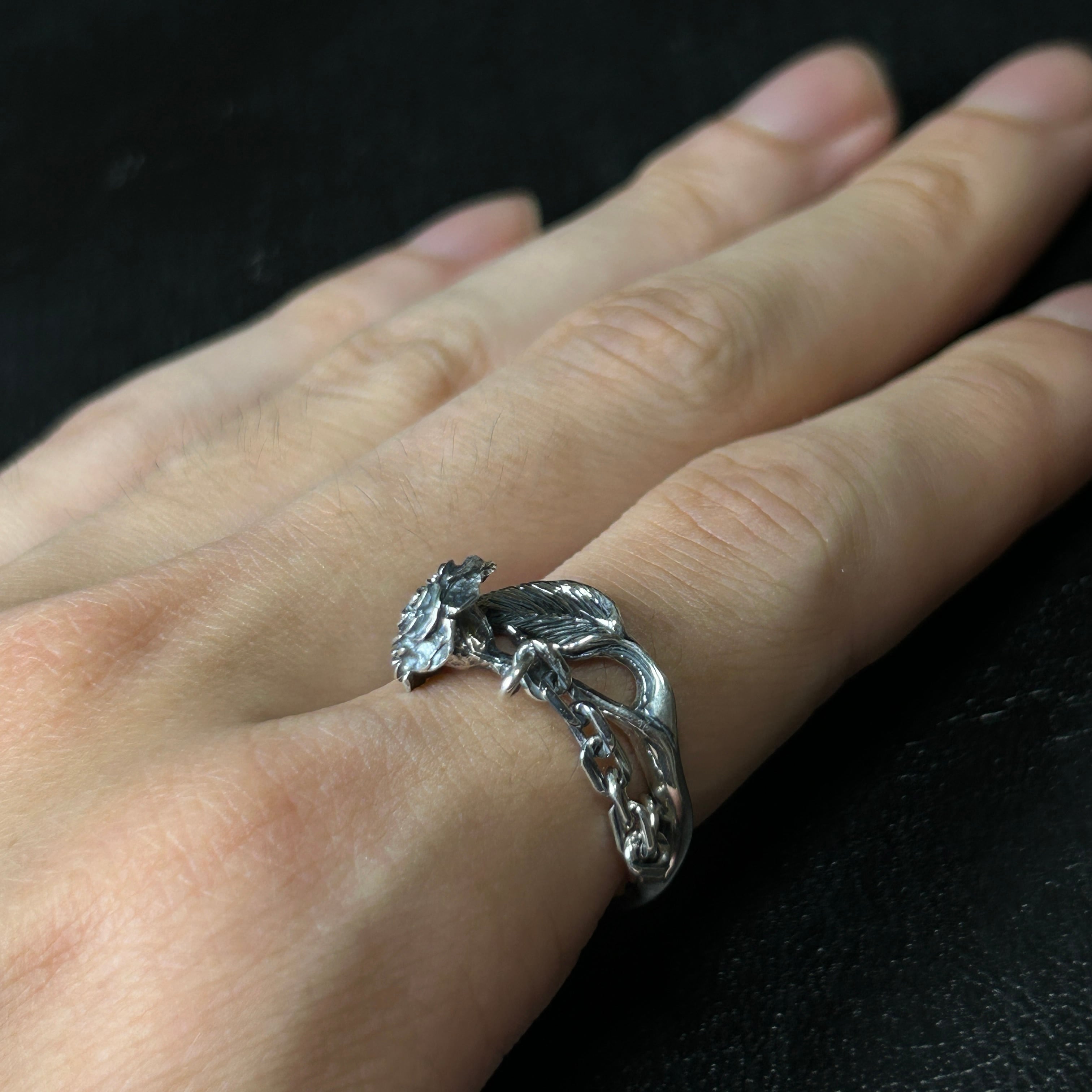 かなり細かい薔薇と鎖がデザインされた、シルバーリングになります。