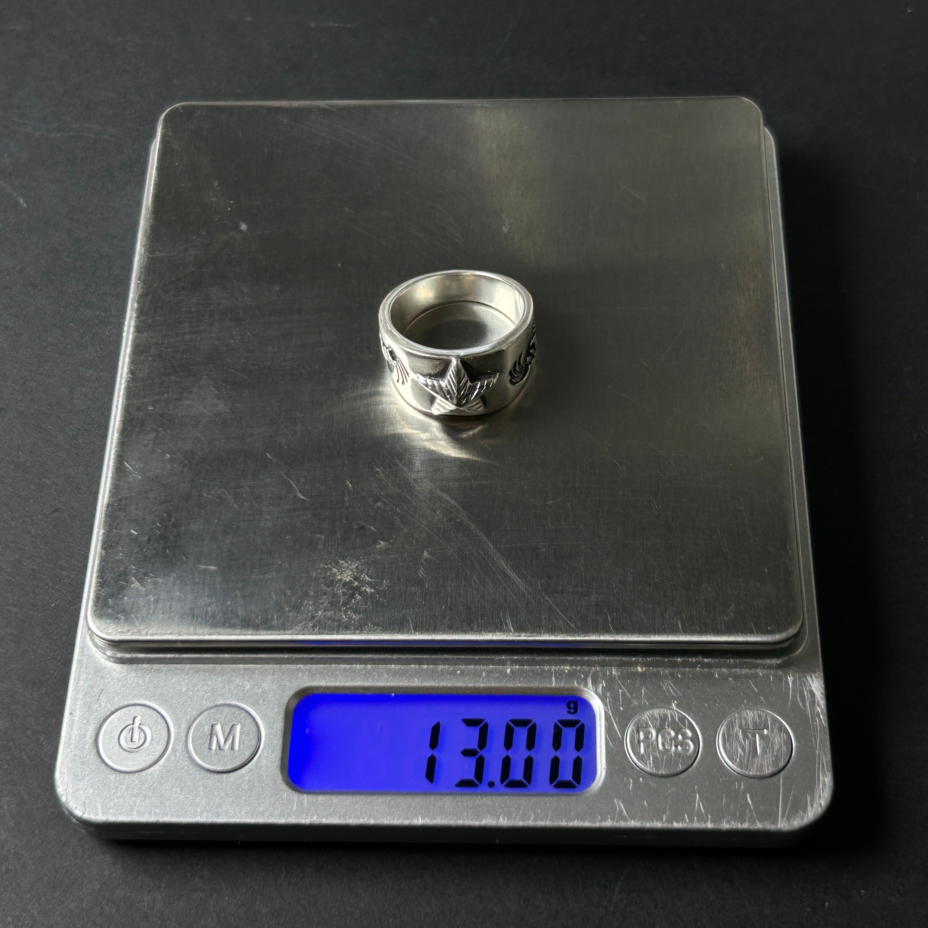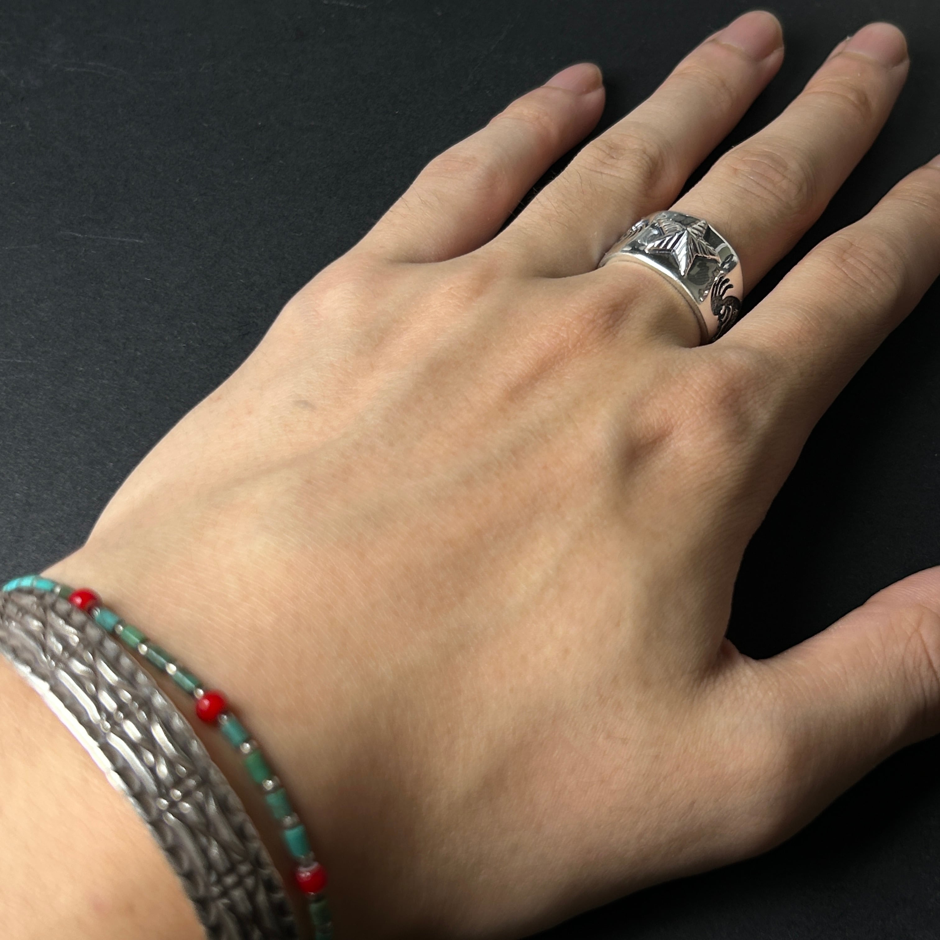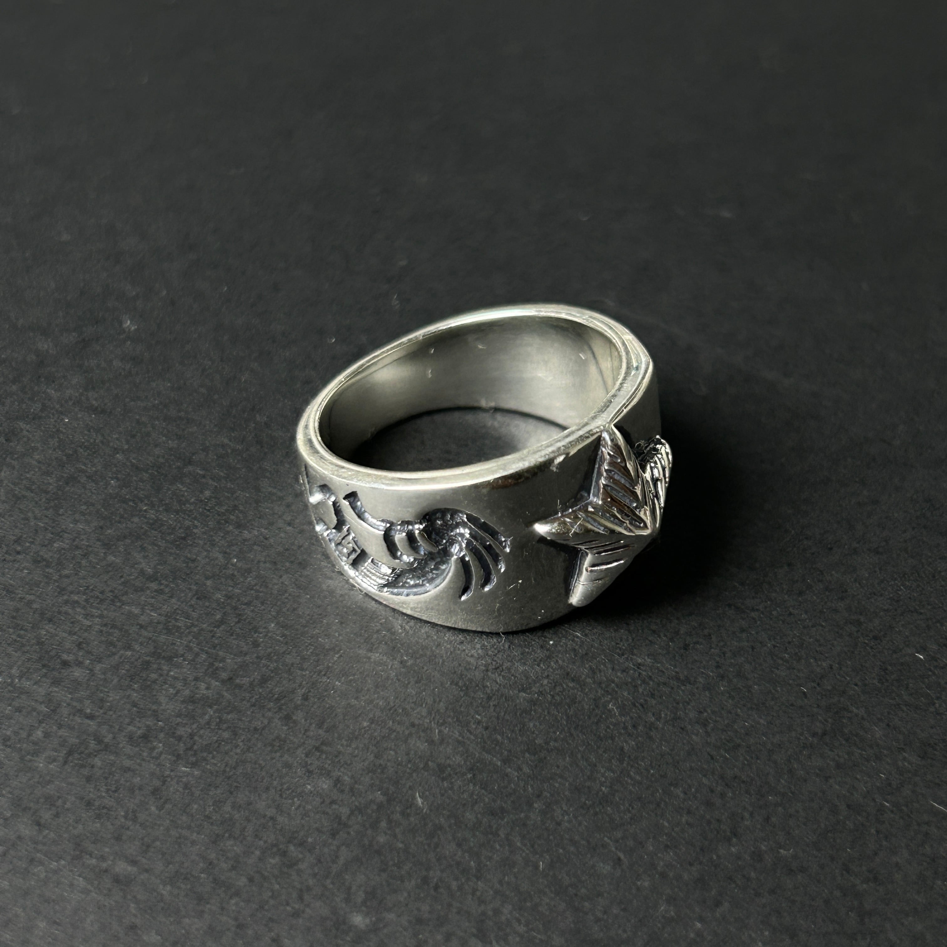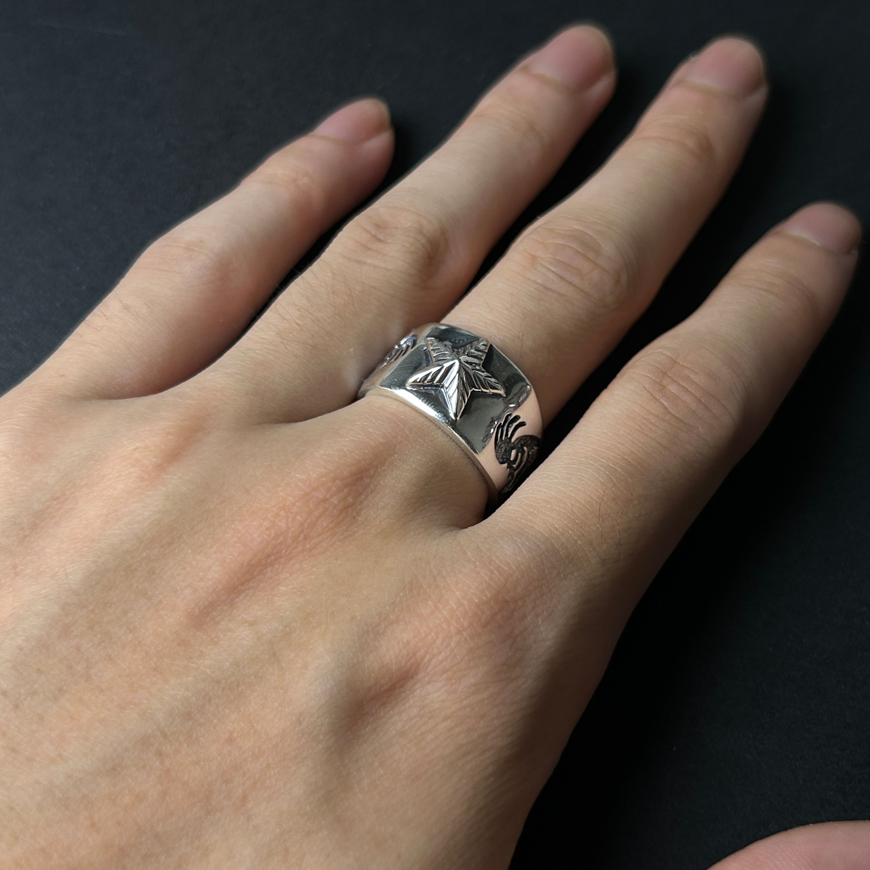 彫りが深く、燻しが効いたココペリにゴツゴツ感のあるスターデザインを併せた、存在感抜群のシルバーリングになります。