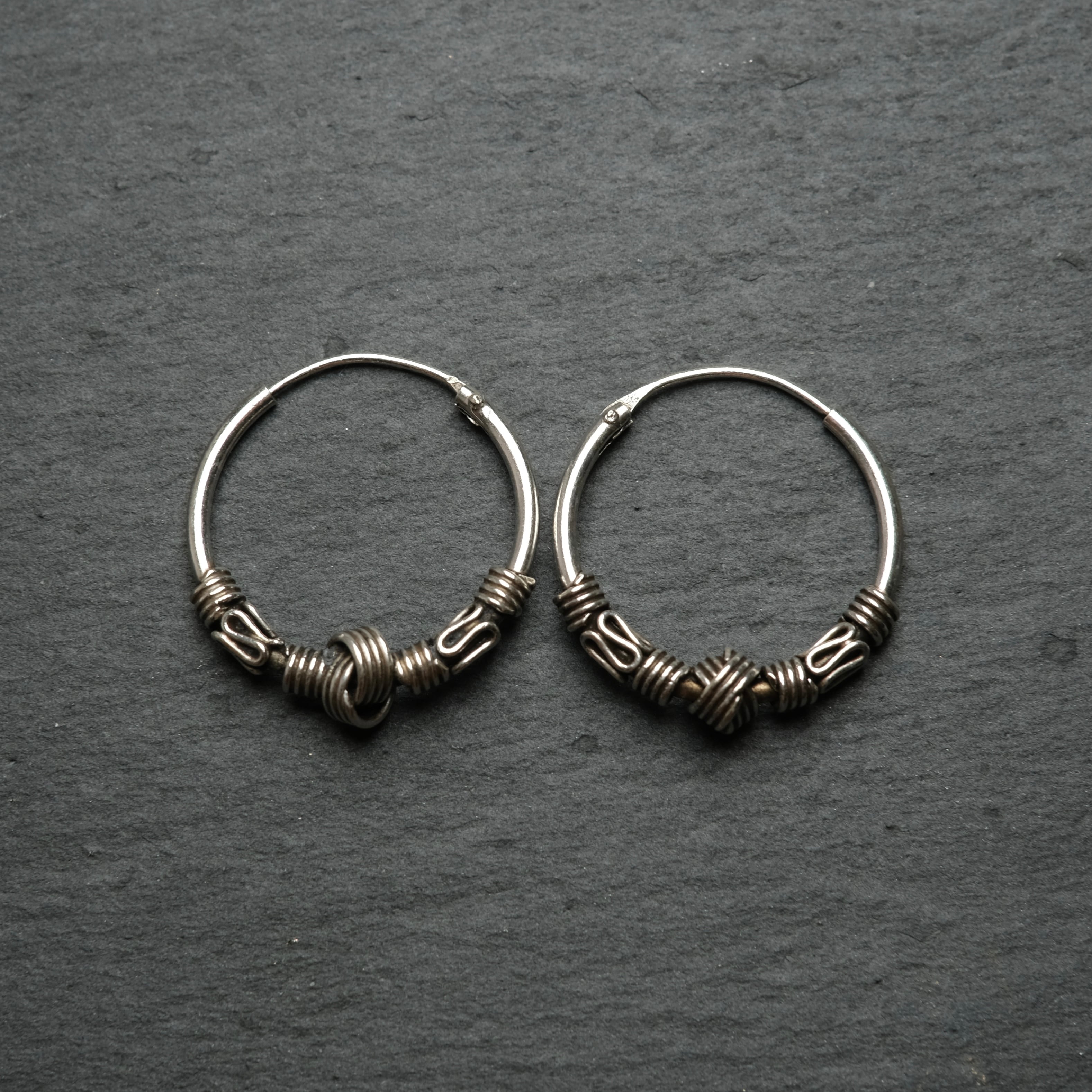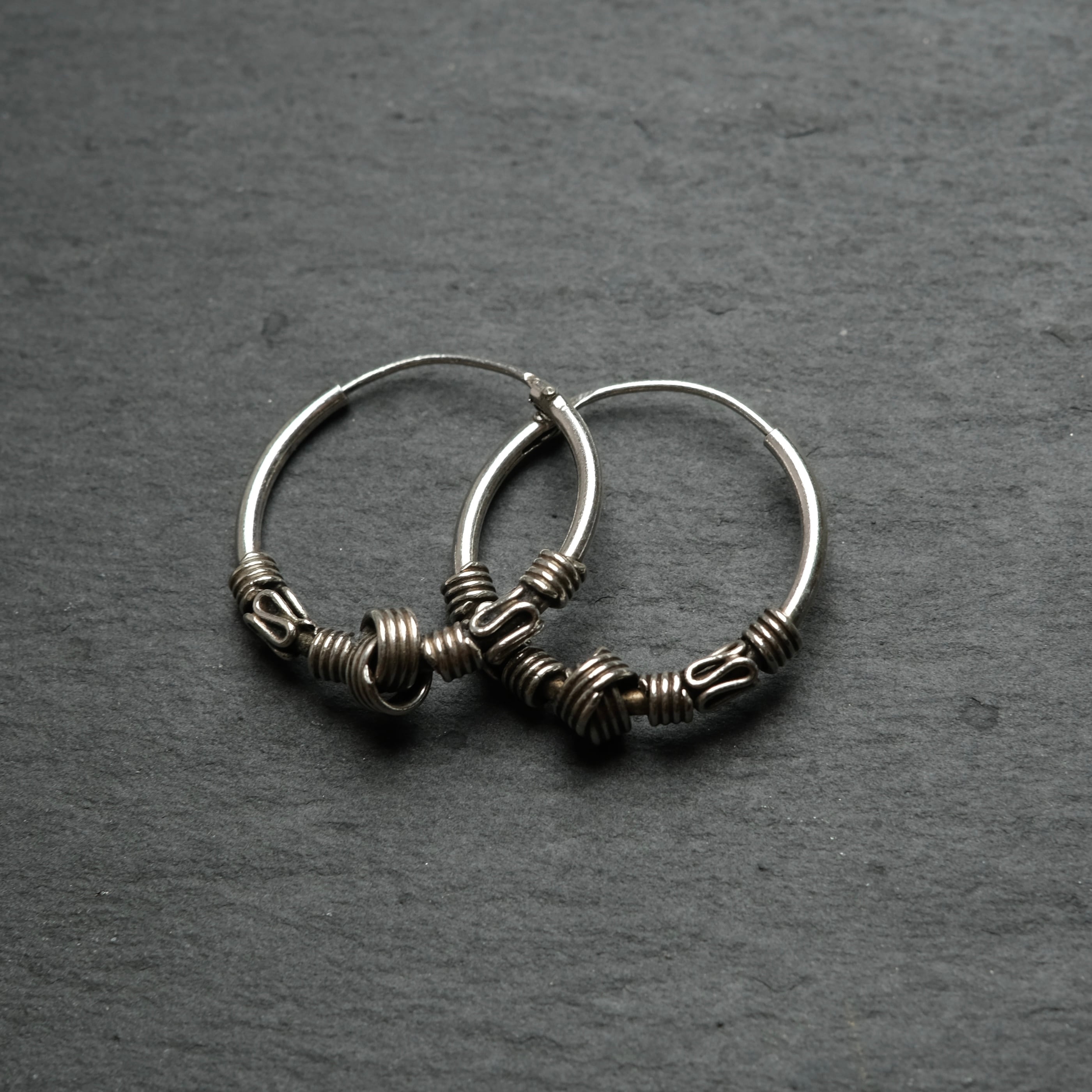 立体感のあるトライバルデザインが特徴的なシルバーフープピアスになります。