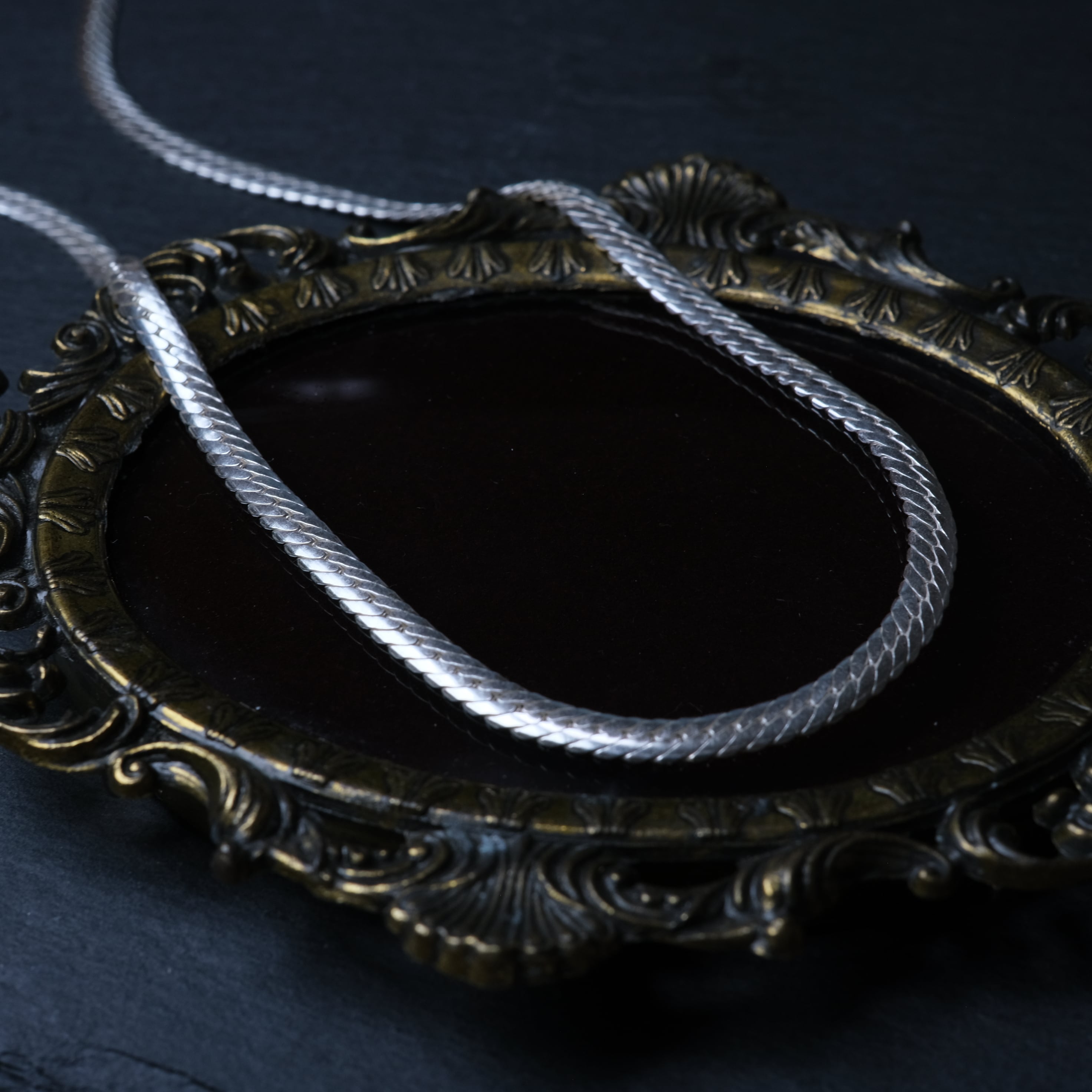 しっかりとした重厚感、上品な白光りが印象的なワイドスネークチェーンネックレスになります。