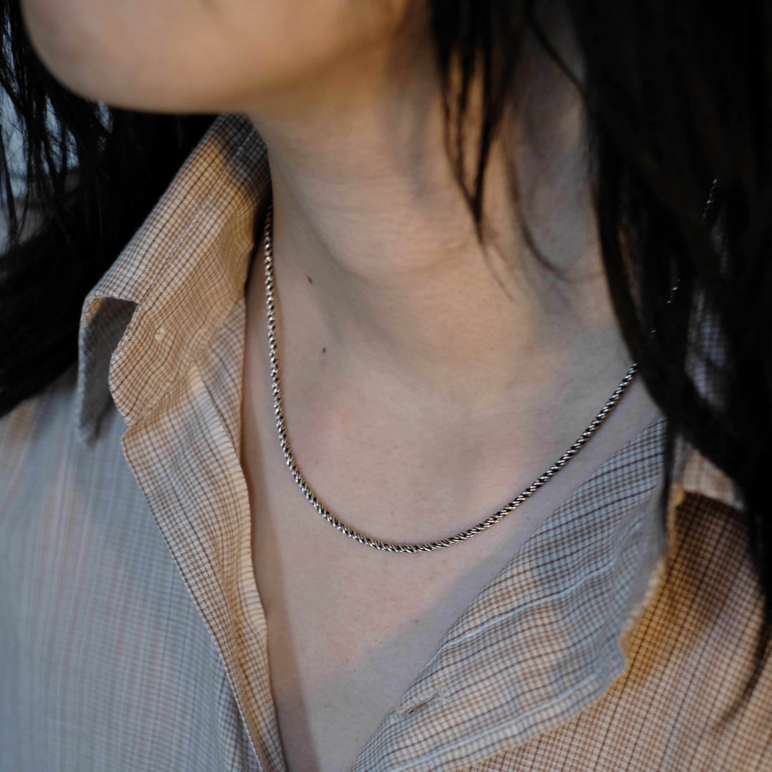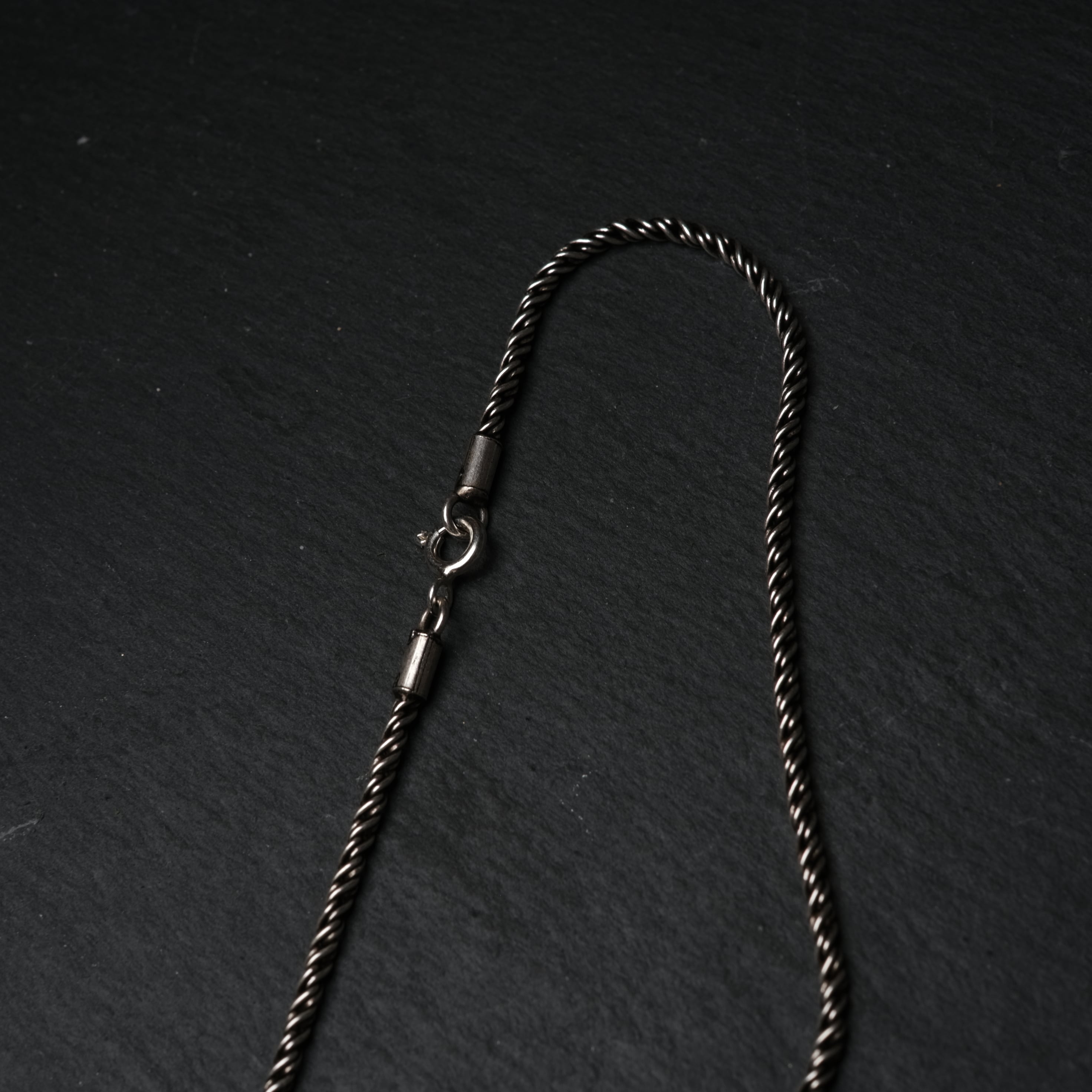 黒燻しが全体的に効いた、ツイストデザインのシルバーネックレスになります。