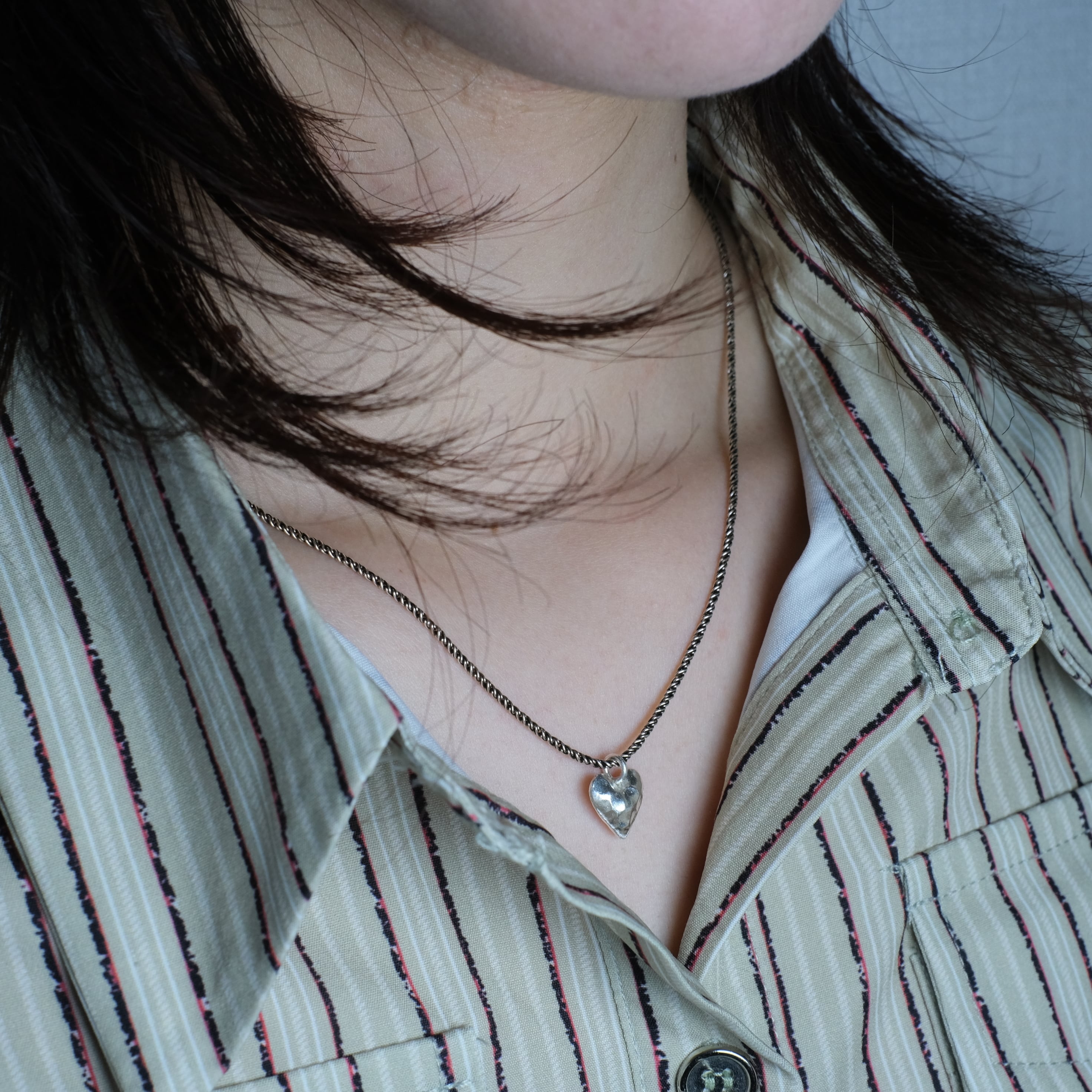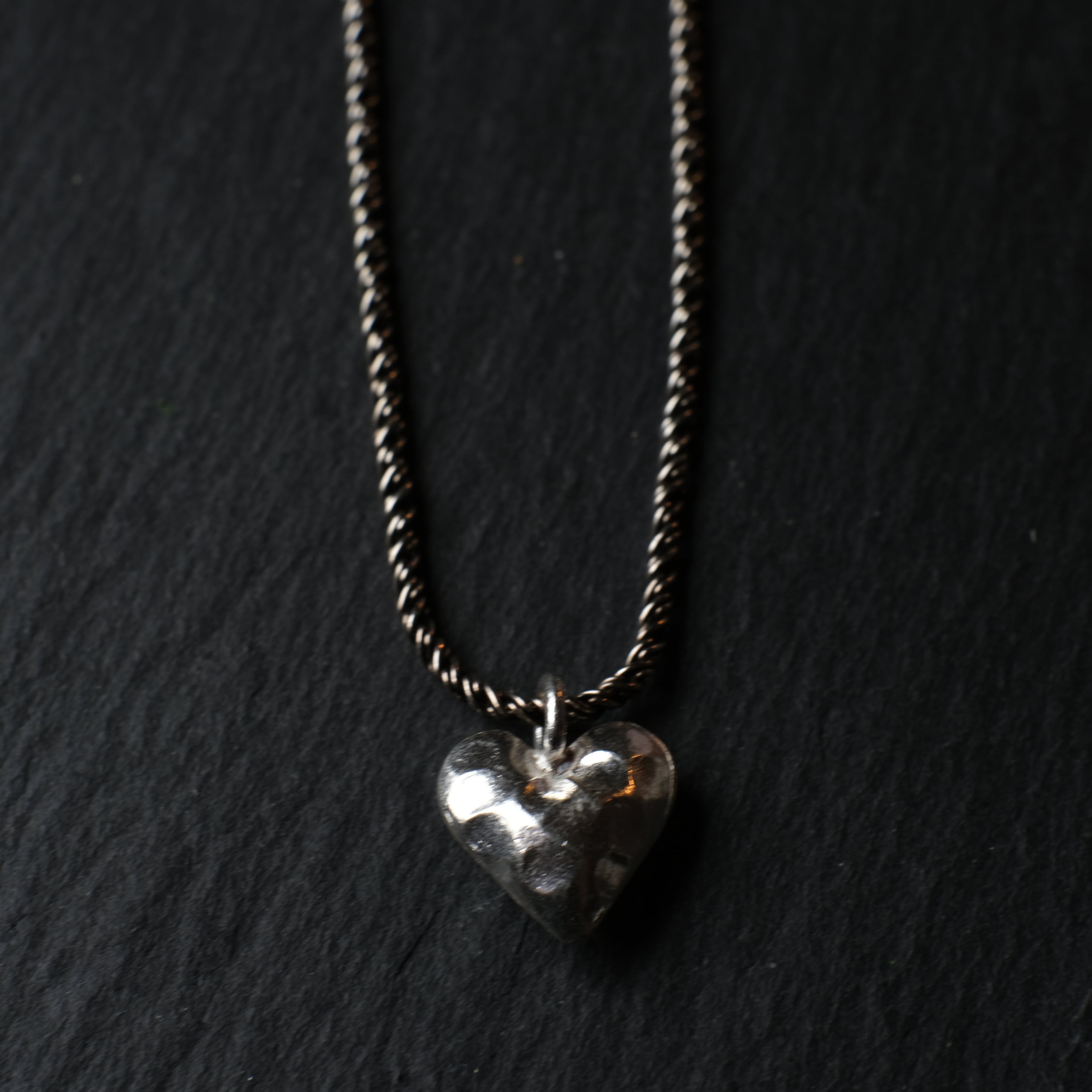 叩きデザインの入った、立体感のあるハートのペンダントをトップに用いたシルバーネックレスになります。