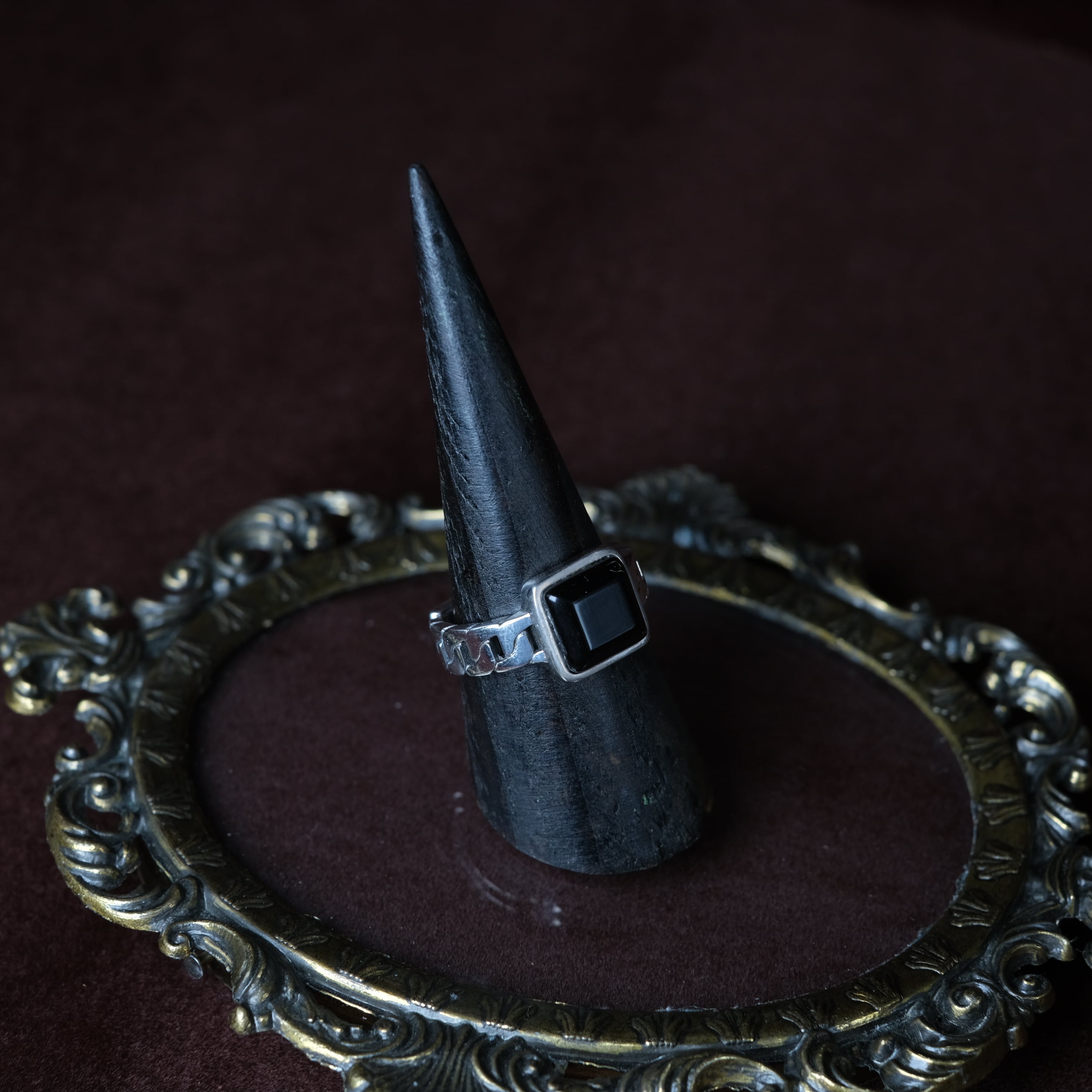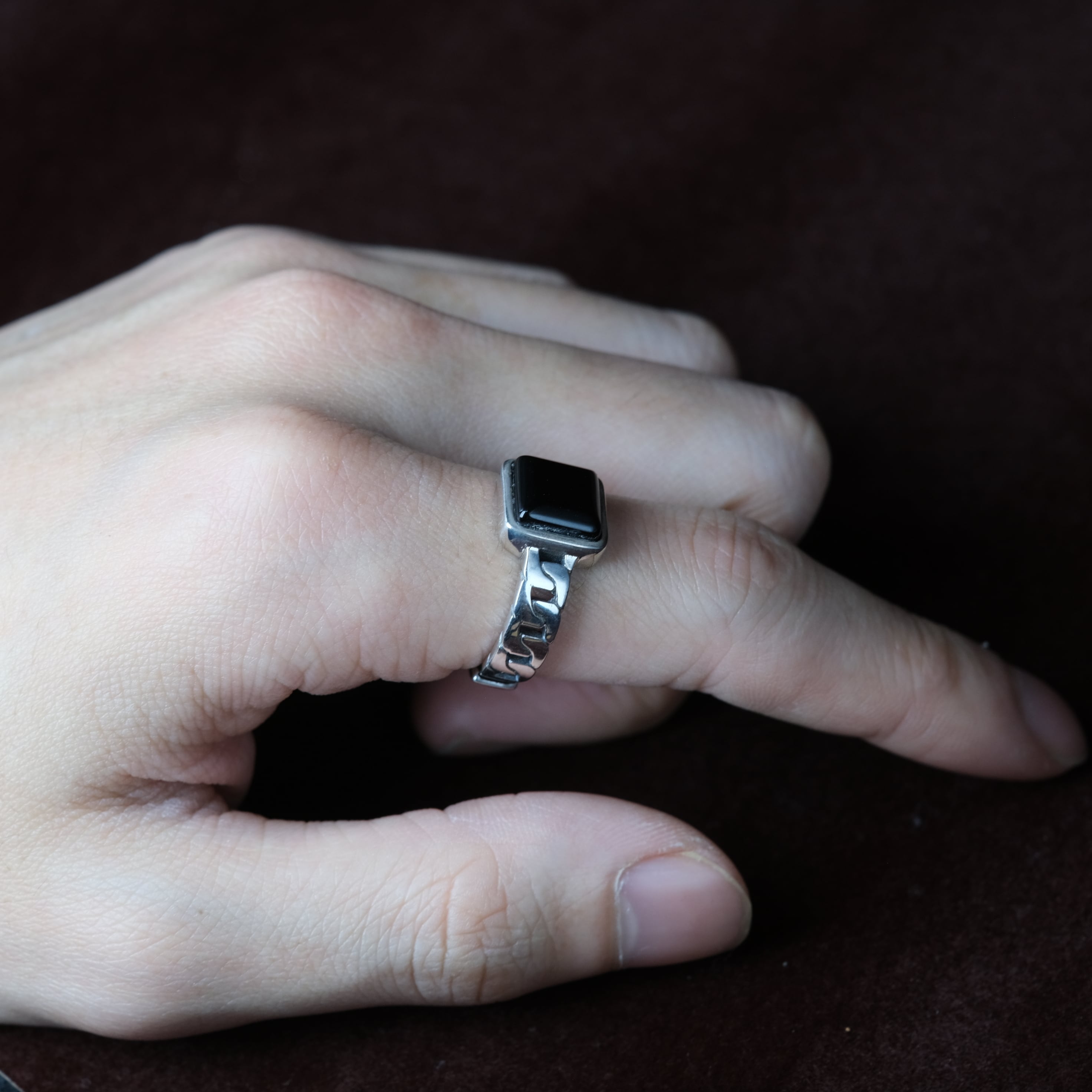 サイドに喜平デザイン、トップにはオニキスをあしらったシルバーリングになります。