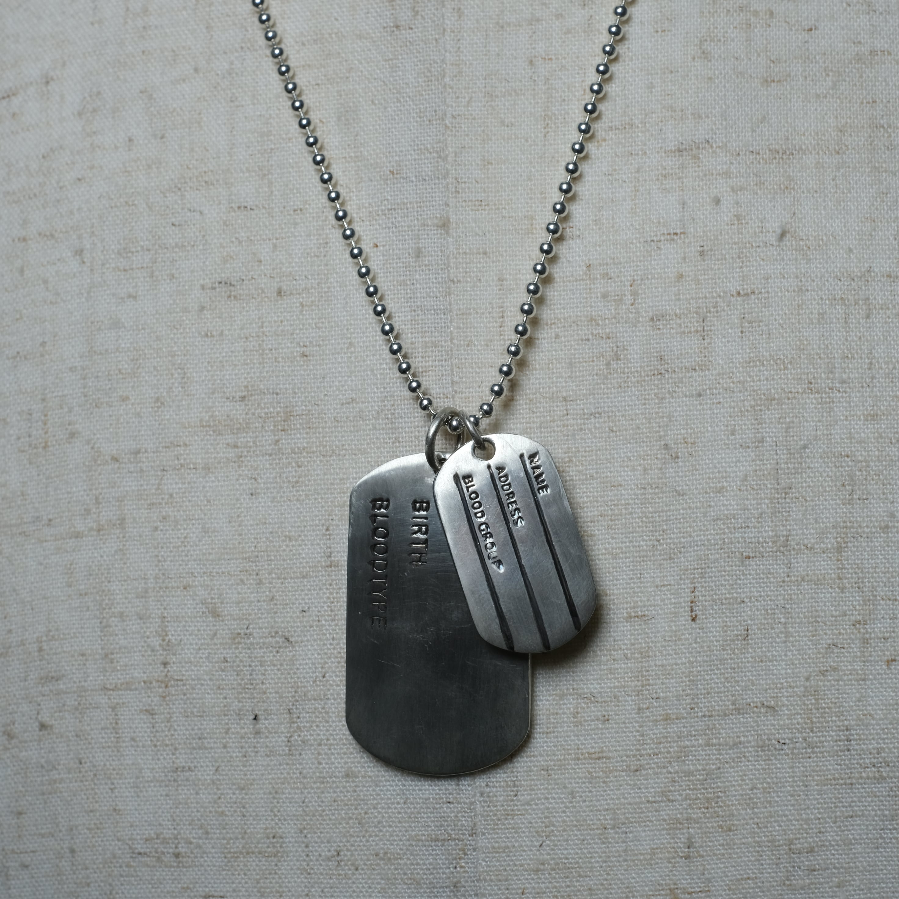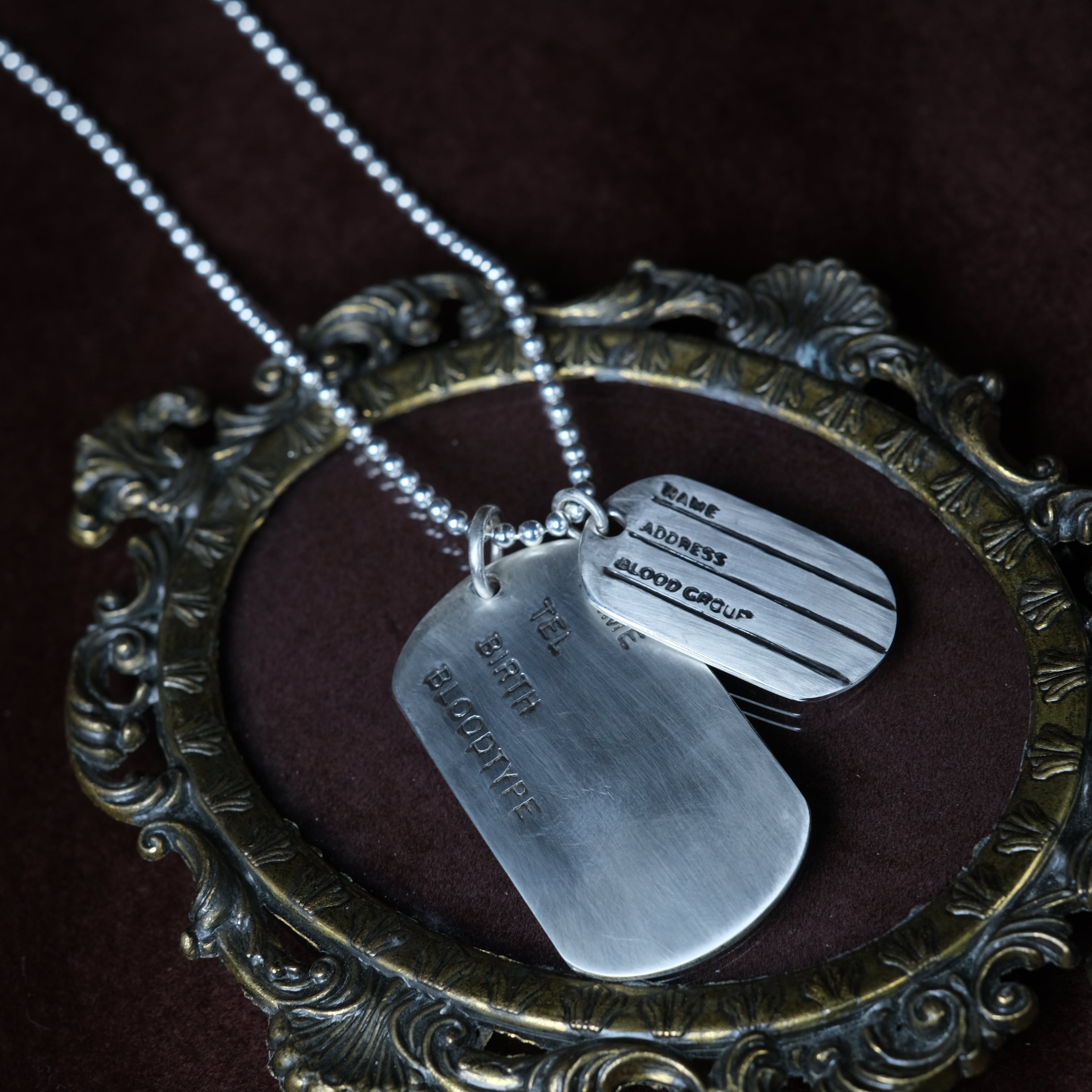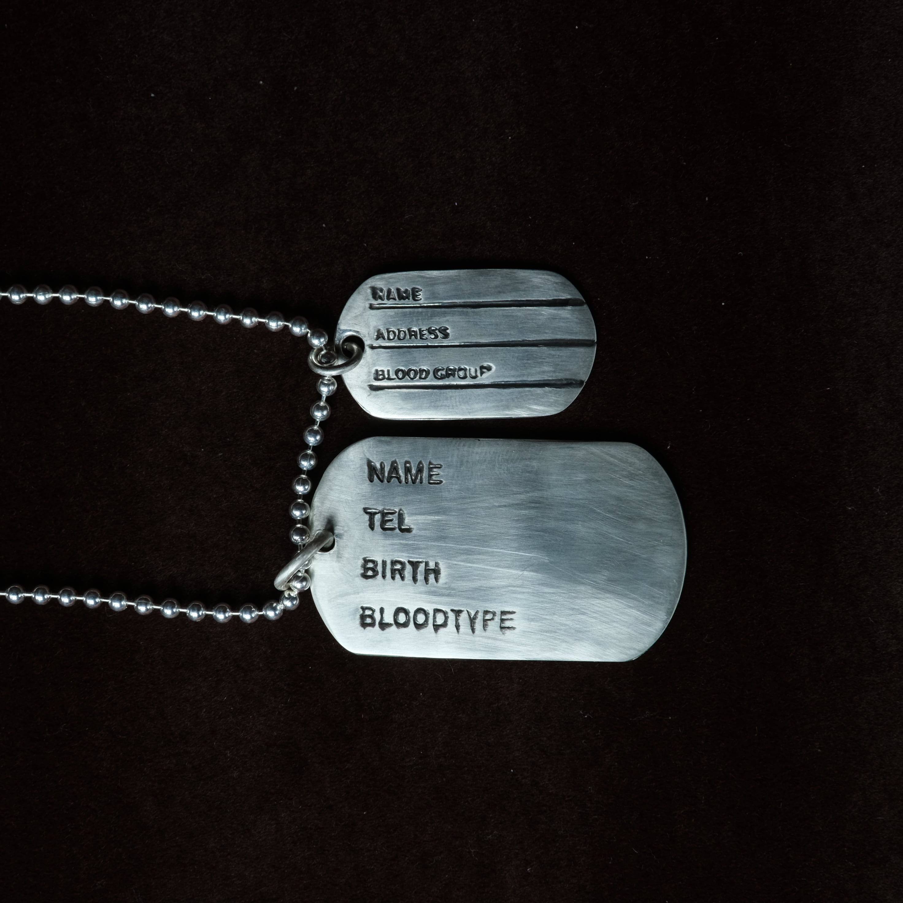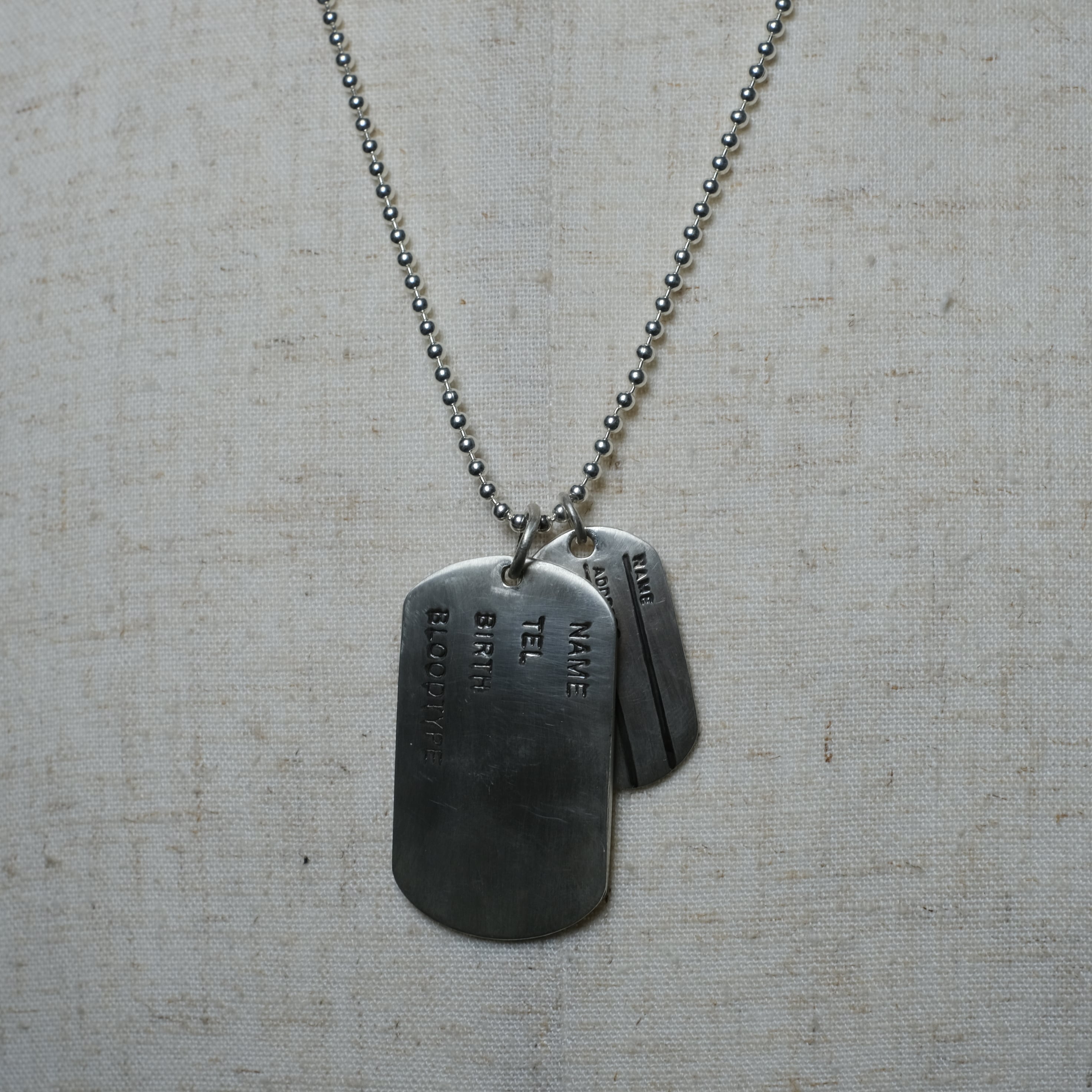 表面は使用感のあるマット仕上げ、文字部分は黒燻しを施した、シルバー製ドッグタグになります。