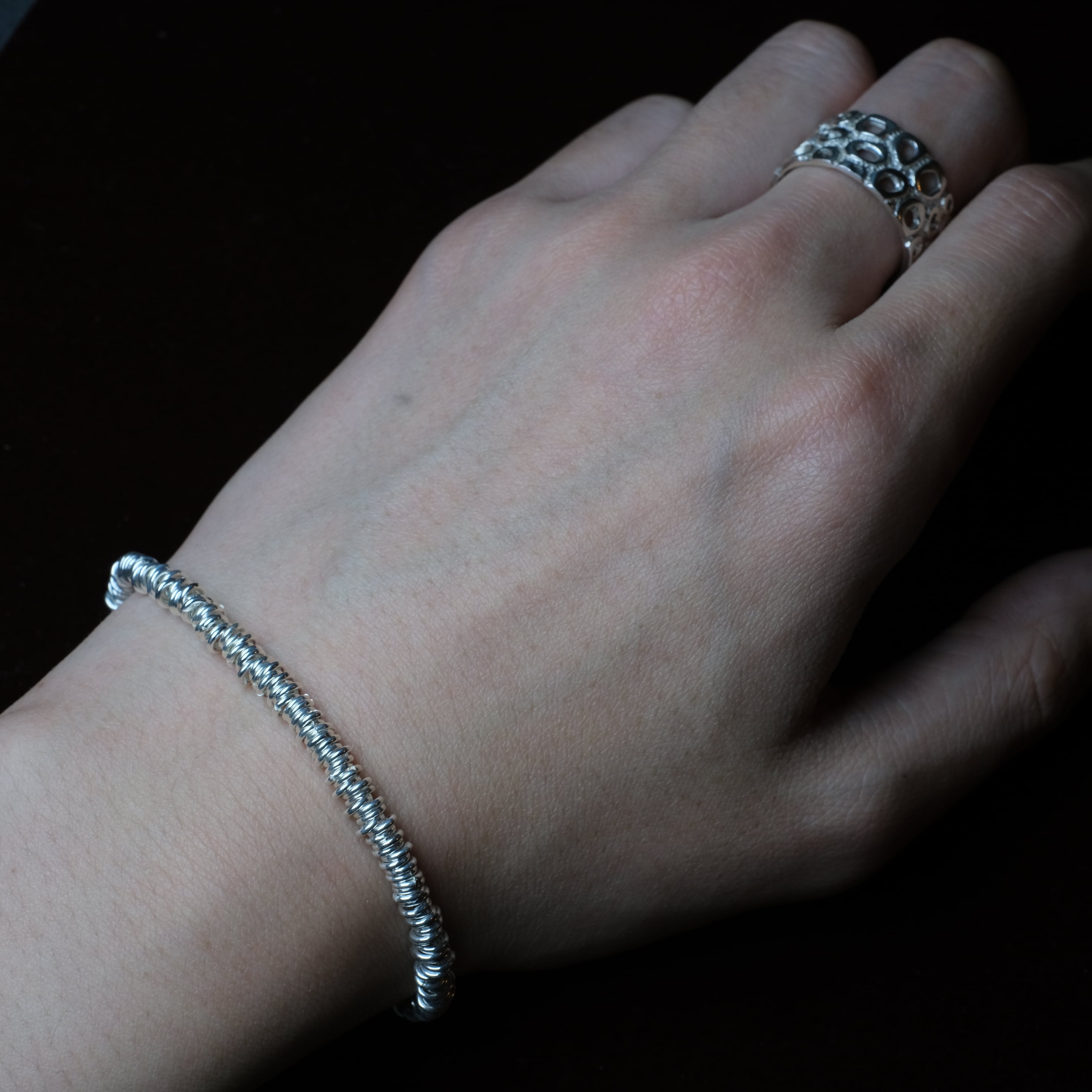 数百個のシルバーフープが連なっており、デザイン性に優れたアイテムです。