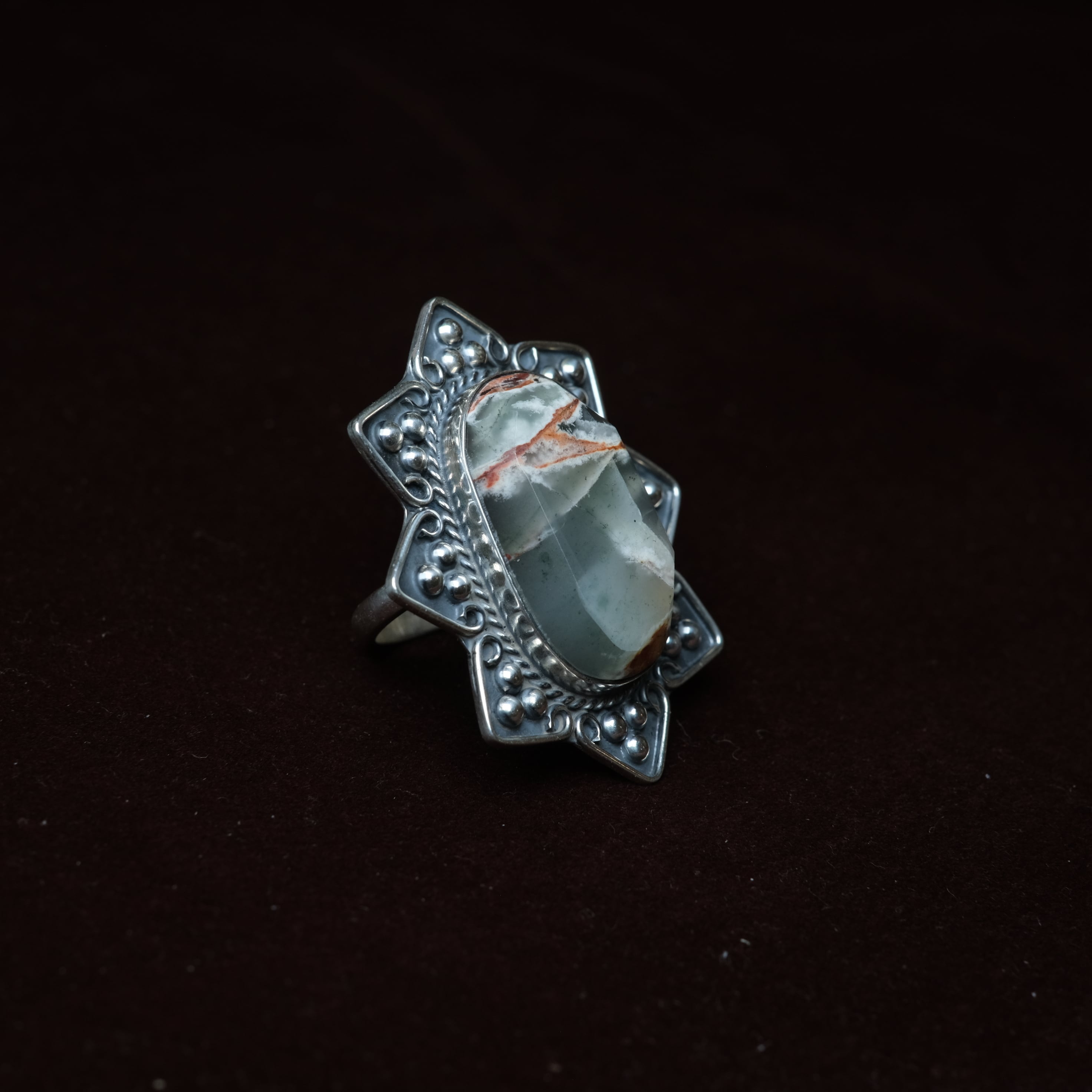 トップには、絵画のような美しさを持つメキシコ・ゲレロ州産の大きなランドスケープアゲートを用い、存在感抜群のシルバーリングとなっております。