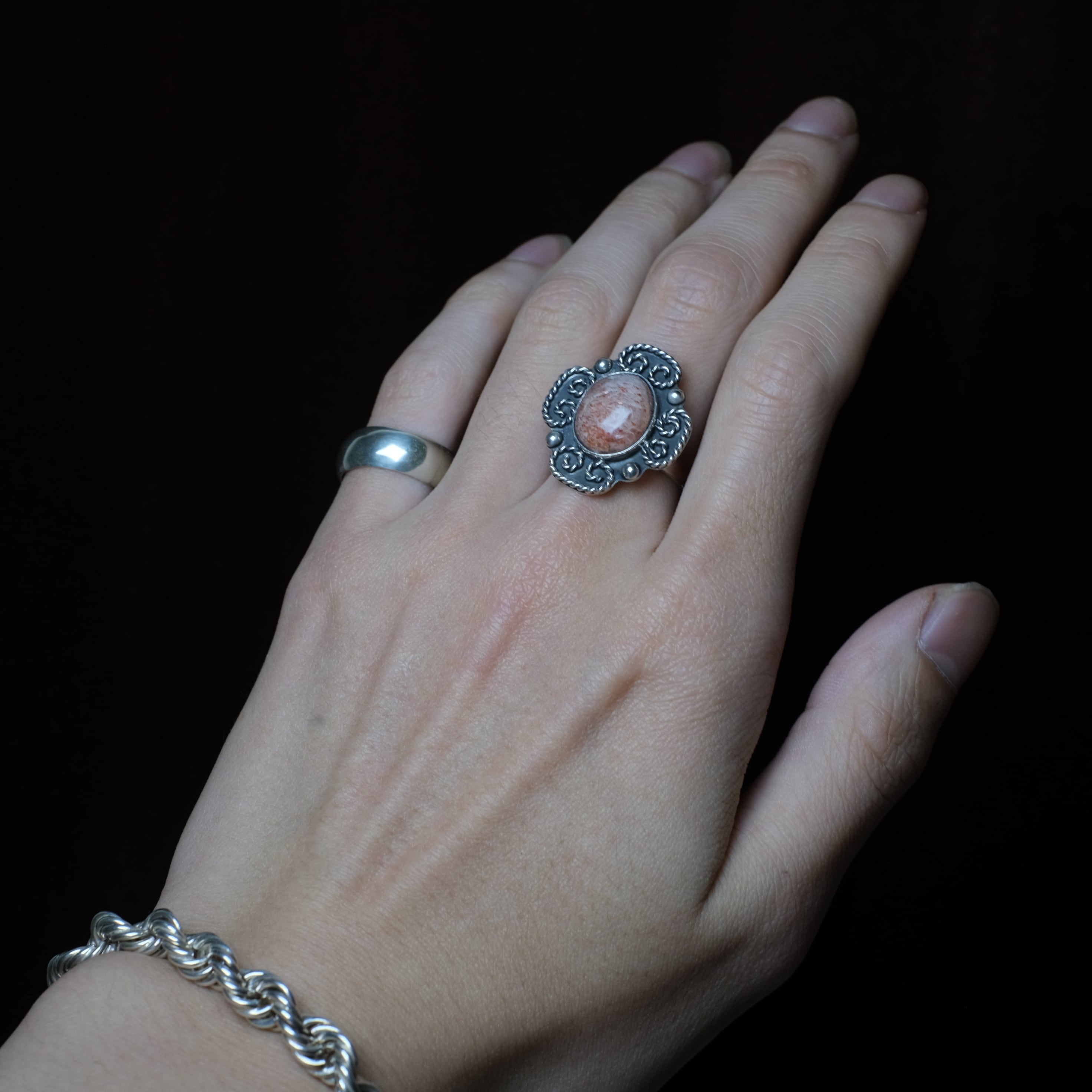 また、ストーン周りの装飾も繊細にデザインされており、黒燻し加工と鮮やかなサンストーンとのギャップも美しい逸品です。