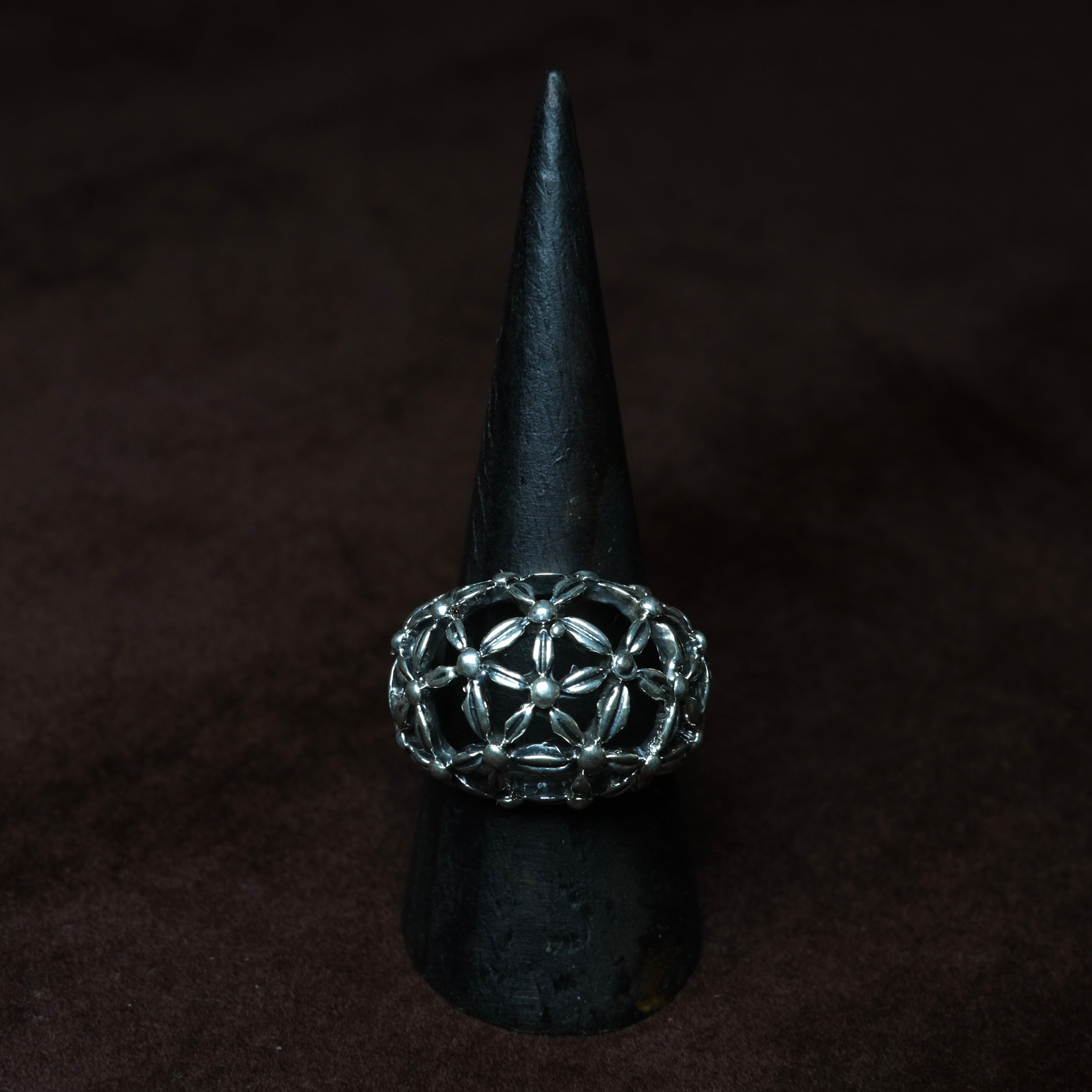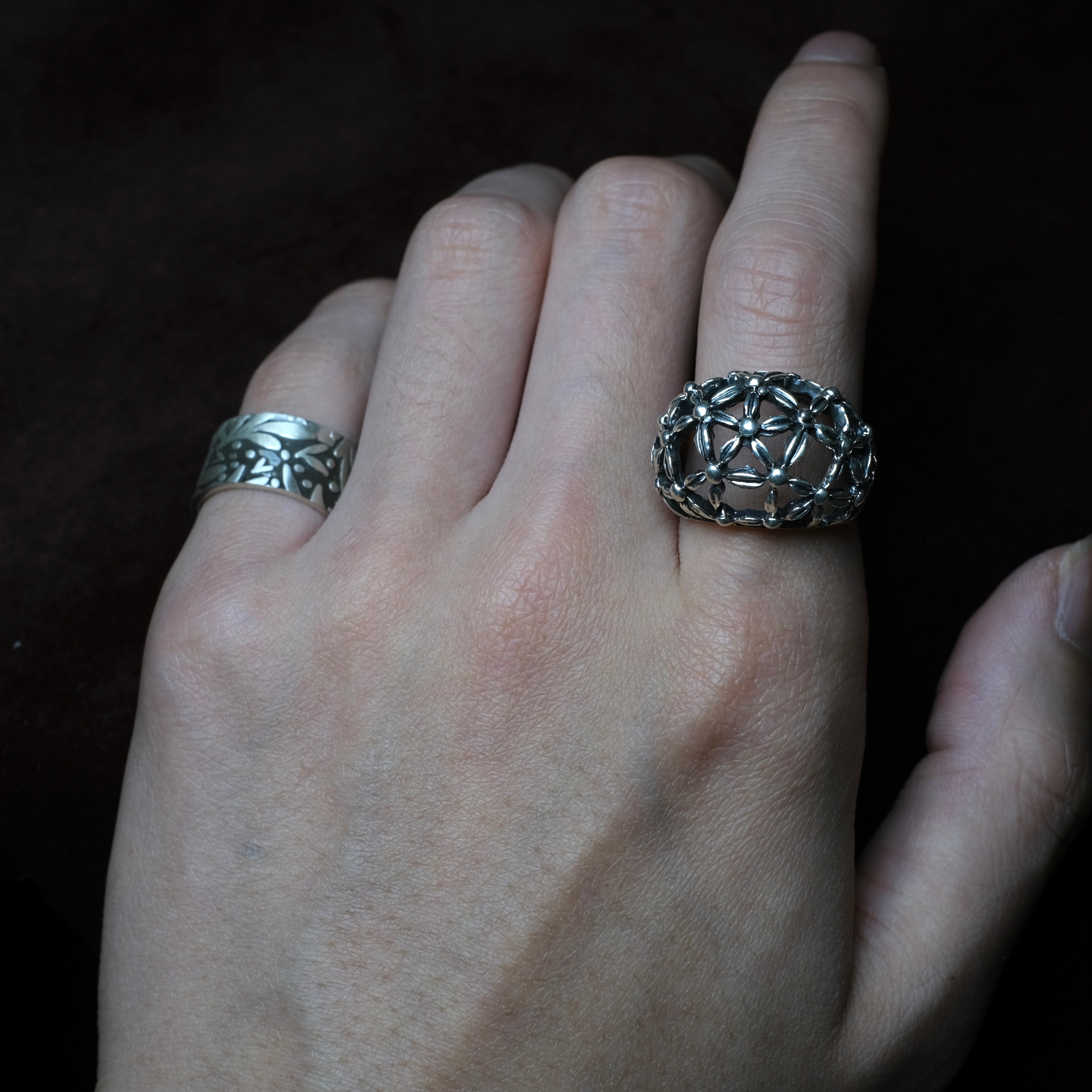 丸みを帯びた、特徴的な形状にフラワーデザインの透かしが効いたシルバーリングになります。