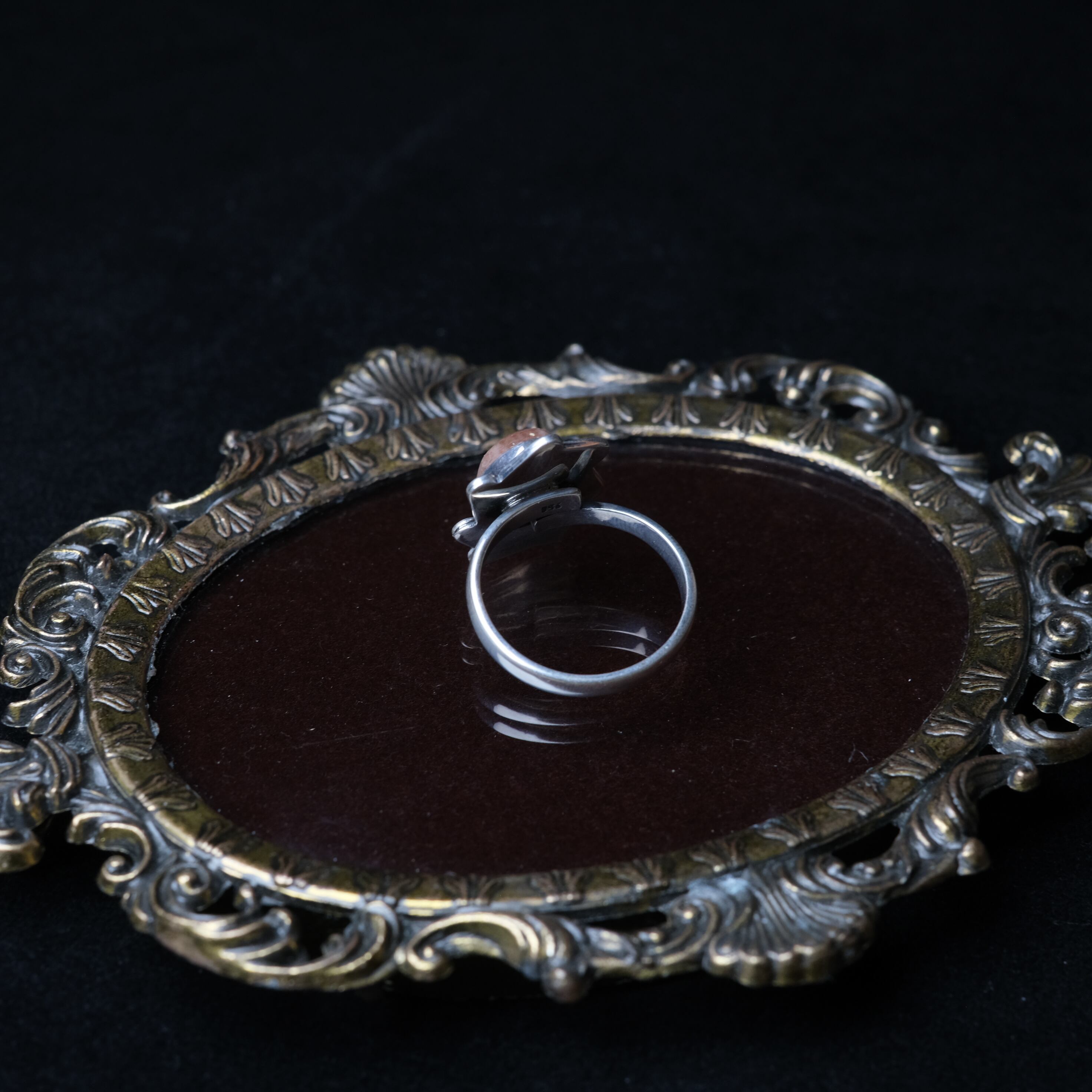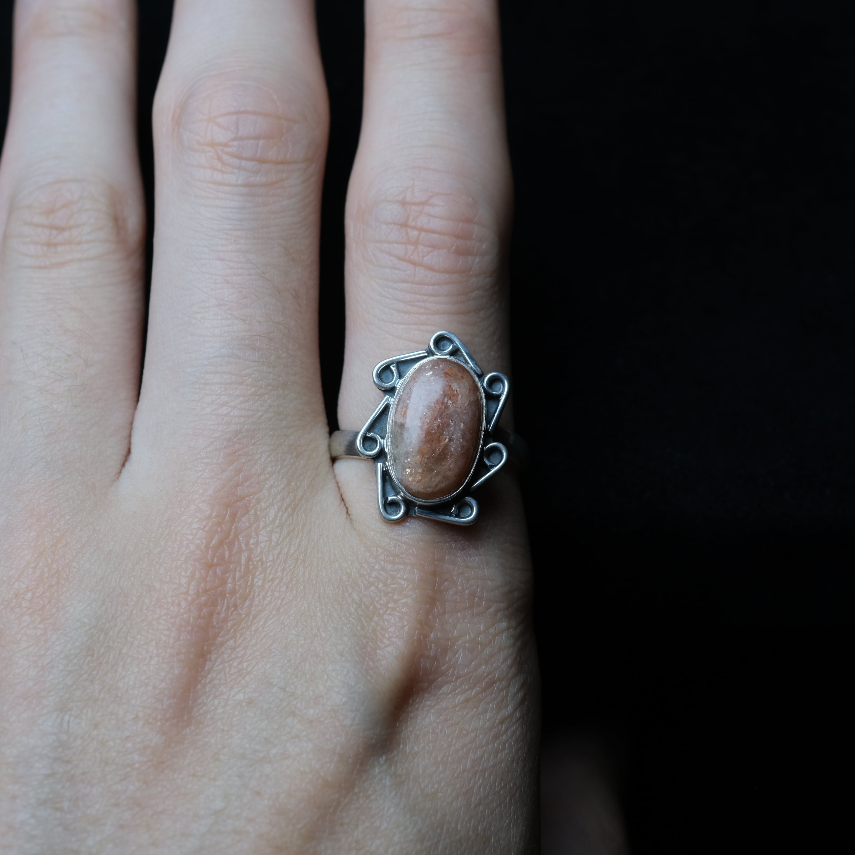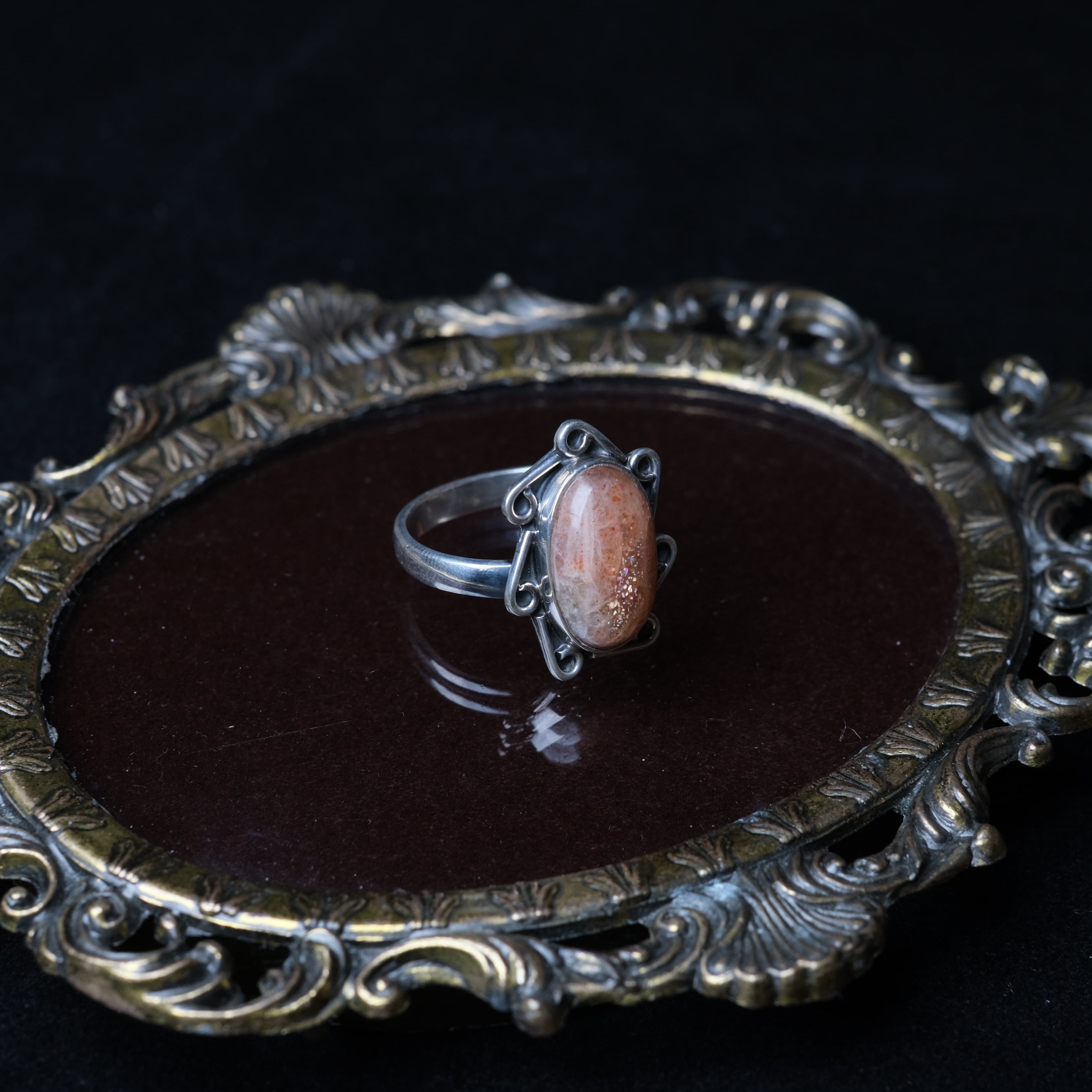 太陽のようにメラメラと輝く、アベンチュレッセンスが特徴的なサンストーンをあしらったシルバーリングです。