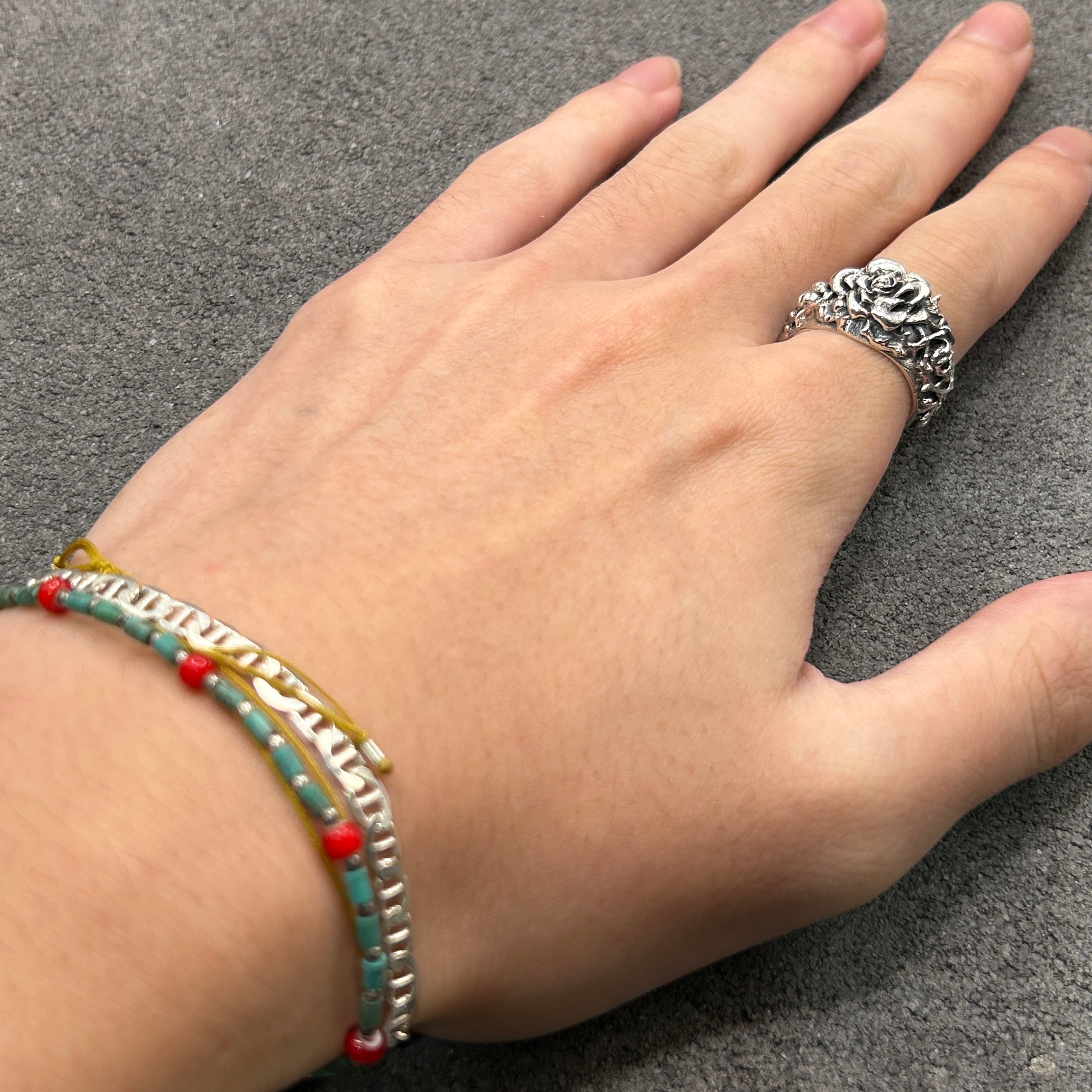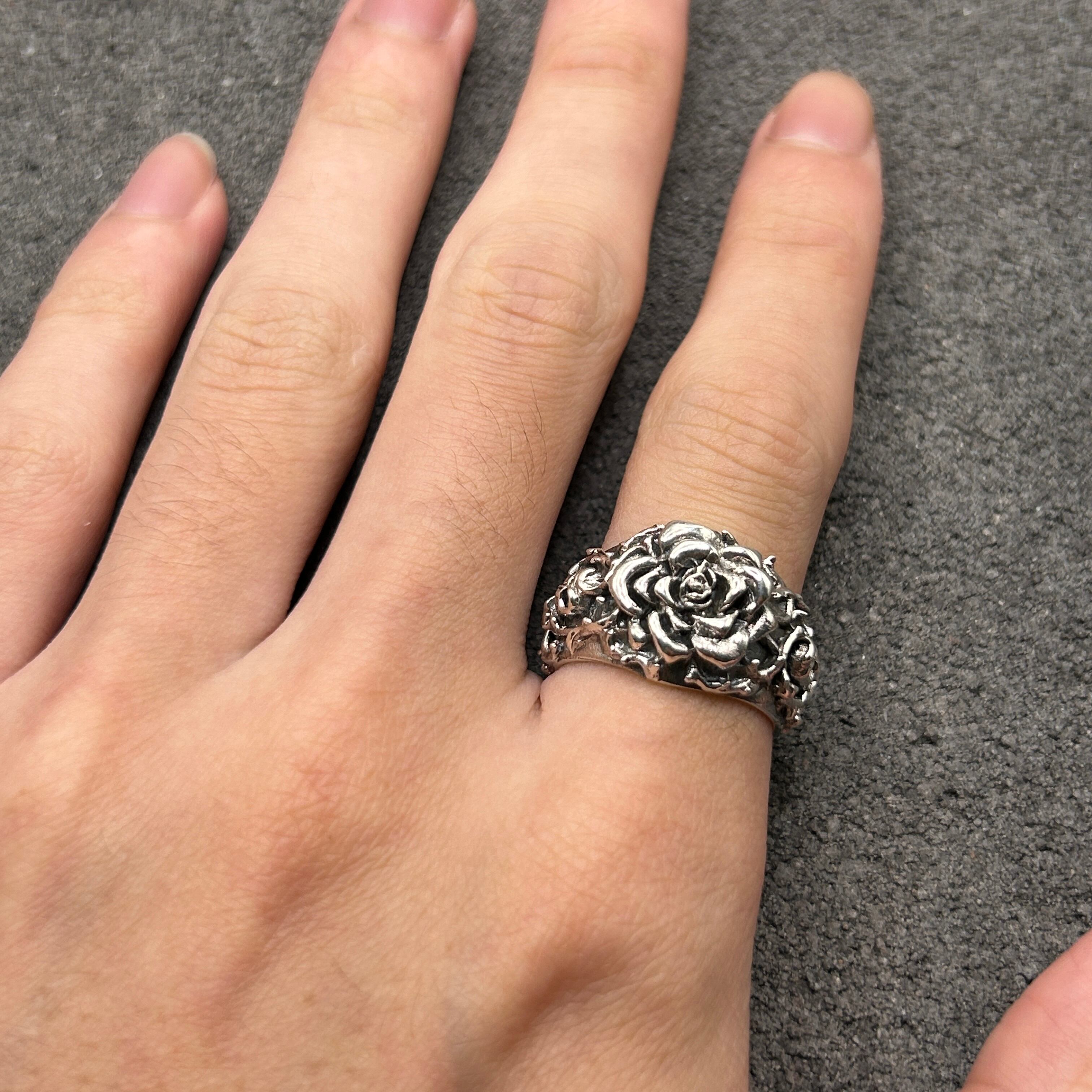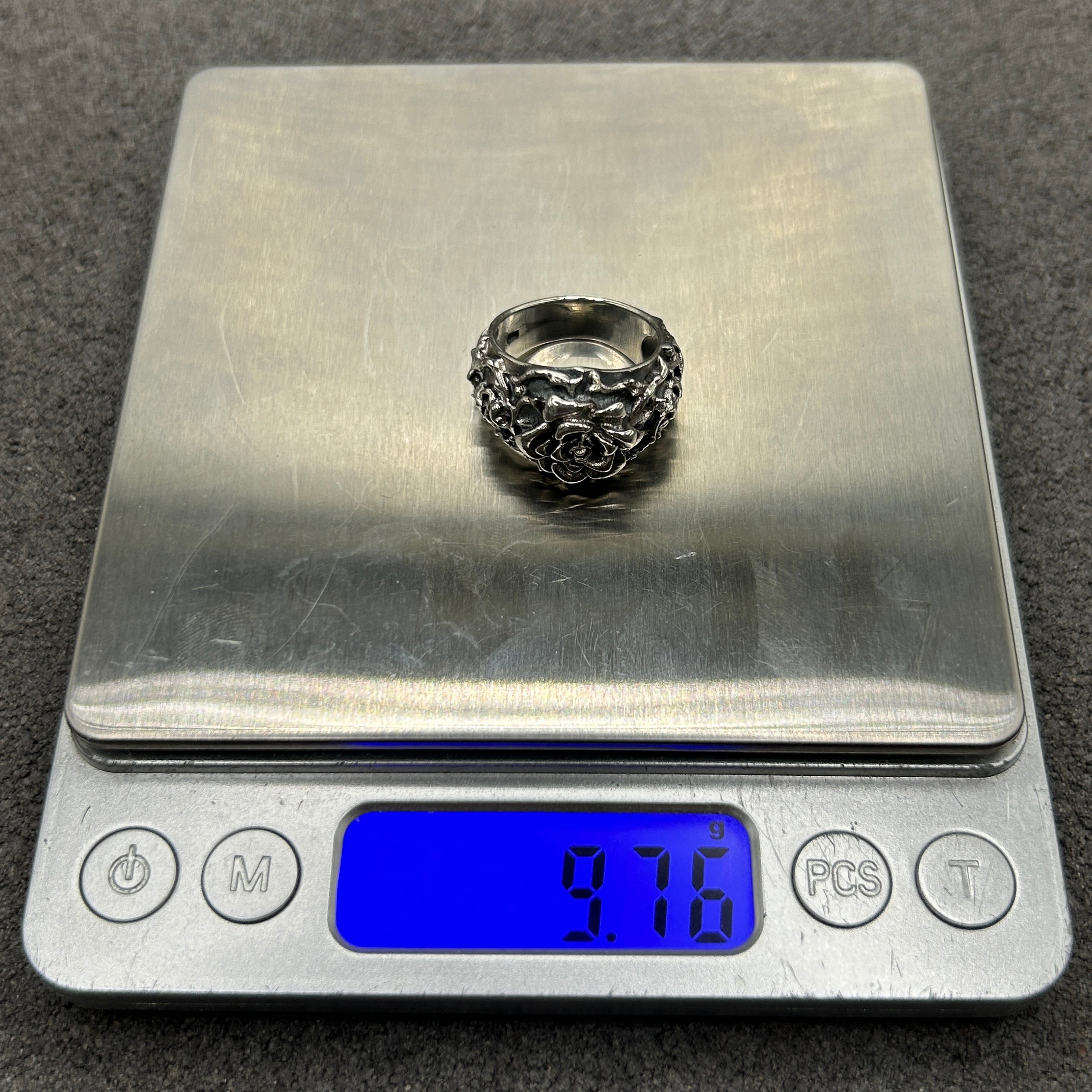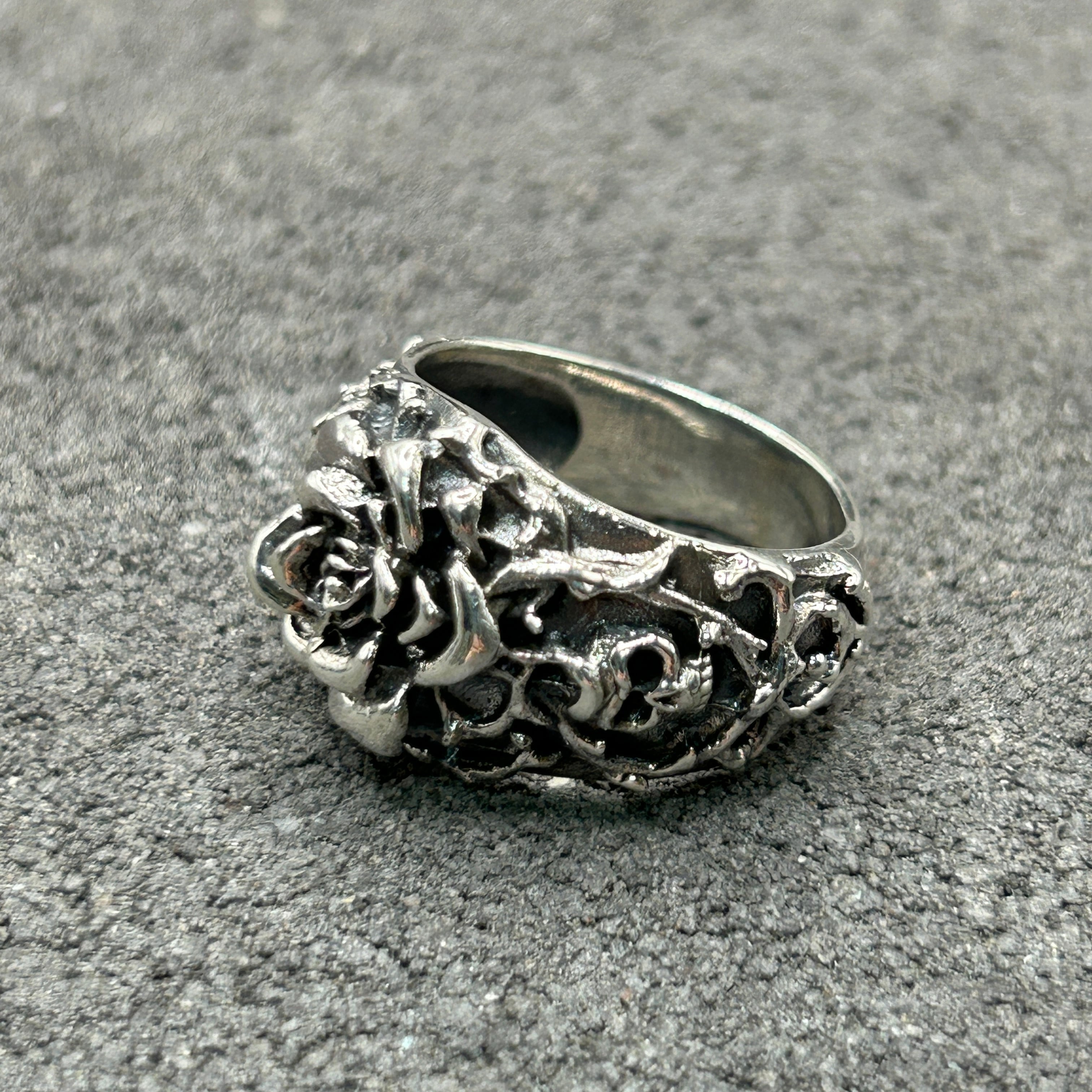 フラワーとスカルが全体的にデザインされた、総柄シルバーリングになります。