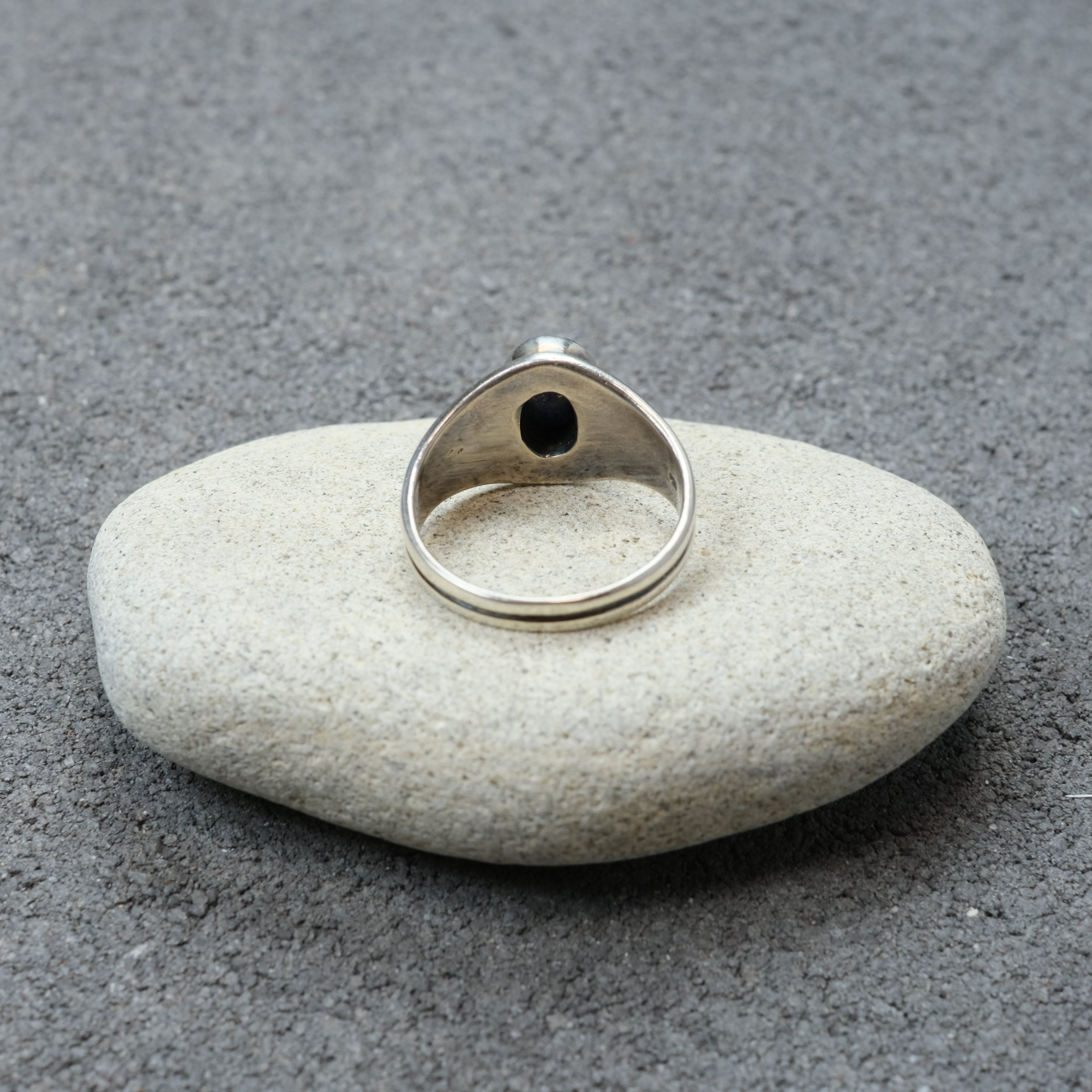 トップにラピスラズリ、そのサイドにはネイティブデザインが装飾されたシルバーリングになります。