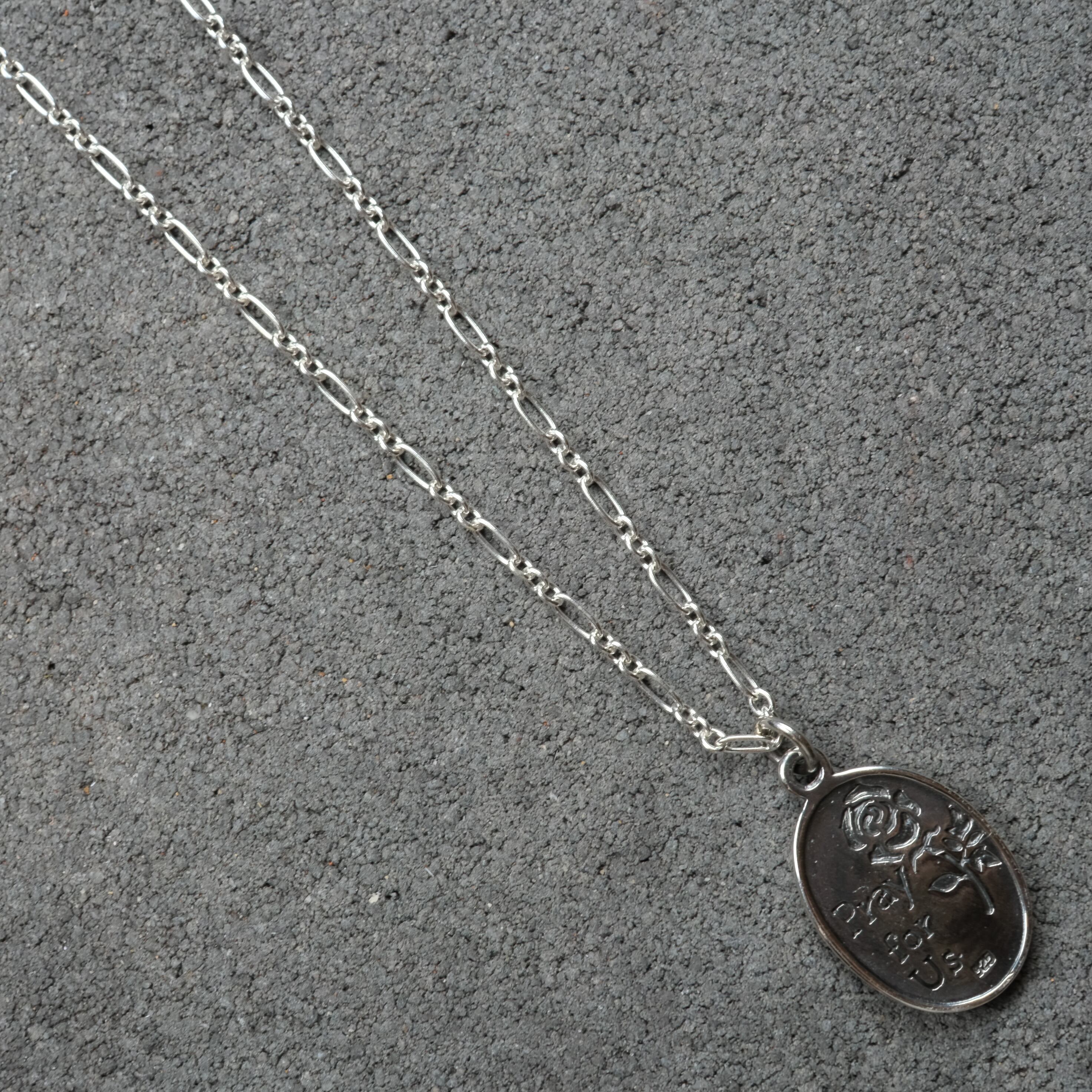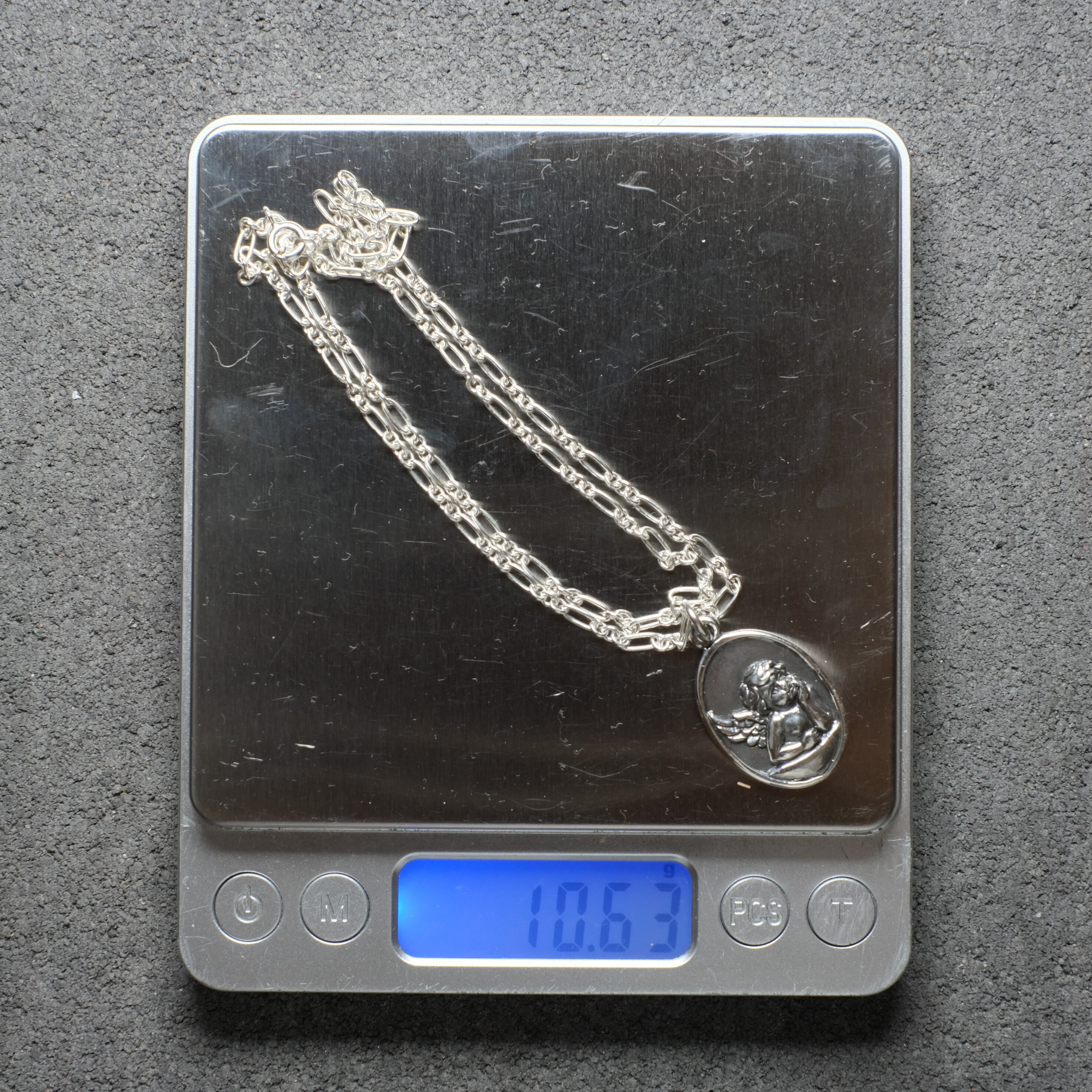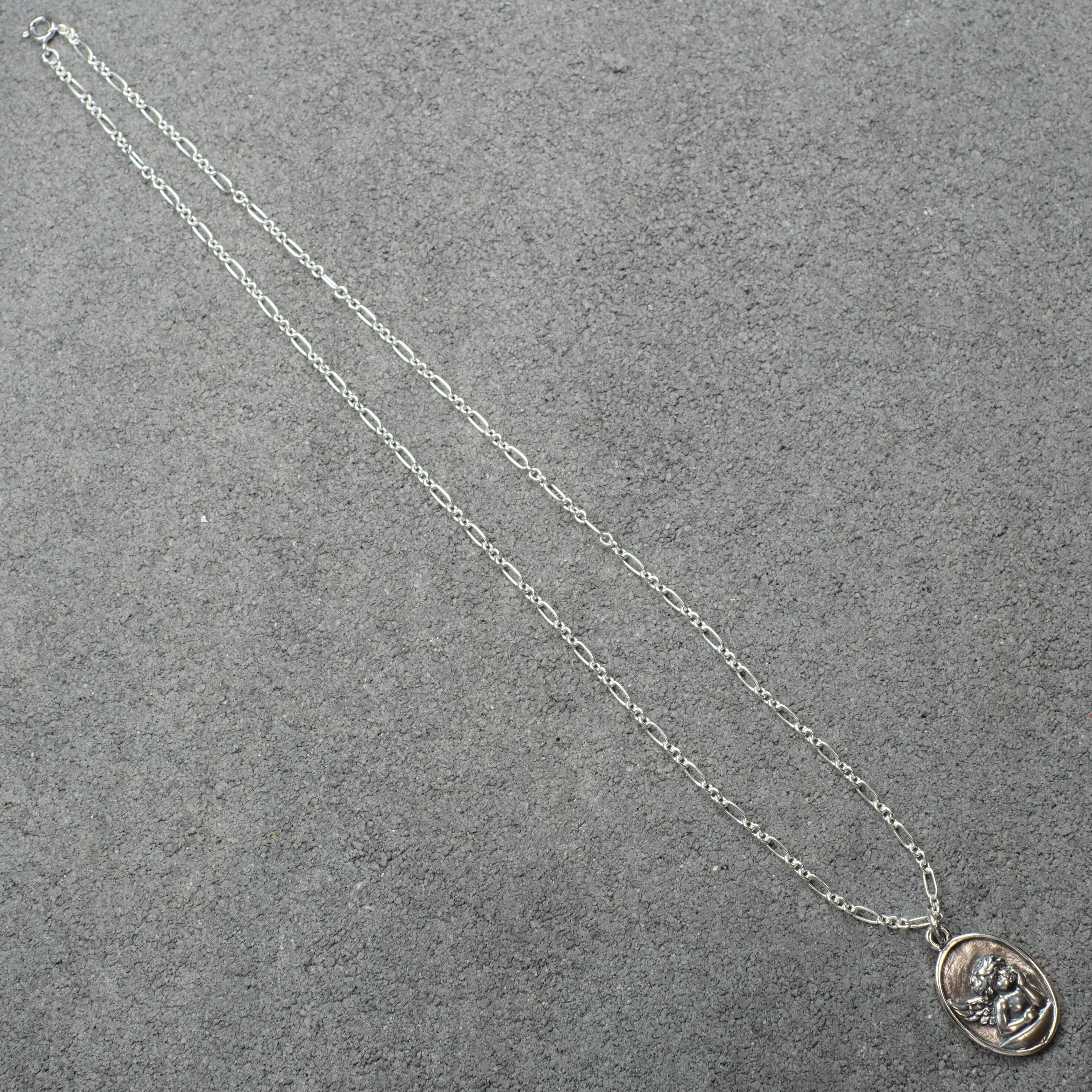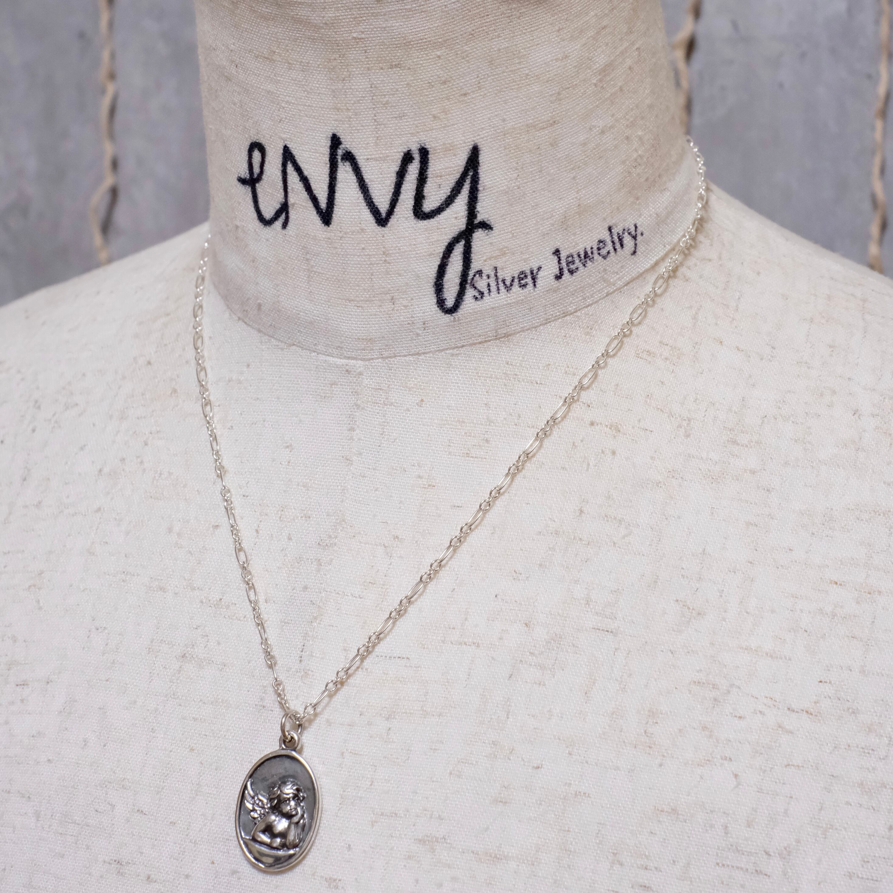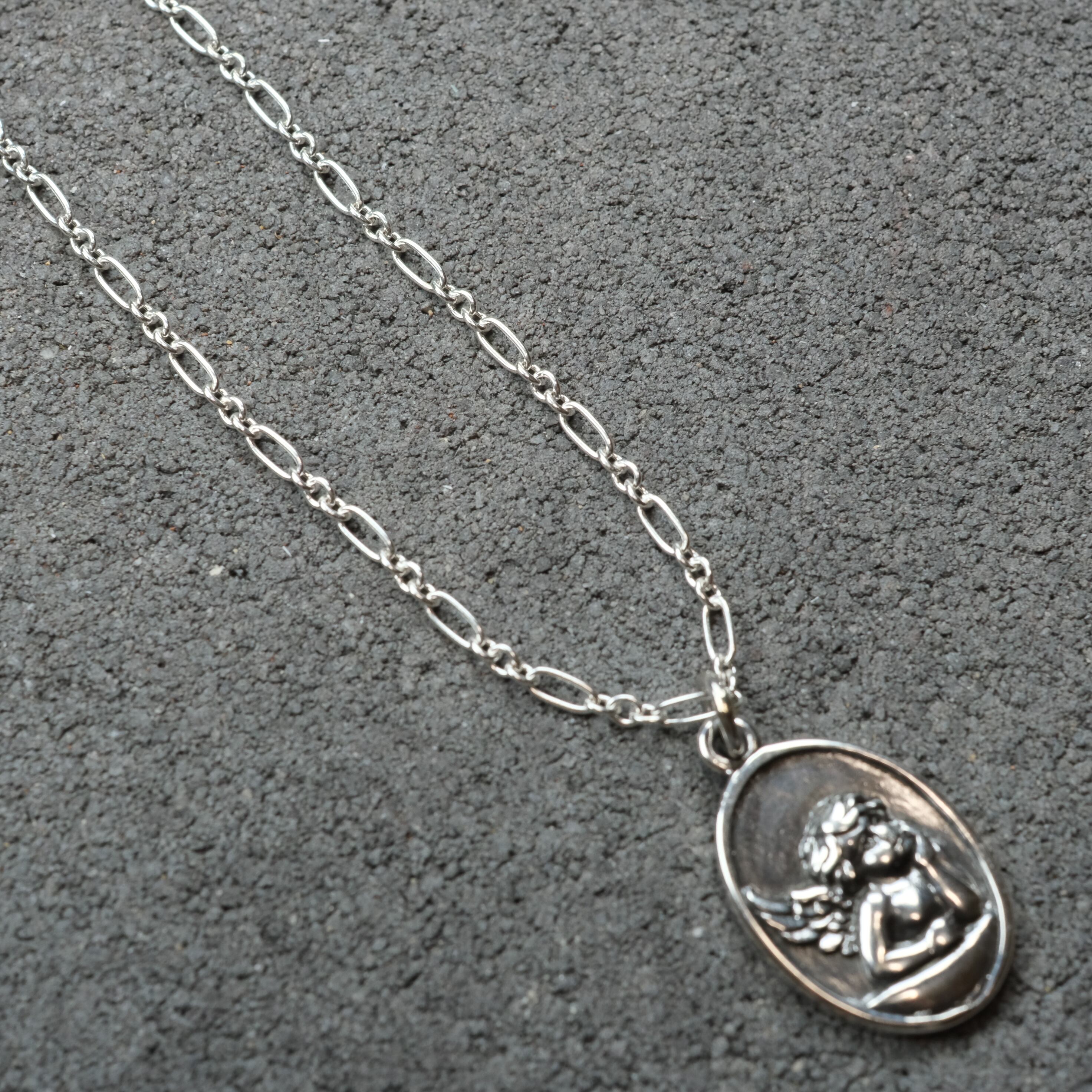 フィガロチェーンに天使のペンダントトップが用いられたシルバーネックレスになります。