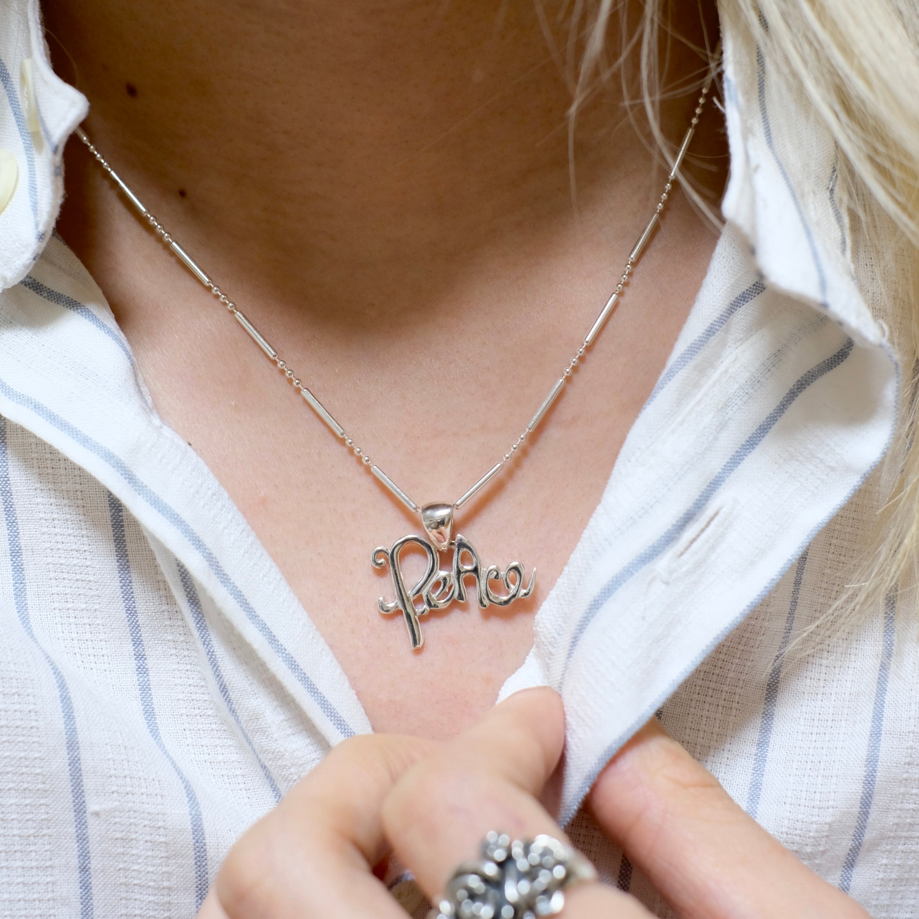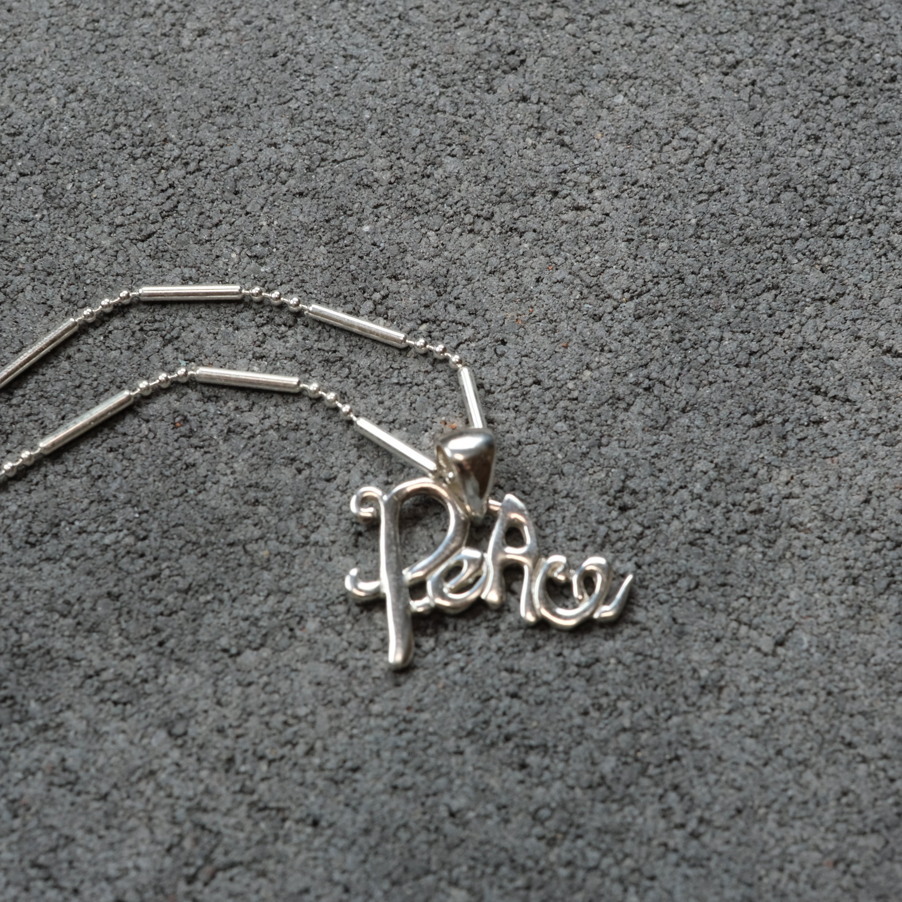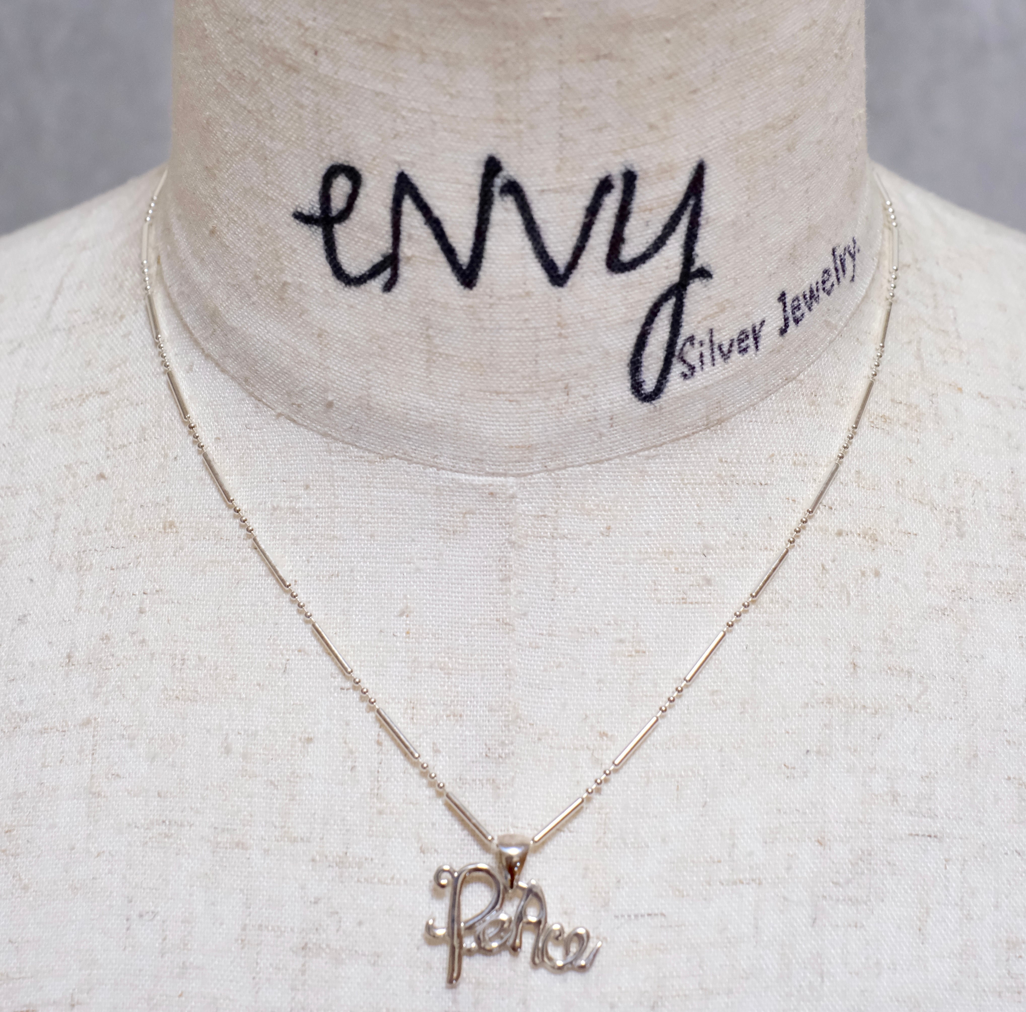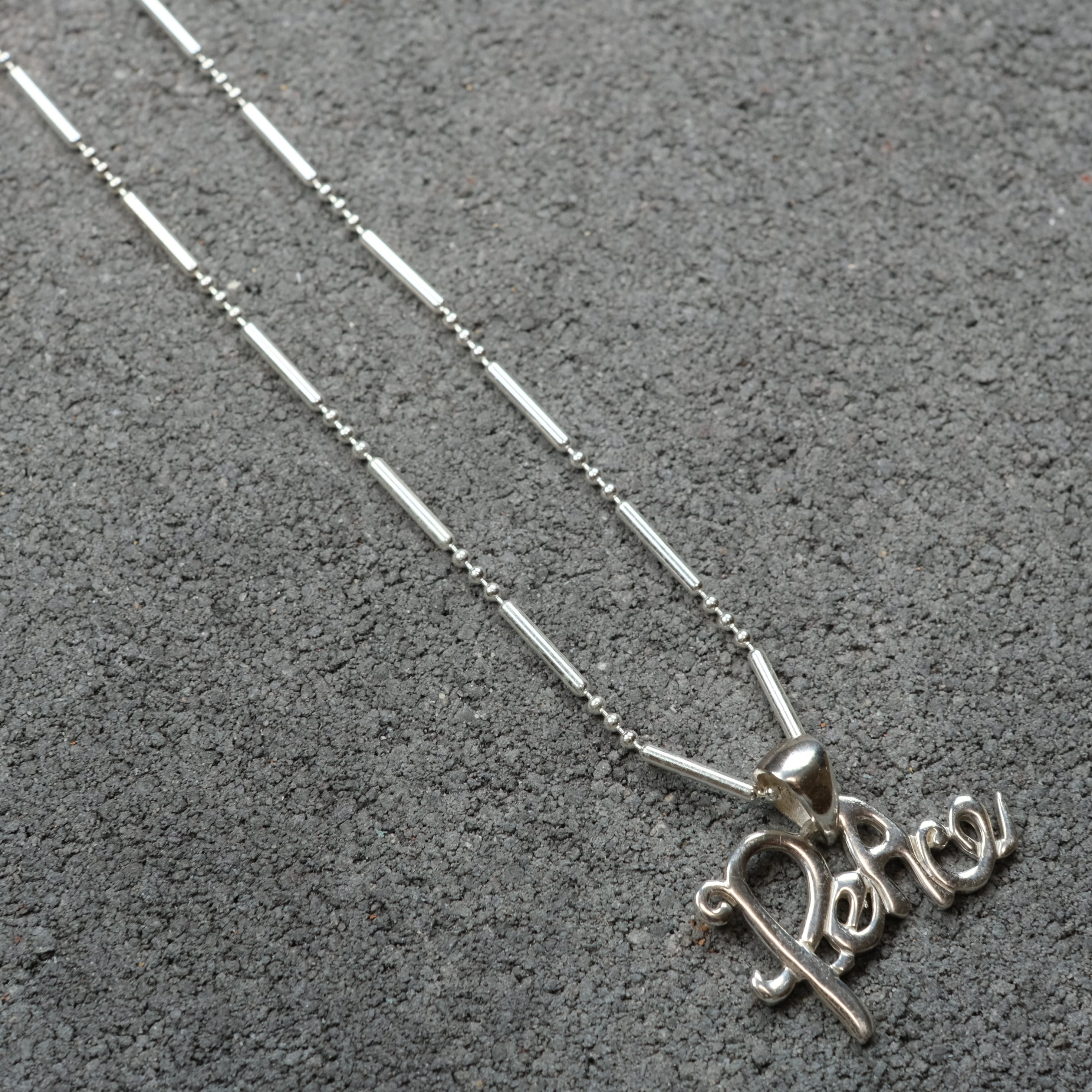 PeAceの文字がペンダントについた、可愛さのあるシルバーネックレスになります。