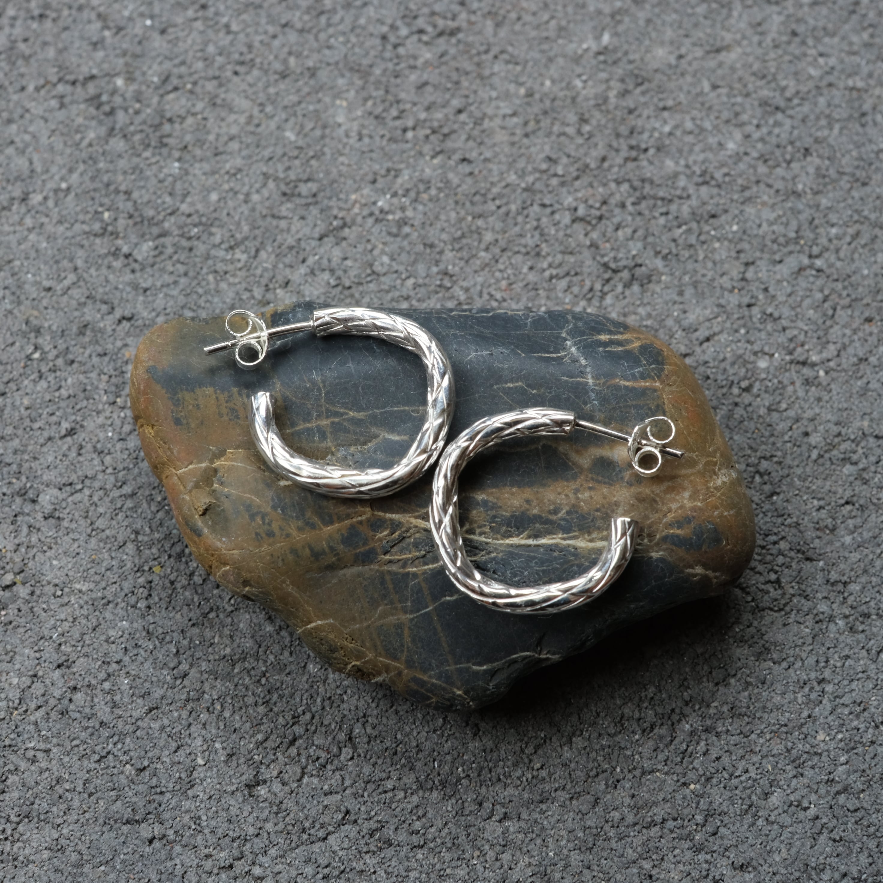 全体的に彫り込みのデザインが入ったフープピアスになります。